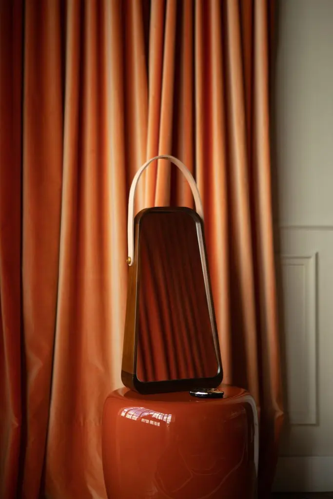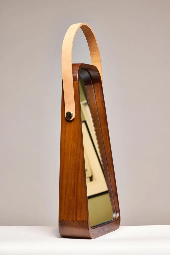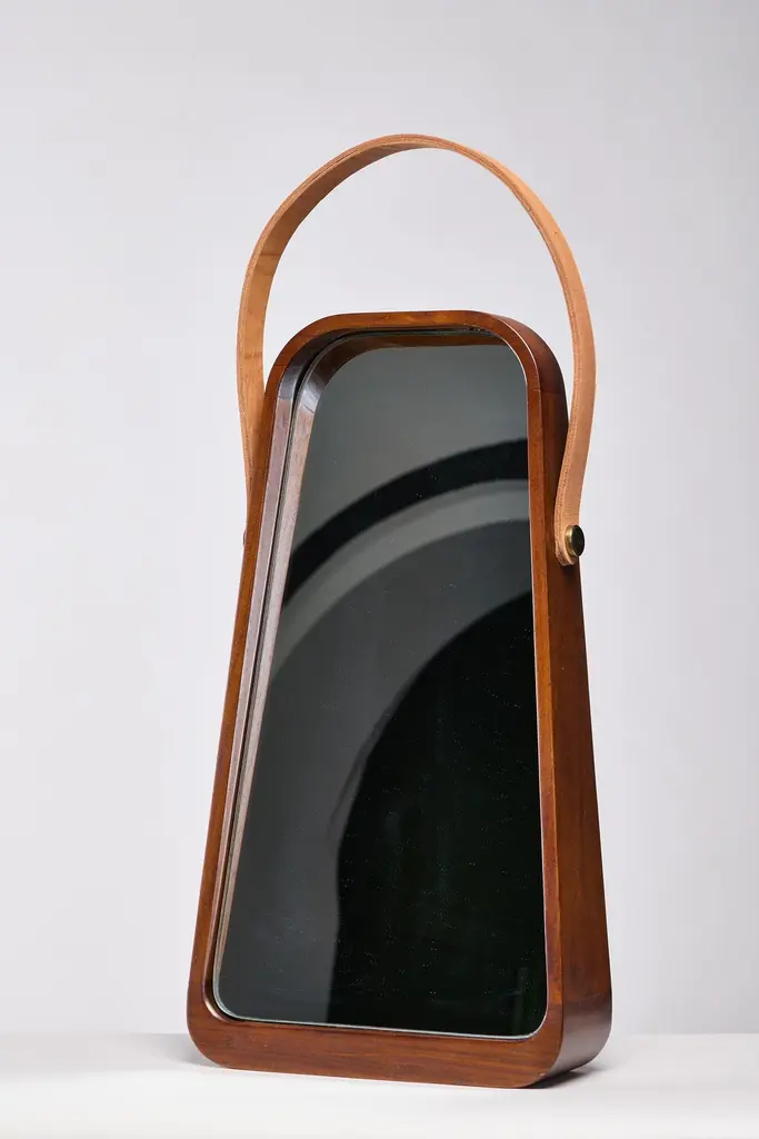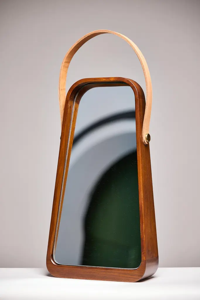 Table mirror. Wood frame and fixed tilted miroir integrated.Teakwood in Natural waterbase finish.Mirror glass 5mm / Mirror anse in natural Leather.Dimensions: 269 x 95/45 x h500 mmThis product is handmade. Each piece is unique, and may vary slightly in color from one object to another. This is what confers its handmade character.