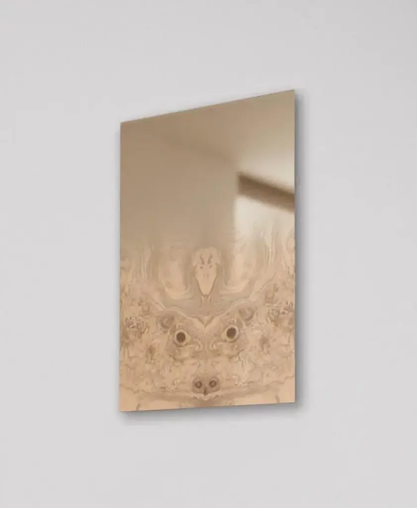 Mirror zero xs fading wood revamp 02 by formaminima limited edition of 200 pieces. Dimensions: d 0,5 x w 21,5 x h 29 cm. Materials: metal sheet structure with flush mount metal brackets, layered walnut burlwood veneer and mirror gradient crystal glass slab. Limited edition of 200 pieces per model, numbered and signed with certificate of authenticity. This product is entirely handcrafted in italy. Colour and textures may slightly differ depending on devices, and remain unique for each creation since the handcrafted features and materials of this object. Also available in different materials, finishes and sizes. Please contact us. The amber-nuanced crystal layer, featuring a mirror gradient, results from an innovative craftsmanship technique and is juxtaposed with a sought-after walnut burlwood veneer. A frameless and sleek appearance highlights the thinness and lightness of this unexpected two-dimensional wall décor composition. Reframing and recollecting the finest 900’s art deco collections, this small format condenses the sophisticated aesthetic of the mirror/zero collection into a one-of-a-kind décor object. Formaminima is an emerging brand within the italian design panorama, prone to exploring the concept of object itself, in the field of lighting and product design in its broadest sense. This exploration starts in the first instance from the tradition, from the artisan mastery and that making full of charm, care, and perseverance. Each project is in fact crafted in those same places where the know-how is handed down and kept for generations, exclusively in our territory. Carefully selected workshops, ateliers, and studios become our precious partners in the creation of every single piece, conceived and designed by us. Therefore, in this latter, multiple knowledge is merged, especially that linked to high-quality materials, production processes, and an innovative aesthetic. Thus to achieve what for us represents a contemporary design sleek poetry. We create value through the masterly realization of unique pieces, as well as minimizing the intermediation between the design product and its audience. Hence our projects result in the outcome of a direct collaboration between our designers and the excellence of italian craftsmanship, along with its valuable know-how. To this end, we believe that a slow design process, together with its time of thought and research, is essential for what we believe good design may be. So this latter, passing from the inspiration to the concrete realization of each of our design creation, arrives directly to the customer.