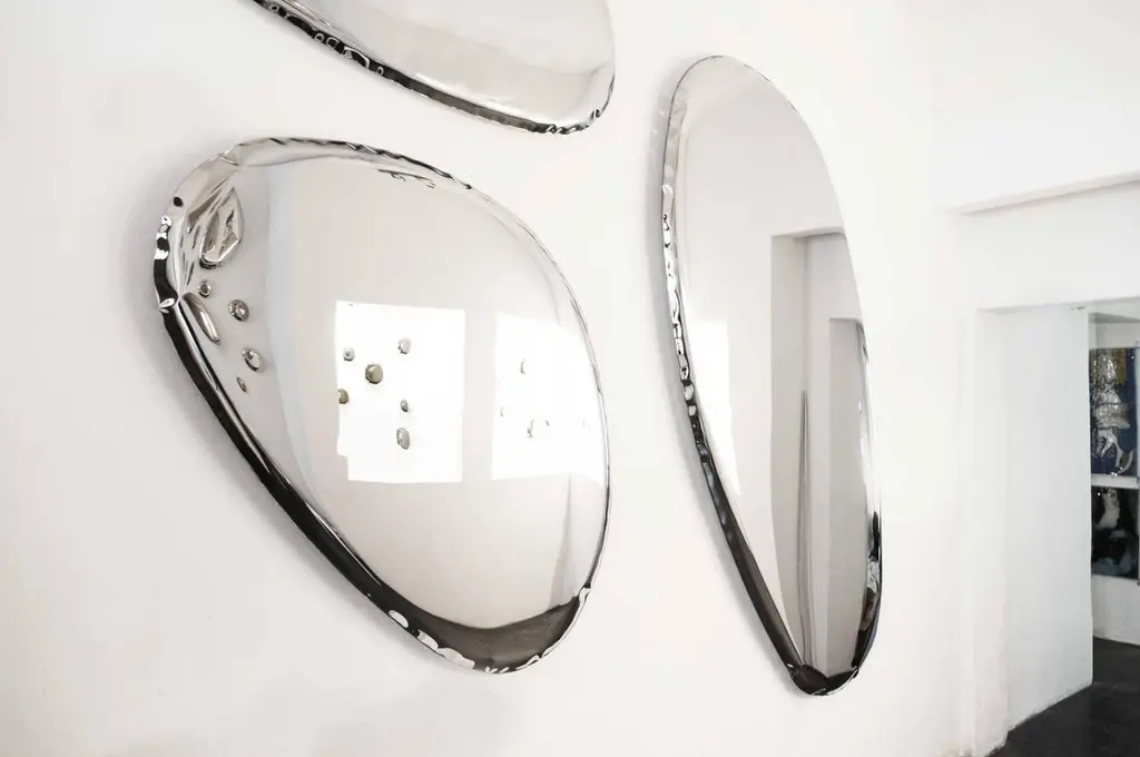 Tafla mirrors by ZietaPolished stainless steelTafla O2Measures: Height: 59.06 in. (150 cm)Width: 38.19 in. (97 cm)Depth: 2.37 in. (6 cm)Tafla O3Measures: Height: 48.82 in. (124 cm)Width: 31.11 in. (79 cm)Depth: 2.37 in. (6 cm) Tafla O4Measures: Height: 48.43 in. (123 cm)Width: 25.2 in. (64 cm)Depth: 2.37 in. (6 cm)Tafla O5Measures: Height: 23.63 in. (60 cm)Width: 15.75 in. (40 cm)Depth: 2.37 in. (6 cm).Tafla O6Measures: Height: 21.66 in. (55 cm)Width: 19.69 in. (50 cm)Depth: 2.37 in. (6 cm).
