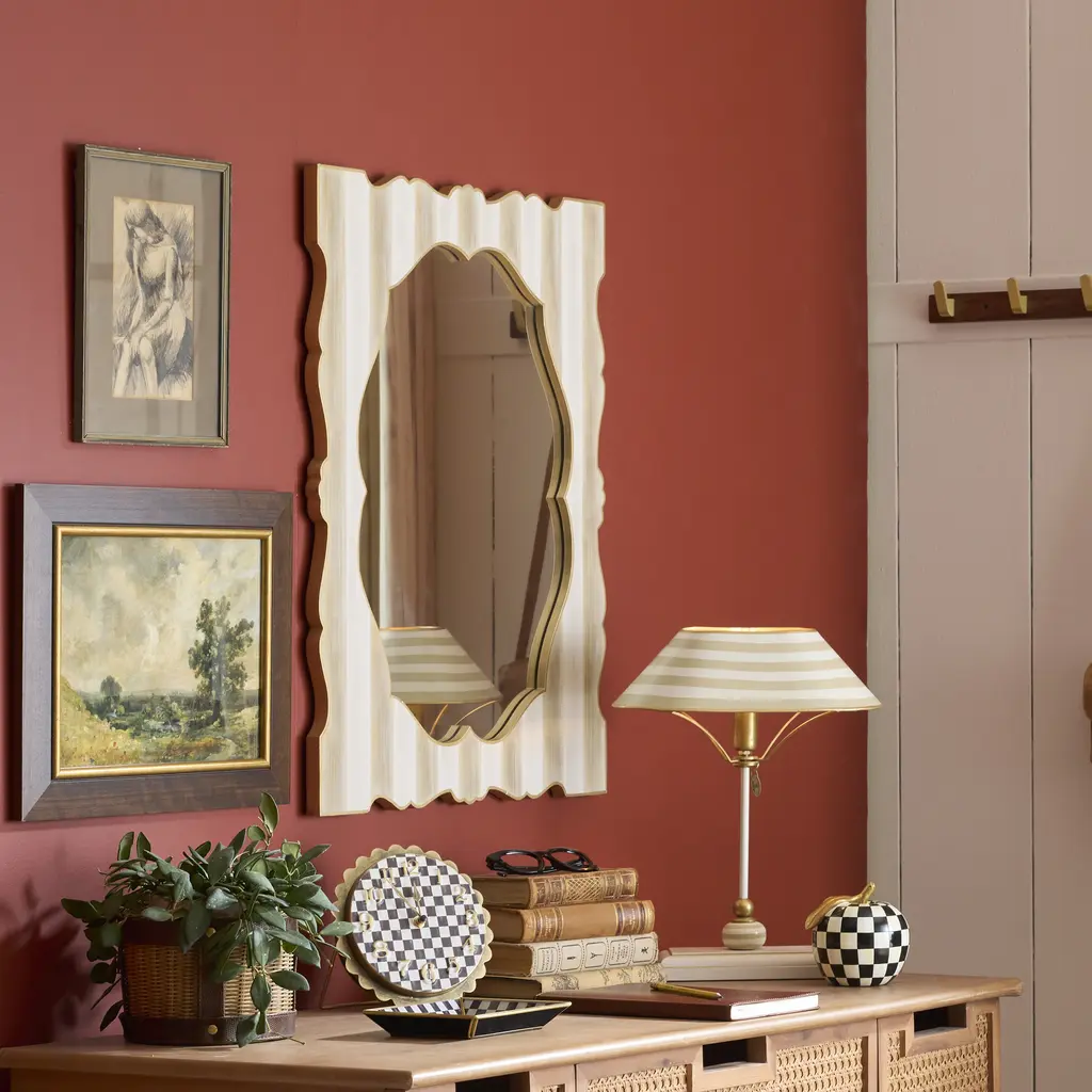 With one glance, you'll fall in love with the soft, espresso-inspired shades on this hand-painted Mocha Stripe Wall Mirror. Not just a reflection, but a statement piece for your home, this mirror would be stunning hung up in an entryway, guest bathroom, and anywhere else that needs a little shine.