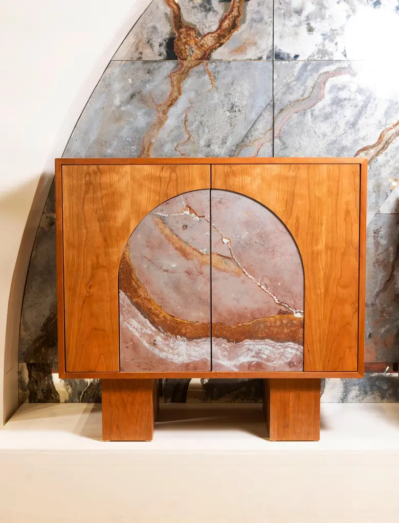 Basilica 2-door sideboard, handcrafted glass and golden cherry by Ercole Home. This new bespoke sideboard design by Ercole Home is available today for your bedrooms or living space.Timeless pieces with high craftsmanship, an organic combination of natural tones. The hand painted eglomise glass is embedded into carved out elegant golden cherry wood. Part of the Palazzo collection, the latest edition to Ercole Home and reminiscent of our founder's Italian upbringing.Color glass and wood can change.Made in Brooklyn, NY.
