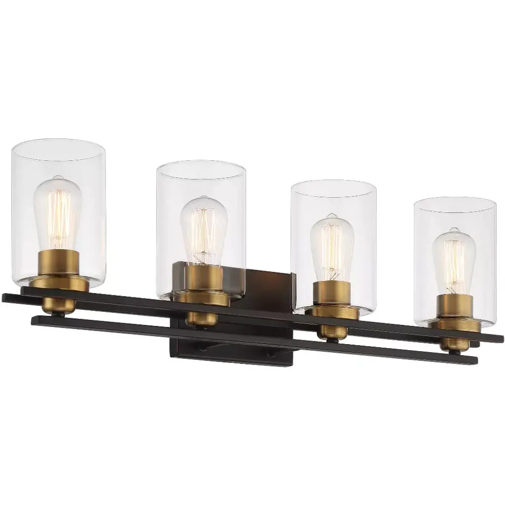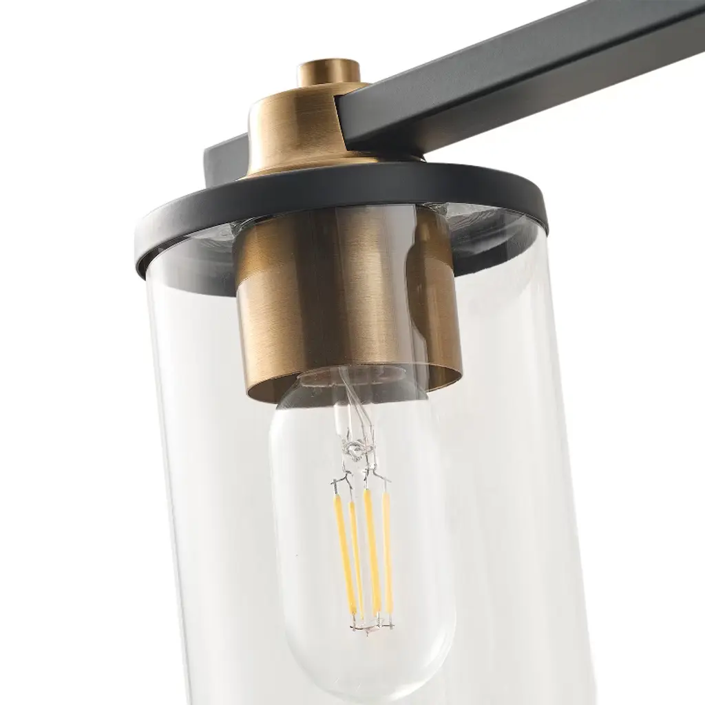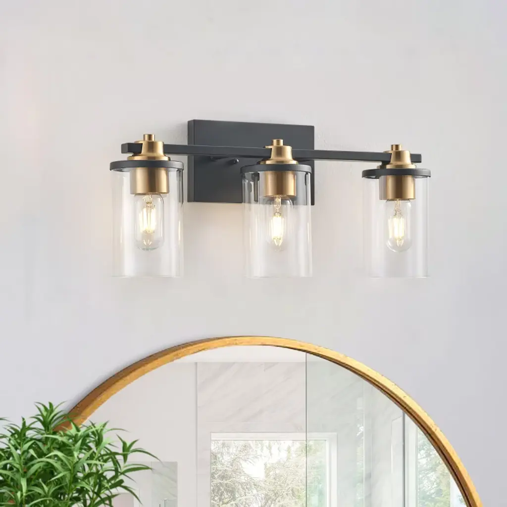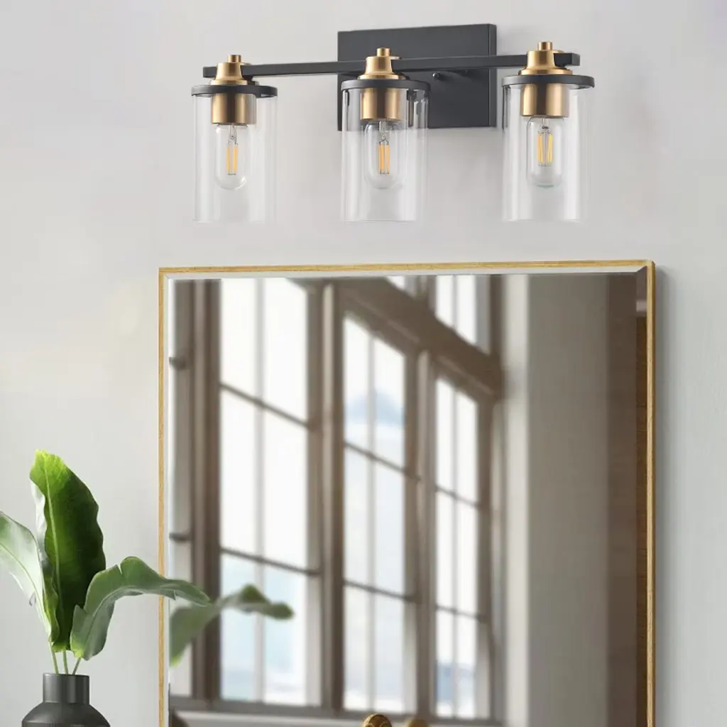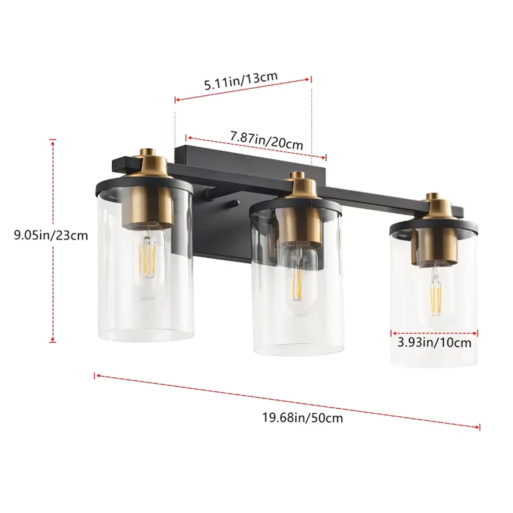 Bring a touch of modern elegance to your bathroom with this 3-light vanity fixture. Featuring a matte black iron frame with sophisticated brass accents and durable explosion-proof clear glass shades, this light offers both style and safety. Designed for flexible installation, it can be mounted facing up or down to fit your space perfectly. ETL certified for quality and reliability, this fixture is ideal for bathroom vanities, hallways, or over-mirror lighting, adding bright, contemporary charm to any décor.