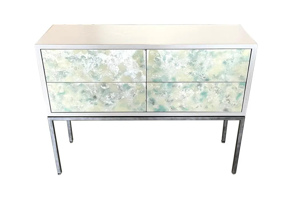 The églomisé chest of drawer / Console by Ercole Home has a 4-drawer front with a morning gray finish on oak. Hand painted églomisé glass panels are on the surface of each drawer in our custom made celadon dust finish. Drawers with self-closing hardware and touch latch to open. The modern metal base has a pewter finish.Custom sizes and finishes are available. Made in New York City.