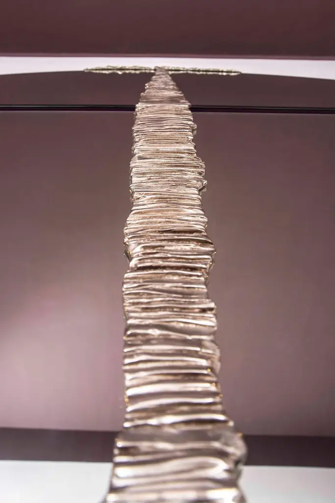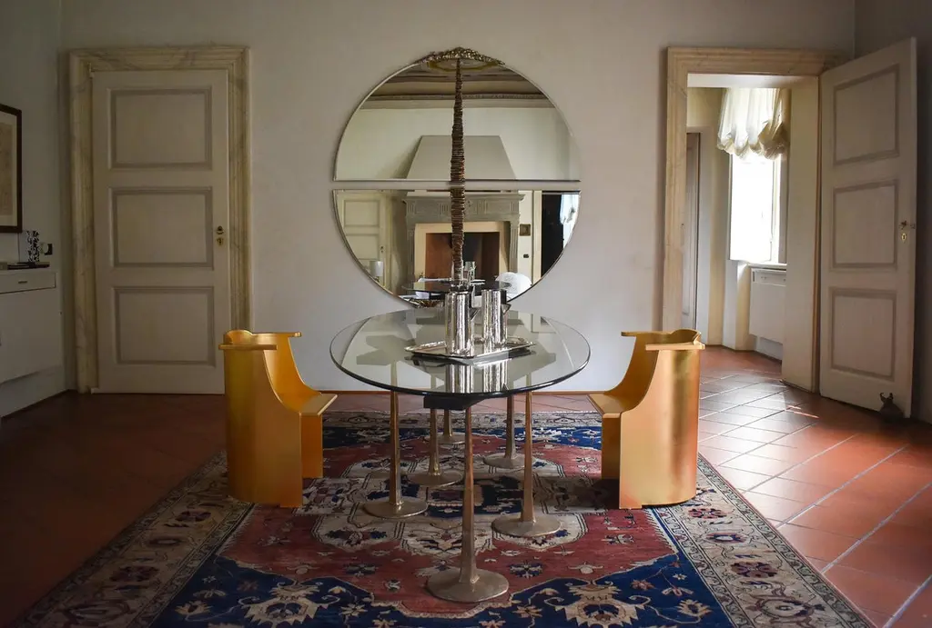 Round mirror with intervention in chromed bronze casting for Dilmos Milano. The merged element depicts a perspective road that ends in a village.Signed by the designer.Size:Diameter cm 180.