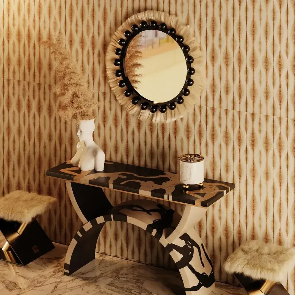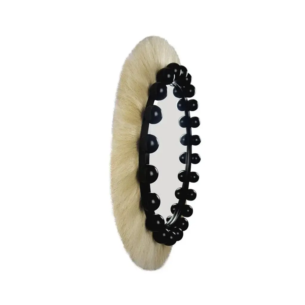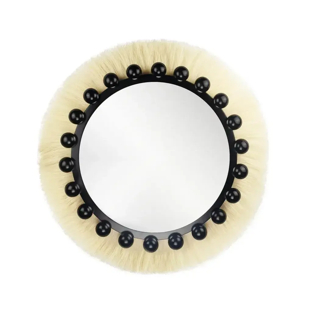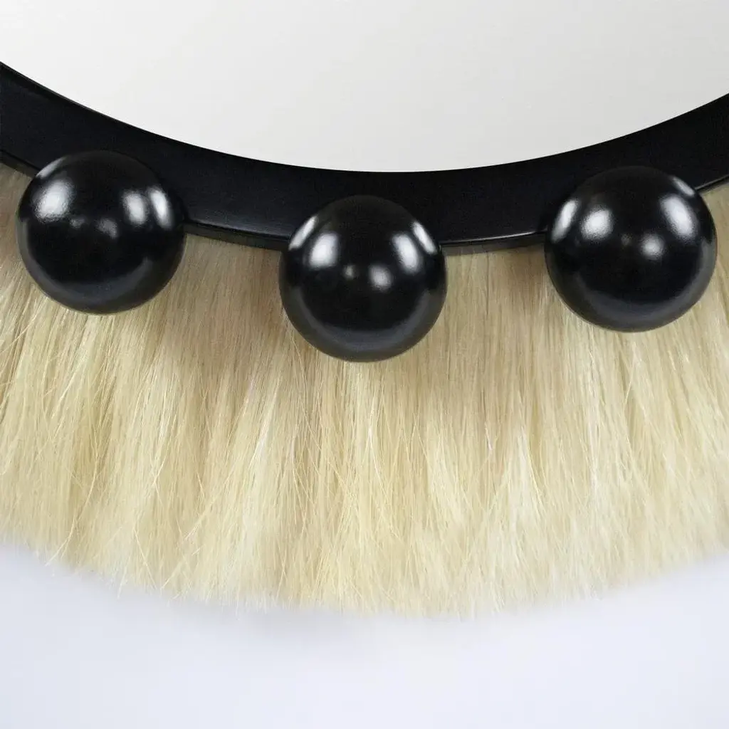 Ibiza is an eye-catching wall mirror perfect for a modern design decor. The hanging mirror is inspired by the raw and timeless textures of the tribes’ decorations, jewels, and artistic elements. This decorative round mirror is made of lacquered wood in the structure and ornamented with natural fiber. A stylish mirror that can be used in the dining room, bathroom, or in the reading corner. MATERIALS:Clear Mirror; Body in Gloss Black Lacquer; Details in Natural Fiber. This piece has an attribution mark, I am sure that it is completely authentic and take full responsibility for any authenticity issues arising from misattribution
