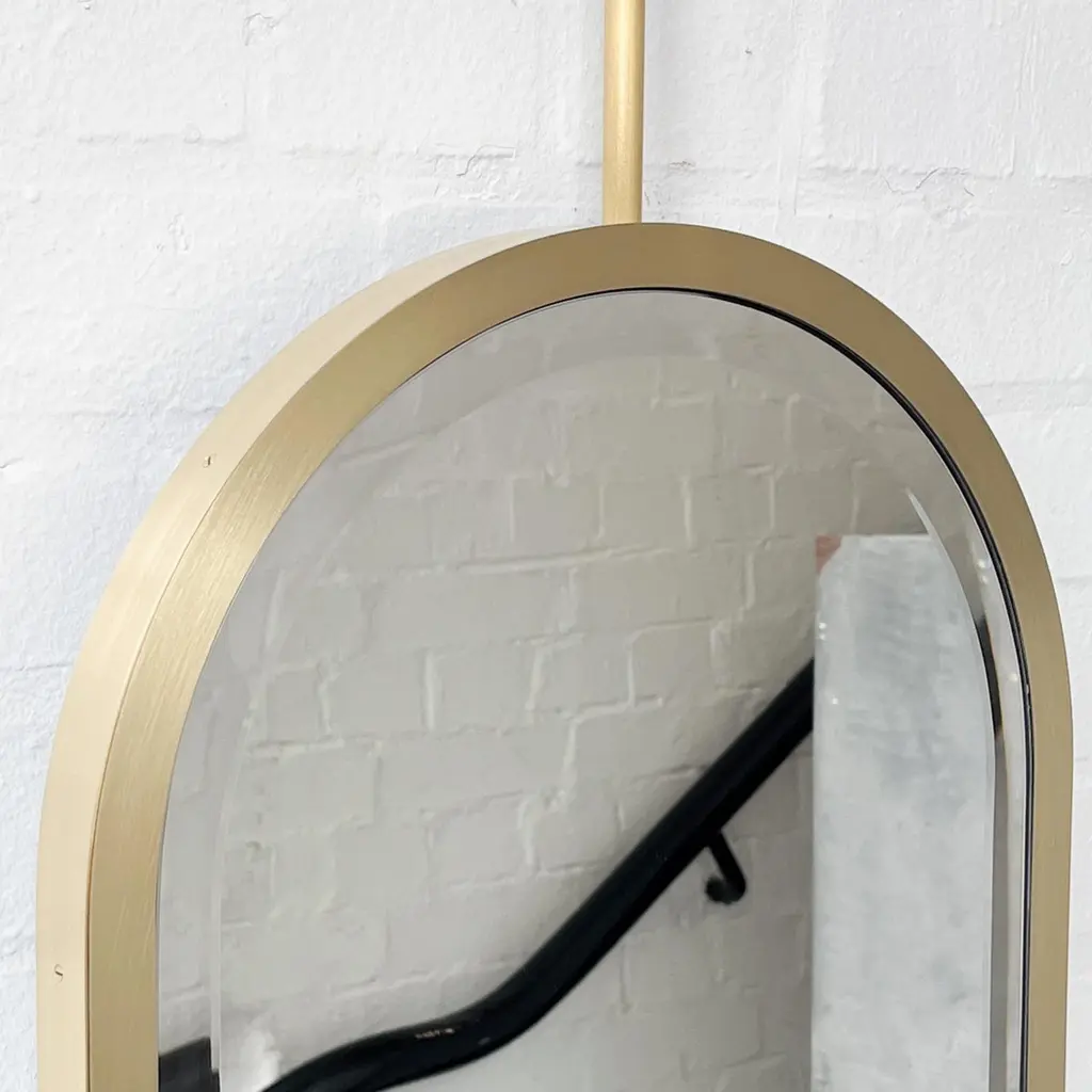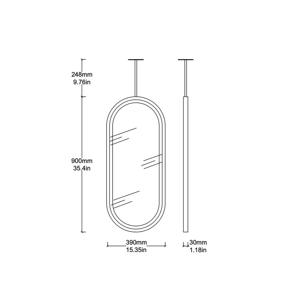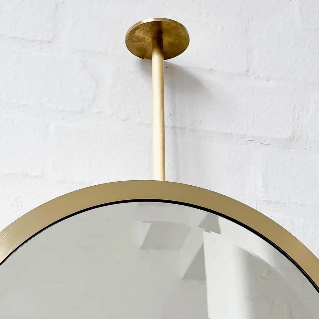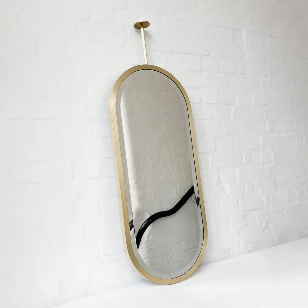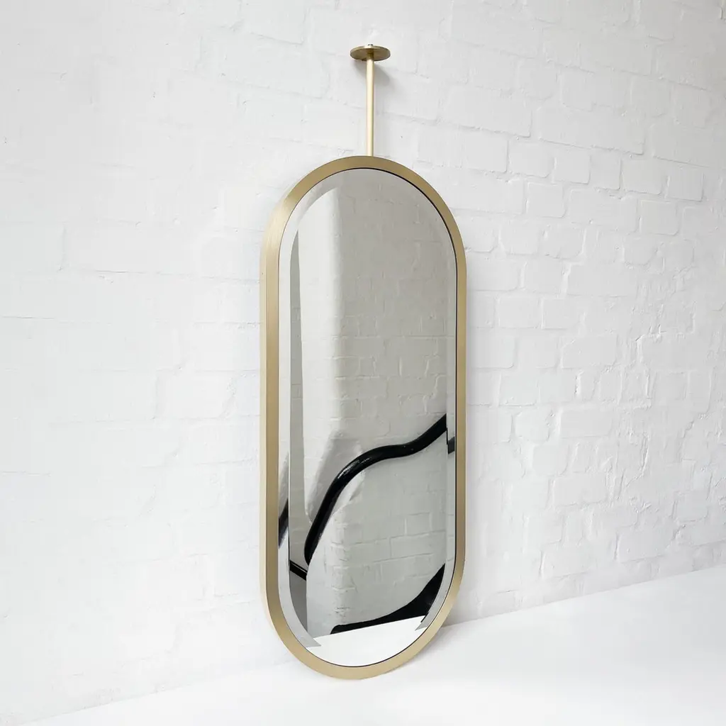 Contemporary ceiling suspended Capsula™ pill shaped mirror with a bevel and a handcrafted brushed brass full frame.Dimensions (customisable):39cm W x 90cm H x 3cm D / 15.3in W x 35.43in H x 1.18in DDrop 24.8 cm / 9.7 inThe mirror is illustrated with a 24.8 cm (9.7 in) but it can be made in a bespoke length. Please contact our team for further information.Our unique collections of ceiling suspended mirrors are designed and handcrafted in London, UK, and are therefore fully customisable to suit the specific requirements of your interior.The high quality finish of our suspended mirrors extends to their backings, which are made from a powder coated panel available in black or white. Backings can also be upgraded to a finish that matches the frame or they can be substituted by a second mirror, making your mirror double sided.The ceiling plate is supplied with a cover hiding the screws to complete the minimalist design of the mirror.Shipped safely and insured worldwide. All our mirrors are made on demand. Fabrication lead time for this mirror is approximately 6 to 7 weeks. Our mirrors are always shipped by courier express. Shipping via courier express typically requires 1 to 2 days to the UK, or 2 to 7 days outside the UK depending on the destination.Ceiling suspended mirrors are the perfect solution when:•a mirror cannot hang from the wall.•it is used in front of a window.•it is used in the middle of a room and may need to be double sided.•or just as a special and unique design focal point.Available options:•double sided mirror•backing in a finish that matches the frame•frame finishes: brass (brushed, polished or with a bronze patina), copper, stainless steel, blackened metal, powder coated aluminium in a range of standard or bespoke colours•full frame that extends to the front of the mirror•mirror tints: standard silver, black, bronze, blue, rose gold / peach•back-illumination creating a halo effect•front-illumination around the periphery of the mirror•ON/OFF sensor switch•demister pad•bevelA presentation illustrating the options above is also available on demand. Please contact us for a quote for any bespoke specification or added options.IMPORTANT NOTES:-This suspended mirror is intended to be mounted onto the ceiling and cannot be installed onto a countertop. Countertop mounted mirrors are available on demand.-Prices on the website do not include taxes and / or applicable import duties for deliveries outside the United Kingdom.ORDERS OF MULTIPLE MIRRORS OF THE SAME TYPE: Please contact us to receive a Packing and Shipping quote when ordering multiple mirrors of the same type. An order for multiple mirrors of the same type may not be accepted without extra packing and shipping fees. Thank you.