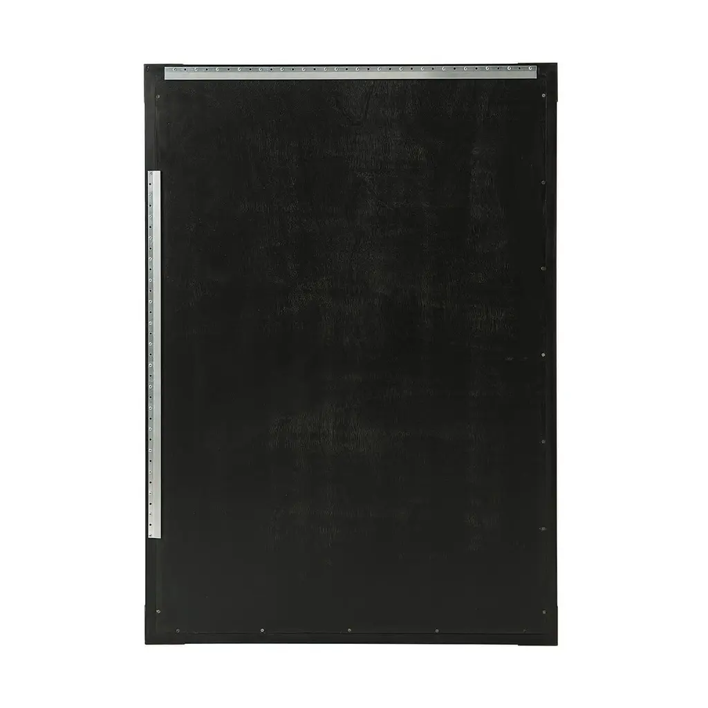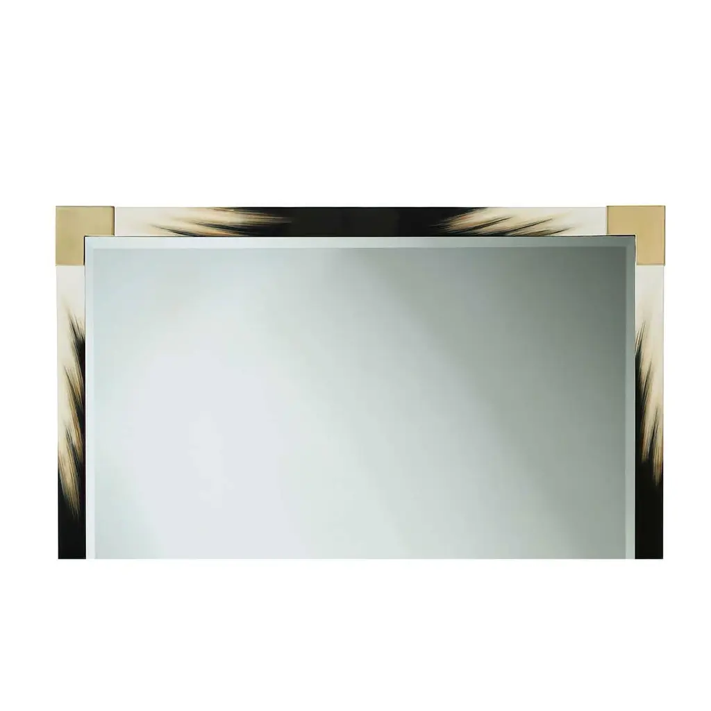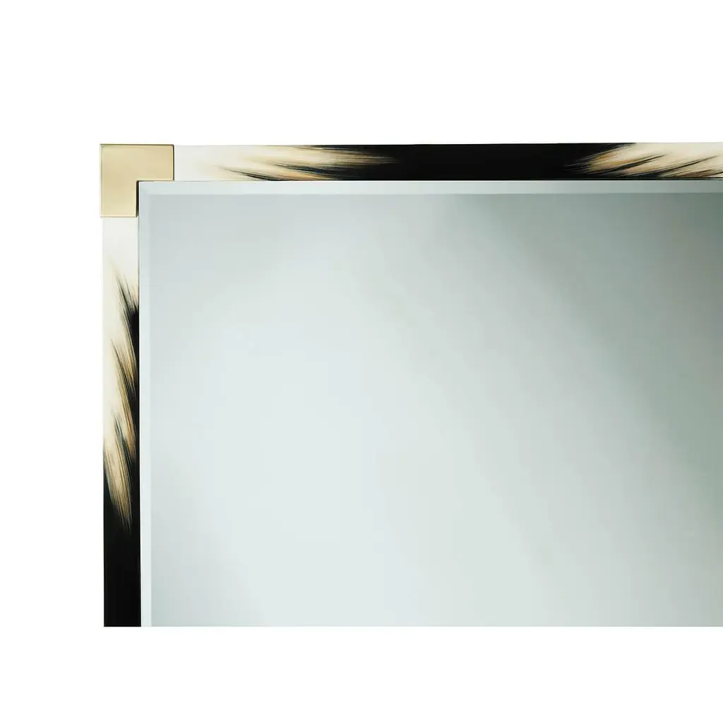 A large modern black lacquered and faux horn mirror, the rectangular top with brass edged corners, enclosing a bevelled edge plate.Dimensions: 38" W x 2" D x 54" H.