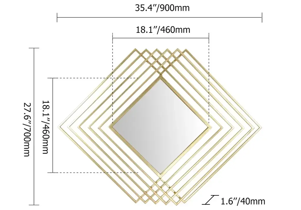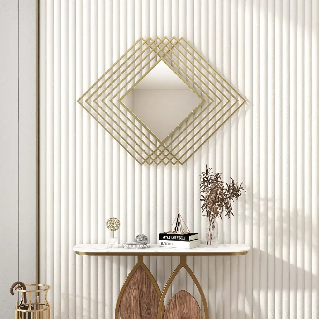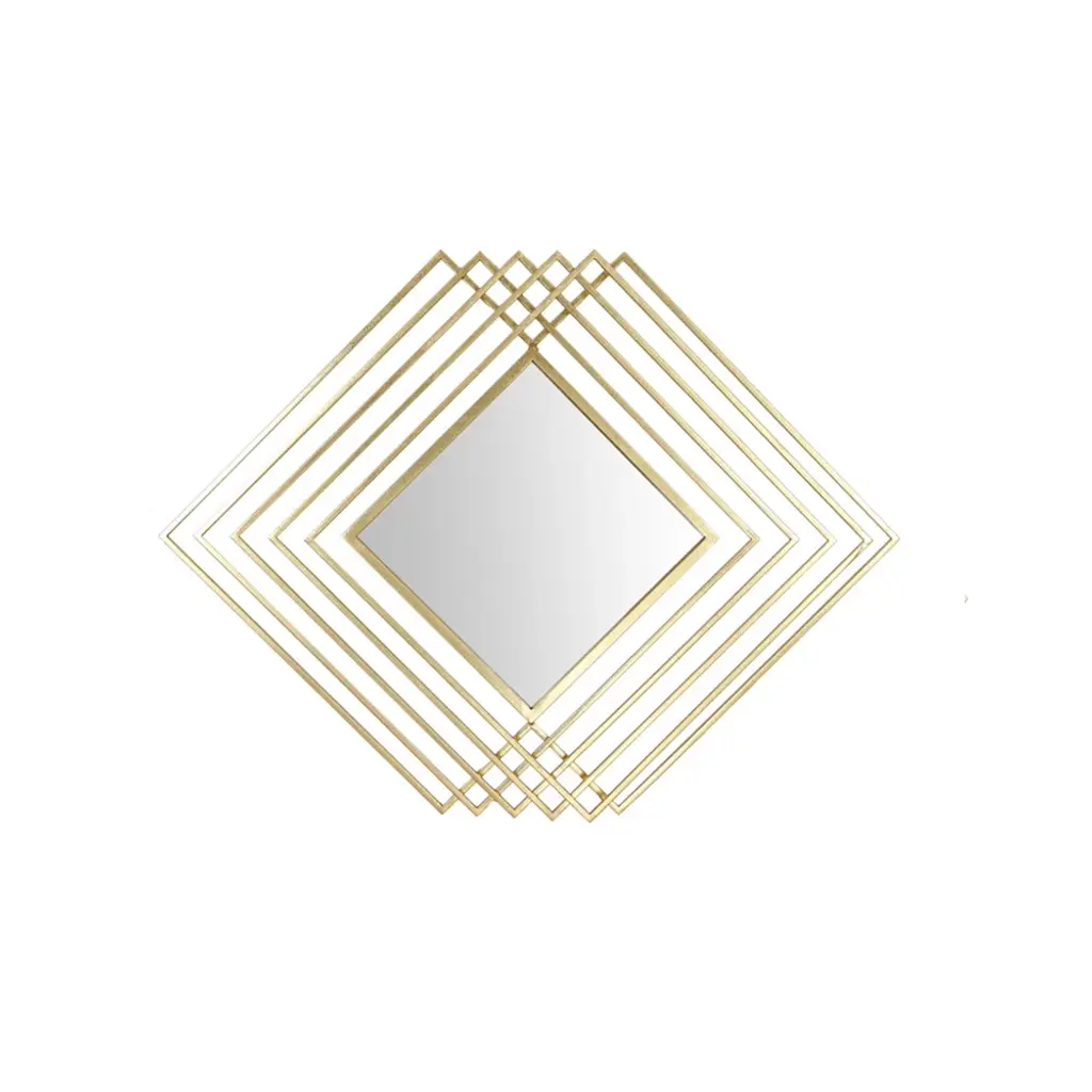This geometrically shaped wall mirror combined with functionality is perfect for filling empty spaces on the wall and creating an artistic feel. Its frame is delicately crafted from metal and presents a patterned shape of an overlapping rhombus with a gold finish for a modern look. Perfect for hanging in living rooms, dining rooms, entryways, bedrooms and other home spaces.