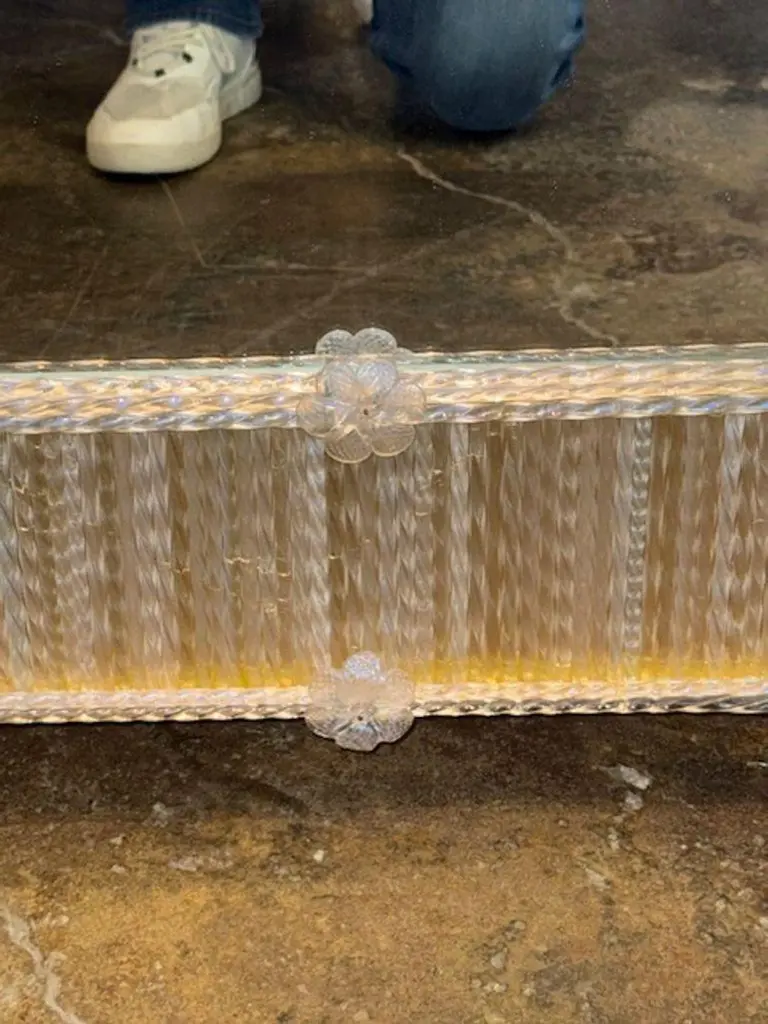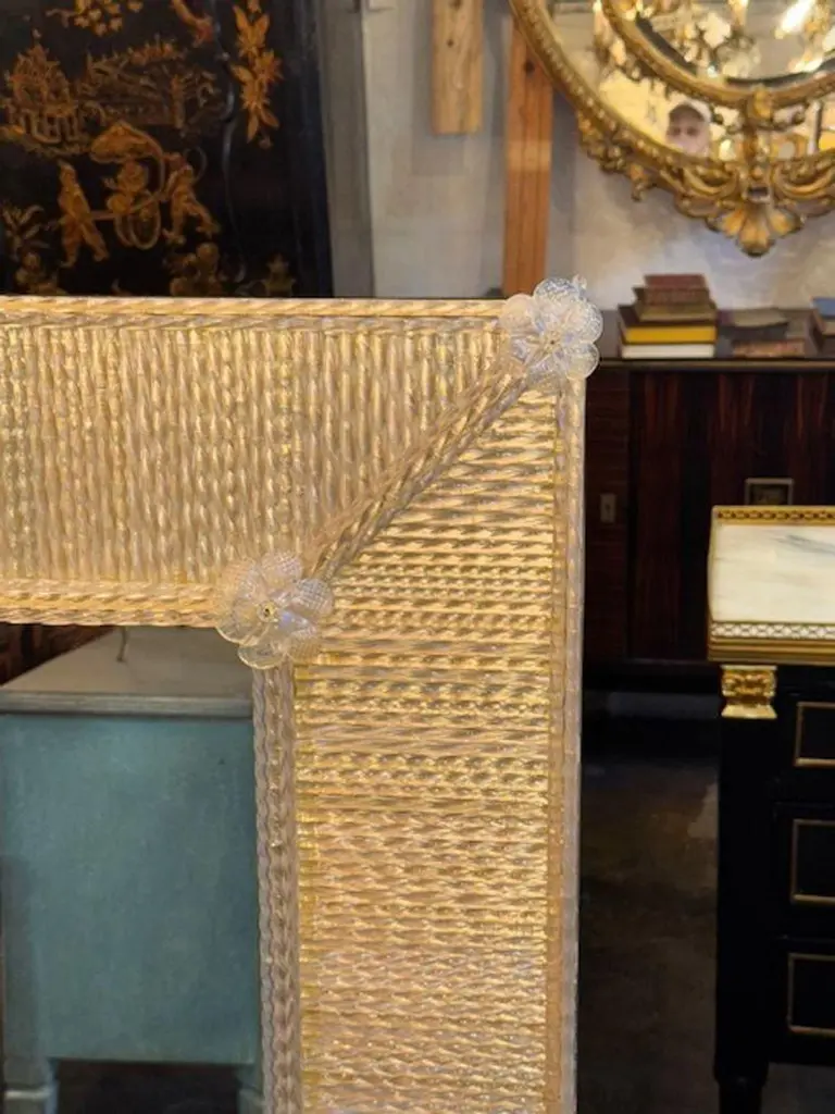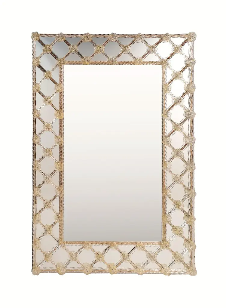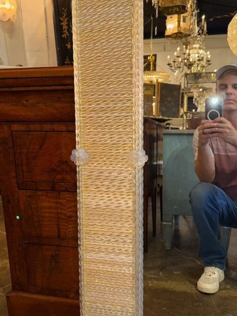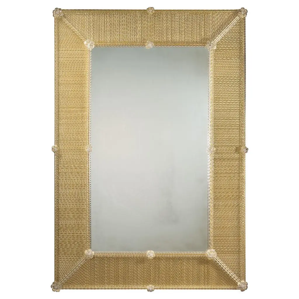 The Modern Murano Twist Glass Rod Mirror in Light Gold features a sleek and contemporary design, perfect for adding a touch of sophistication to any room. Crafted from high-quality Murano glass, this mirror showcases a unique twist pattern with a light gold finish, exuding luxury and elegance. The modern style of this mirror makes it a versatile piece that can easily complement various home décor styles, making it a standout addition to your living space. Note: There are 2 Available.38w x 54h