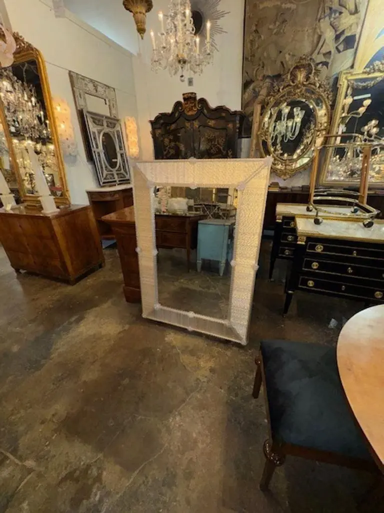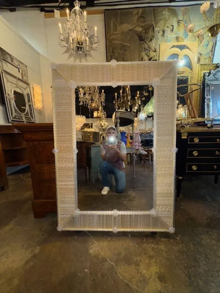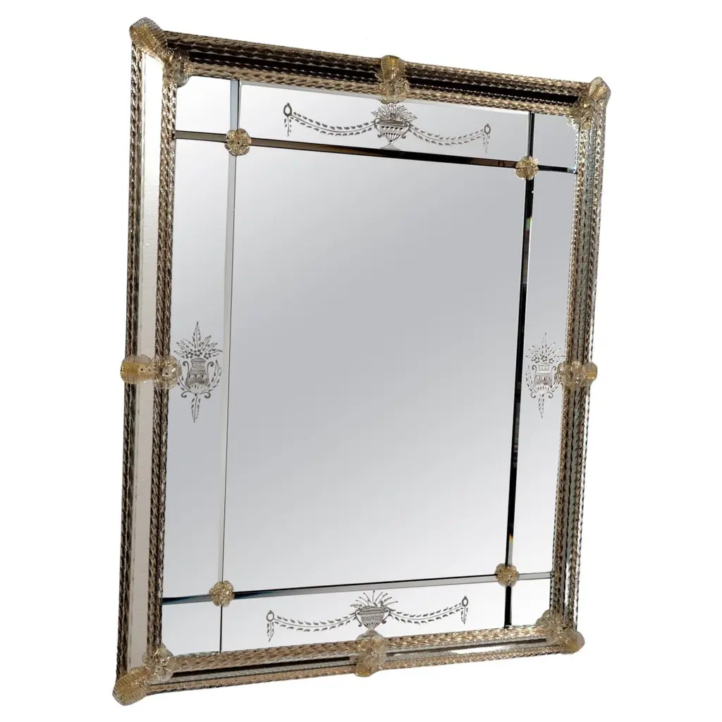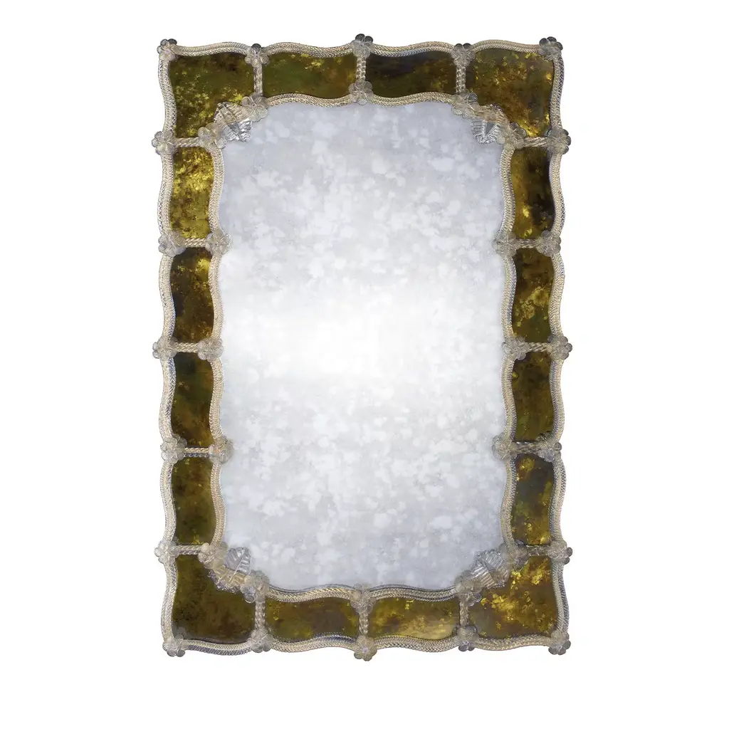 The Modern Murano Twist Glass Rod Mirror in Light Gold features a sleek and contemporary design, perfect for adding a touch of sophistication to any room. Crafted from high-quality Murano glass, this mirror showcases a unique twist pattern with a light gold finish, exuding luxury and elegance. The modern style of this mirror makes it a versatile piece that can easily complement various home décor styles, making it a standout addition to your living space. Note: There are 2 Available.38w x 54h