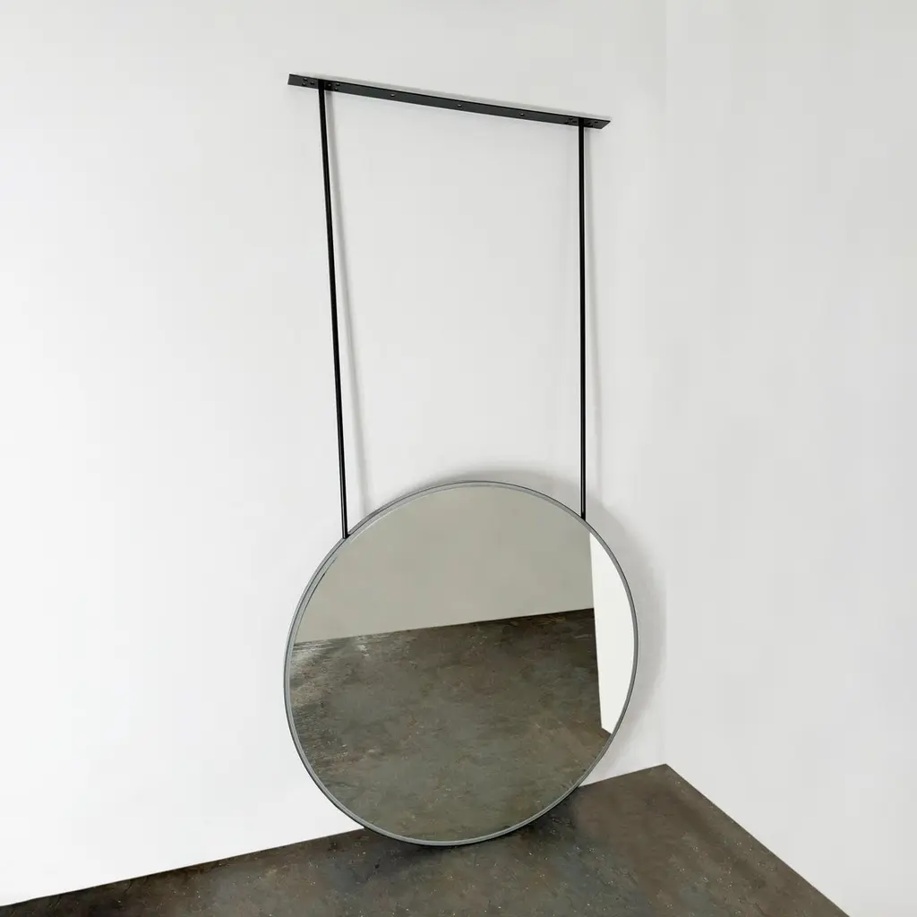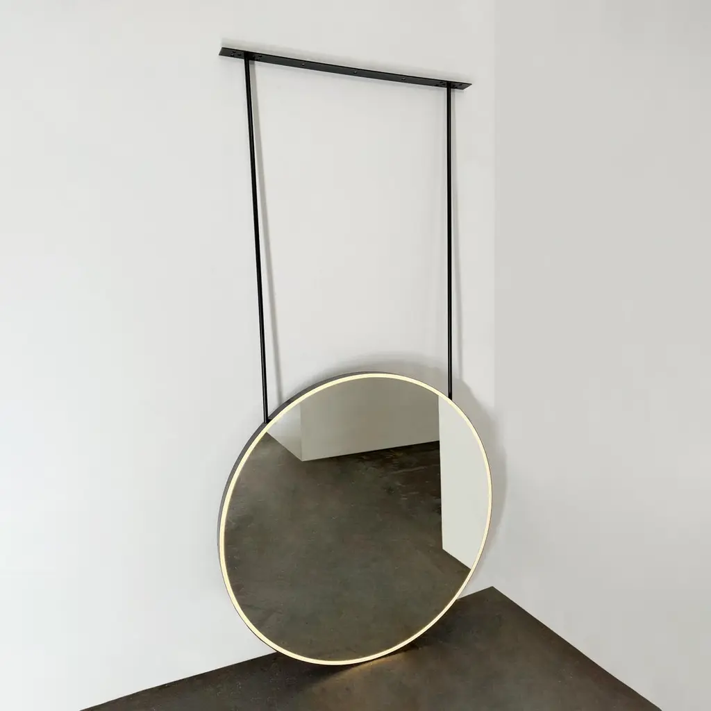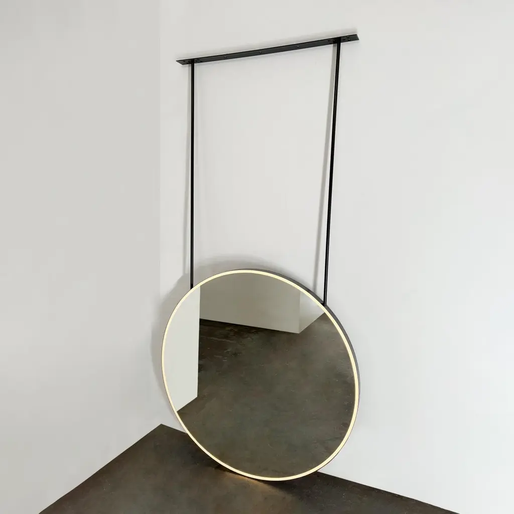 Modern front illuminated ceiling suspended Orbis™ round mirror with a powder coated black frame. Designed and handcrafted in London, UK. This mirror is fully customisable to suit the specific requirements of each interior.Dimensions: 91.4cm (36in) Diameter x 4.1cm (1.61in) DeepThe mirror is illustrated with a drop of 61cm (24in) but it can be made in a bespoke length.Mirror backing. The quality finish of our suspended mirrors extends to their backings, which are made from a powder coated panel available in black or white. The mirror backings can also be substituted by a second mirror, making your mirror double sided.Cover plates. The ceiling plates are supplied with a cover hiding the screws to complete the minimalist design of the mirror.Standard Illumination. The mirror features warm white LED lighting with a colour temperature of 2800–3300K and a power consumption of 14.4W per meter. It has an IP67 rating.Driver. A non-dimmable driver compatible with local voltage is supplied as standard. Alternative drivers — including dimmable versions or different colour temperature options — are available upon request.Shipped safely and insured worldwide. All our mirrors are made on demand. Fabrication lead time for this mirror is approximately 6 to 7 weeks. Our mirrors are always shipped by courier express. Shipping via courier express typically requires 1 to 2 days to the UK, or 2 to 7 days outside the UK depending on the destination.Available options:•backing in a finish that matches the frame•frame finishes: brass (brushed, polished or with a bronze patina), copper, stainless steel, blackened metal, powder coated aluminium in a range of standard or bespoke colours•full frame that extends to the front of the mirror•mirror tints: standard silver, black, bronze, blue, rose gold / peach•back-illumination creating a halo effect•ON/OFF sensor switch•demister pad•bevelA presentation illustrating the options above is also available on demand. Please contact us for a quote for any bespoke specification or added options.IMPORTANT NOTES:This suspended mirror is intended to be mounted onto the ceiling and cannot be installed onto a countertop. Countertop mounted mirrors are available on demand.ORDERS OF MULTIPLE MIRRORS OF THE SAME TYPE: Please contact us to receive a Packing and Shipping quote when ordering multiple mirrors of the same type. An order for multiple mirrors of the same type may not be accepted without extra packing and shipping fees. Thank you.