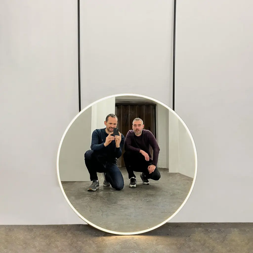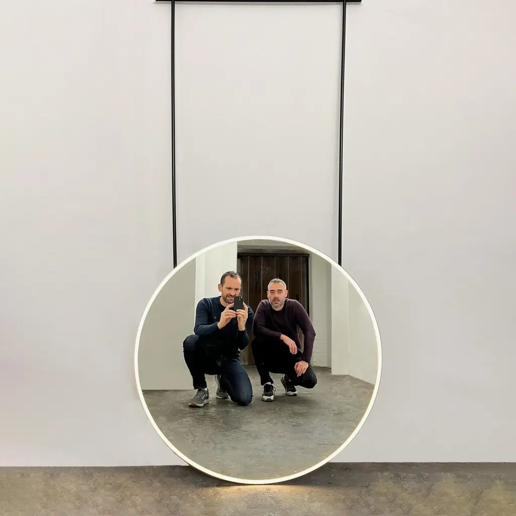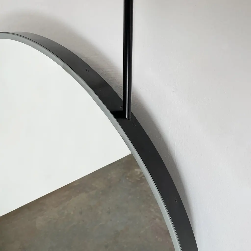 Modern front illuminated ceiling suspended Orbis™ round mirror with a powder coated black frame. Designed and handcrafted in London, UK. This mirror is fully customisable to suit the specific requirements of each interior.Dimensions: 91.4cm (36in) Diameter x 4.1cm (1.61in) DeepThe mirror is illustrated with a drop of 61cm (24in) but it can be made in a bespoke length.Mirror backing. The quality finish of our suspended mirrors extends to their backings, which are made from a powder coated panel available in black or white. The mirror backings can also be substituted by a second mirror, making your mirror double sided.Cover plates. The ceiling plates are supplied with a cover hiding the screws to complete the minimalist design of the mirror.Standard Illumination. The mirror features warm white LED lighting with a colour temperature of 2800–3300K and a power consumption of 14.4W per meter. It has an IP67 rating.Driver. A non-dimmable driver compatible with local voltage is supplied as standard. Alternative drivers — including dimmable versions or different colour temperature options — are available upon request.Shipped safely and insured worldwide. All our mirrors are made on demand. Fabrication lead time for this mirror is approximately 6 to 7 weeks. Our mirrors are always shipped by courier express. Shipping via courier express typically requires 1 to 2 days to the UK, or 2 to 7 days outside the UK depending on the destination.Available options:•backing in a finish that matches the frame•frame finishes: brass (brushed, polished or with a bronze patina), copper, stainless steel, blackened metal, powder coated aluminium in a range of standard or bespoke colours•full frame that extends to the front of the mirror•mirror tints: standard silver, black, bronze, blue, rose gold / peach•back-illumination creating a halo effect•ON/OFF sensor switch•demister pad•bevelA presentation illustrating the options above is also available on demand. Please contact us for a quote for any bespoke specification or added options.IMPORTANT NOTES:This suspended mirror is intended to be mounted onto the ceiling and cannot be installed onto a countertop. Countertop mounted mirrors are available on demand.ORDERS OF MULTIPLE MIRRORS OF THE SAME TYPE: Please contact us to receive a Packing and Shipping quote when ordering multiple mirrors of the same type. An order for multiple mirrors of the same type may not be accepted without extra packing and shipping fees. Thank you.