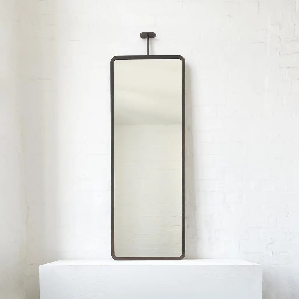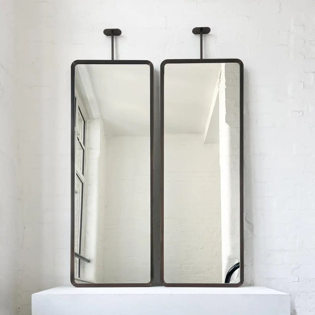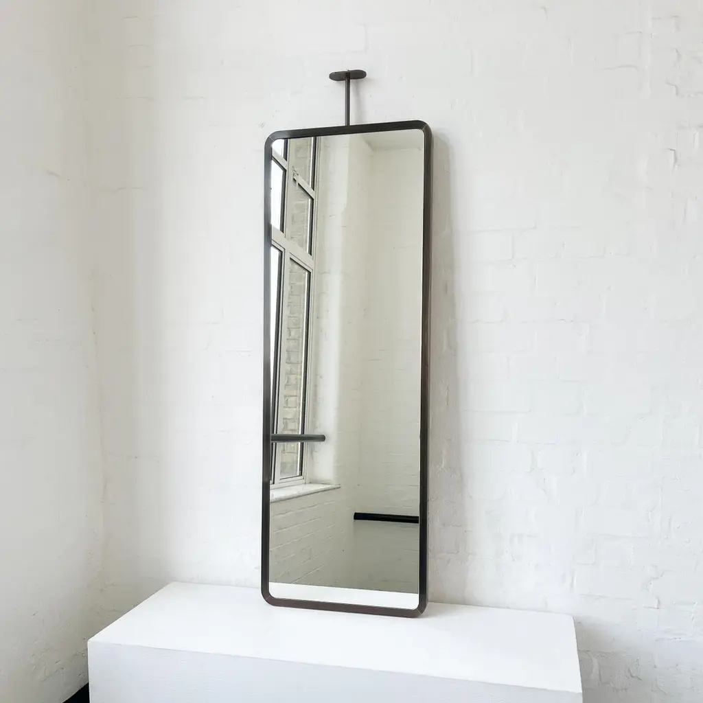 Modern ceiling suspended Quadris™ rectangular mirror with an exquisite handcrafted brass frame with a bronze patina finish. Available individually or as a set, this mirror is fully customisable to suit the specific requirements of each interior. Designed and handcrafted in London, UK.Mirror backing. The high quality finish of our countertop mirrors extends to their backings, which are made from a powder coated panel available in black or white. Backings can also be upgraded to a finish that matches the frame or can be substituted by a second mirror, making your mirror double sided.Cover plate. The ceiling plate is supplied with a cover hiding the screws to complete the minimalist design of the mirror.The Neska™ signature bronze patina finish of our frames is a highly skilled and handcrafted process. Carried out by our talented craftsmen, this artistic finish is created from the base metal itself to achieve the natural look of aged brass. This makes the finish of each frame original and unique as no two frames can be identical. Any sample or images provided to obtain your approval on the desired finish or on our website or any other promotional material are therefore for guidance only.Shipped safely and insured worldwide. All our mirrors are made on demand. Fabrication lead time for this mirror is approximately 6 to 7 weeks. Our mirrors are always shipped by courier express. Shipping via courier express typically requires 1 to 2 days to the UK, or 2 to 7 days outside the UK depending on the destination.Dimensions: 127cm x 45cm x 3.1cm (Drop 13cm) / 50in x 17.72in x 1.23in (Drop 5.12in)Mirror drop: Customisable – Price may be adjusted if drop greater than the height of the mirror. Please contact us for further information.Available options:- frame finishes: brass (brushed, polished or with a bronze patina), copper, stainless steel, blackened metal, powder coated aluminium in a range of standard or bespoke colours- full frame- backing with a finish that matches the frame- double-sided mirror- mirror tints: standard silver, black, bronze, blue, rose gold / peach- back-illumination creating a halo effect- front illumination- ON/OFF sensor switch- dimmable driver- demister pad- bevelPlease contact us for a quote for any bespoke specification or added options.IMPORTANT NOTES:- This suspended mirror is intended to be mounted onto the ceiling and cannot be installed onto a countertop. Countertop mounted mirrors are available on demand.ORDERS OF MULTIPLE MIRRORS OF THE SAME TYPE: Please contact us to receive a Packing and Shipping quote when ordering multiple mirrors of the same type. An order for multiple mirrors of the same type may not be accepted without extra packing and shipping fees. Thank you.