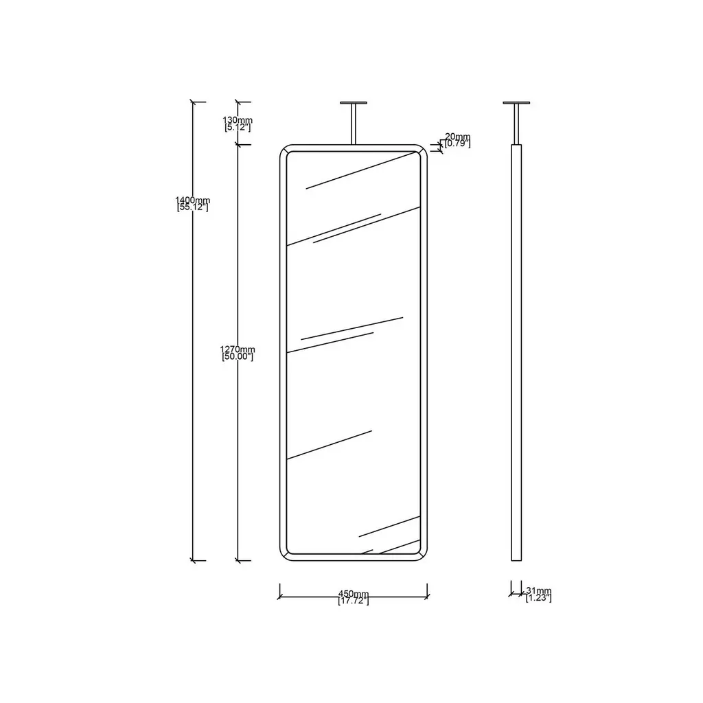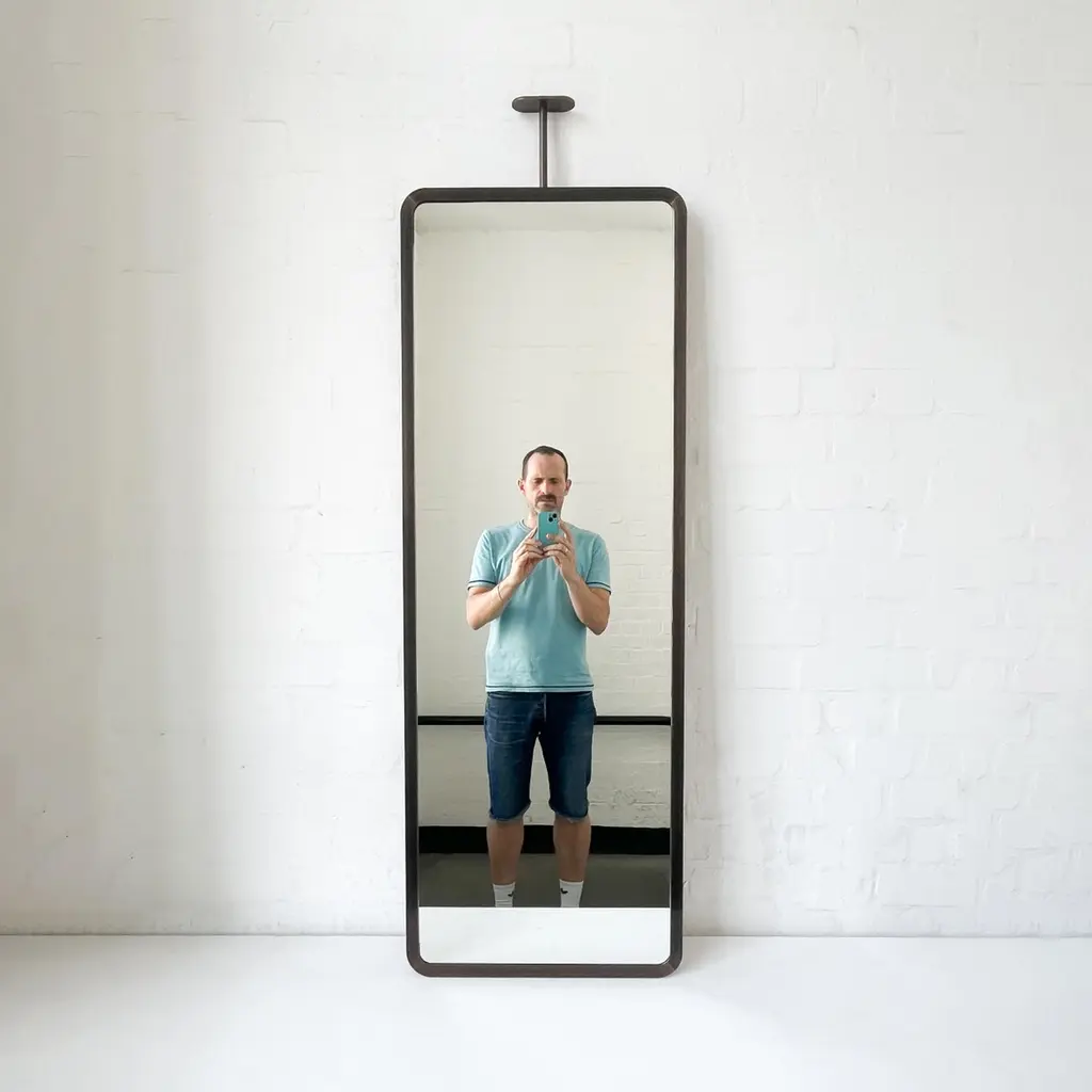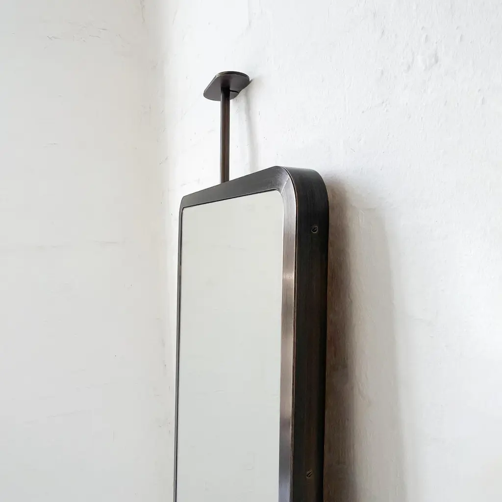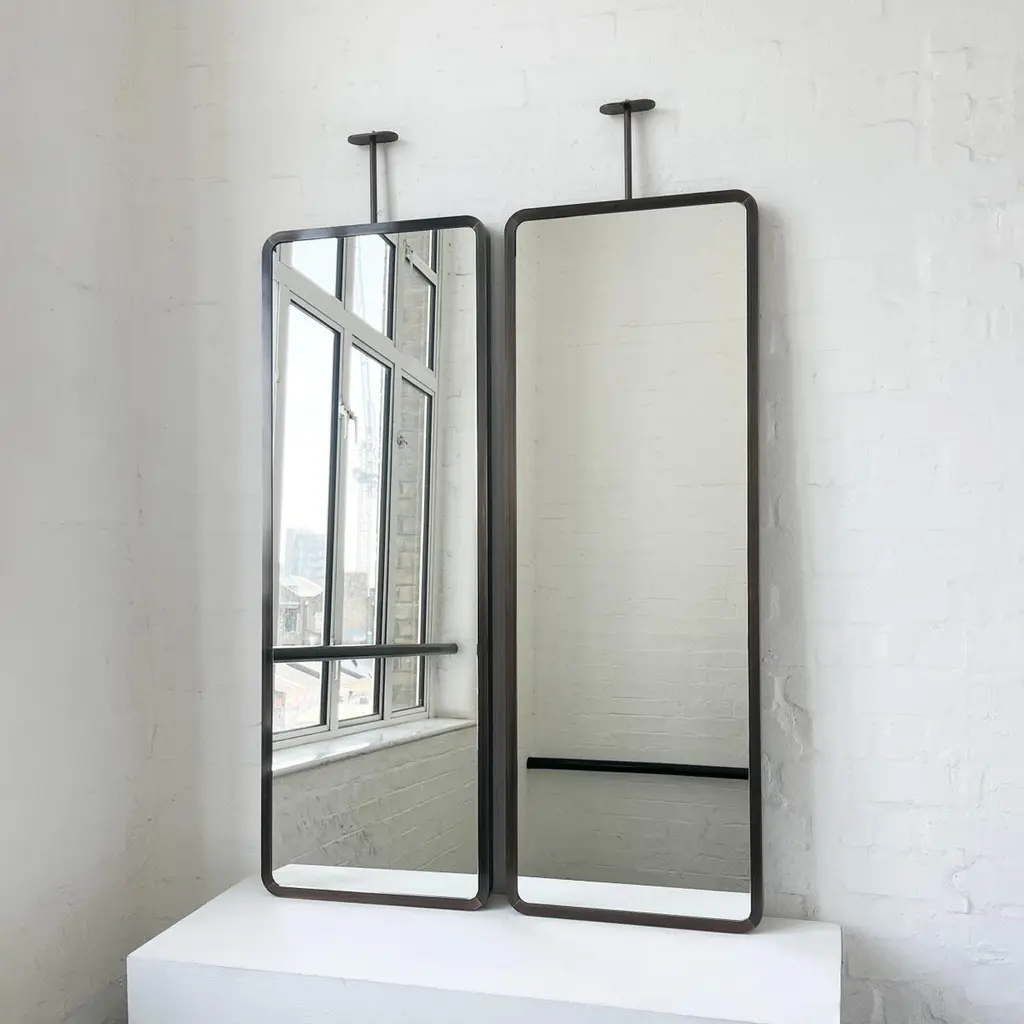 Modern ceiling suspended Quadris™ rectangular mirror with an exquisite handcrafted brass frame with a bronze patina finish. Available individually or as a set, this mirror is fully customisable to suit the specific requirements of each interior. Designed and handcrafted in London, UK.Mirror backing. The high quality finish of our countertop mirrors extends to their backings, which are made from a powder coated panel available in black or white. Backings can also be upgraded to a finish that matches the frame or can be substituted by a second mirror, making your mirror double sided.Cover plate. The ceiling plate is supplied with a cover hiding the screws to complete the minimalist design of the mirror.The Neska™ signature bronze patina finish of our frames is a highly skilled and handcrafted process. Carried out by our talented craftsmen, this artistic finish is created from the base metal itself to achieve the natural look of aged brass. This makes the finish of each frame original and unique as no two frames can be identical. Any sample or images provided to obtain your approval on the desired finish or on our website or any other promotional material are therefore for guidance only.Shipped safely and insured worldwide. All our mirrors are made on demand. Fabrication lead time for this mirror is approximately 6 to 7 weeks. Our mirrors are always shipped by courier express. Shipping via courier express typically requires 1 to 2 days to the UK, or 2 to 7 days outside the UK depending on the destination.Dimensions: 127cm x 45cm x 3.1cm (Drop 13cm) / 50in x 17.72in x 1.23in (Drop 5.12in)Mirror drop: Customisable – Price may be adjusted if drop greater than the height of the mirror. Please contact us for further information.Available options:- frame finishes: brass (brushed, polished or with a bronze patina), copper, stainless steel, blackened metal, powder coated aluminium in a range of standard or bespoke colours- full frame- backing with a finish that matches the frame- double-sided mirror- mirror tints: standard silver, black, bronze, blue, rose gold / peach- back-illumination creating a halo effect- front illumination- ON/OFF sensor switch- dimmable driver- demister pad- bevelPlease contact us for a quote for any bespoke specification or added options.IMPORTANT NOTES:- This suspended mirror is intended to be mounted onto the ceiling and cannot be installed onto a countertop. Countertop mounted mirrors are available on demand.ORDERS OF MULTIPLE MIRRORS OF THE SAME TYPE: Please contact us to receive a Packing and Shipping quote when ordering multiple mirrors of the same type. An order for multiple mirrors of the same type may not be accepted without extra packing and shipping fees. Thank you.