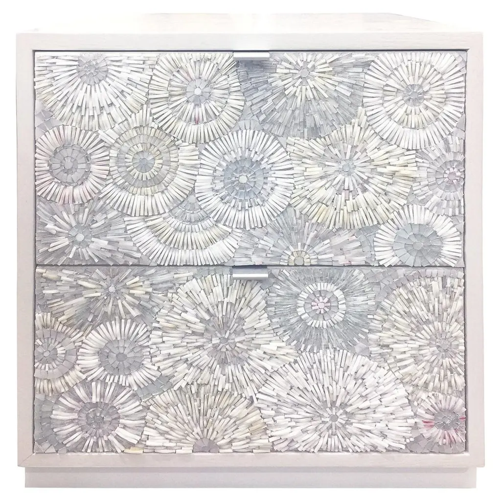 The Modern Round Blossom Mosaic Mirror features blossoms of hand-cut glass mosaic in shades of Light Ivory and Medium Ivory, with a 5" Wide Border. By Ercole Home. Custom sizes and Custom Colors are availableHandmade in Brooklyn NY.