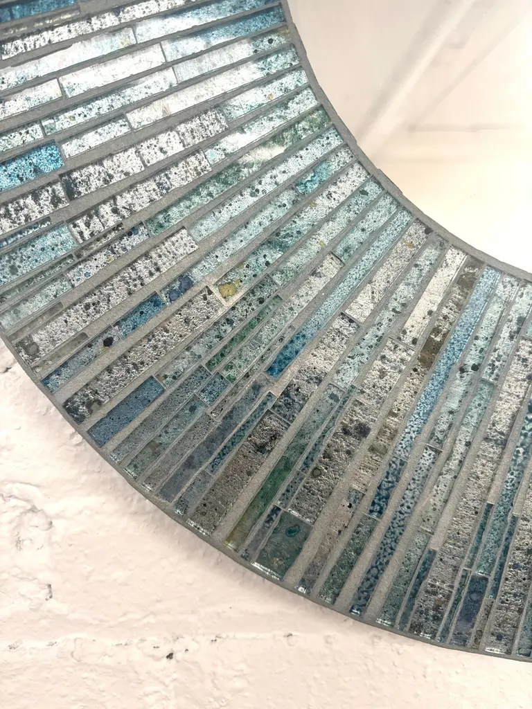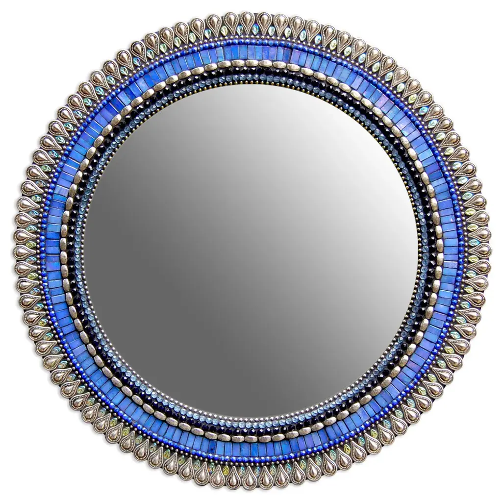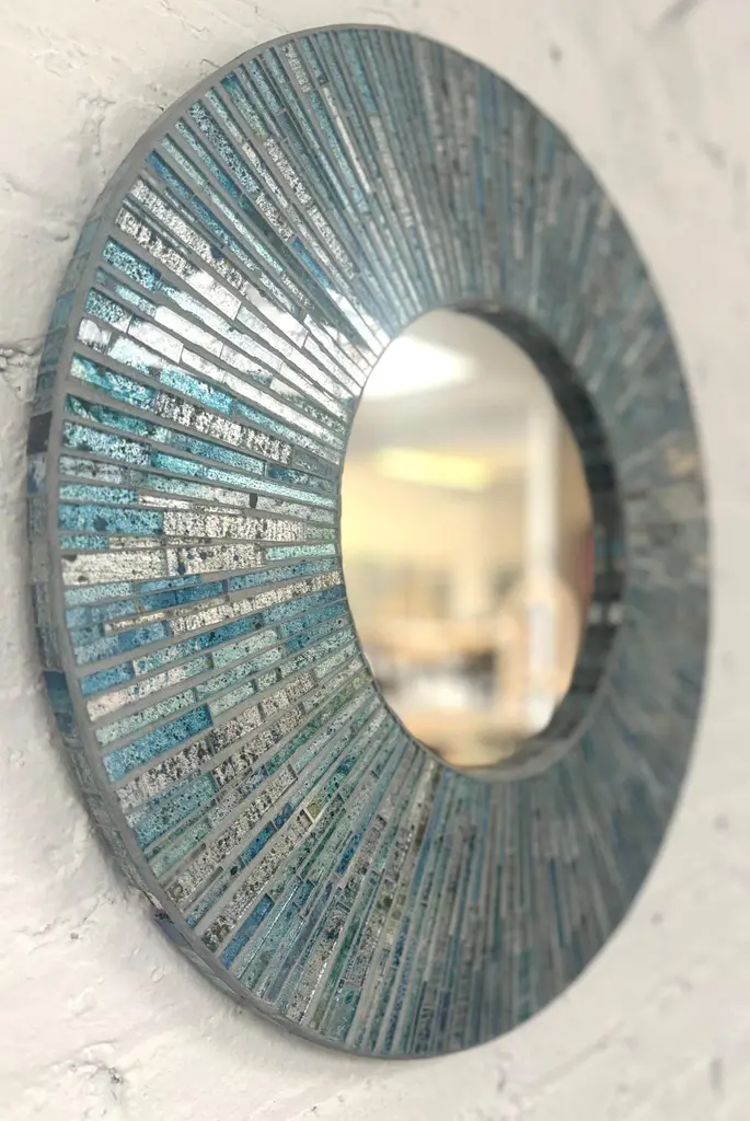 The Modern Round Mirror by Ercole Home has a 6" border of Hand-Cut Mosaic Frame in Midnight Moon hand-painted Mystic Glass. Custom sizes and finishes are available. Made in New York City.