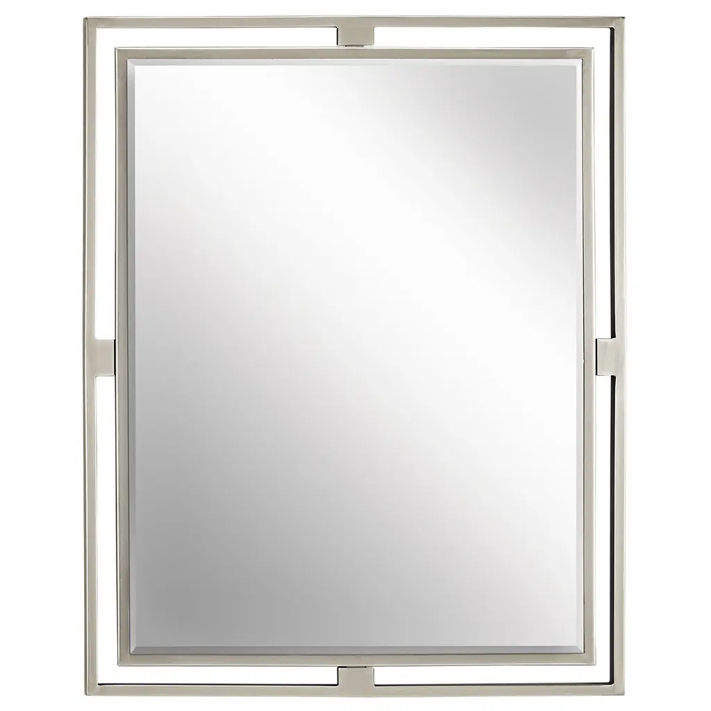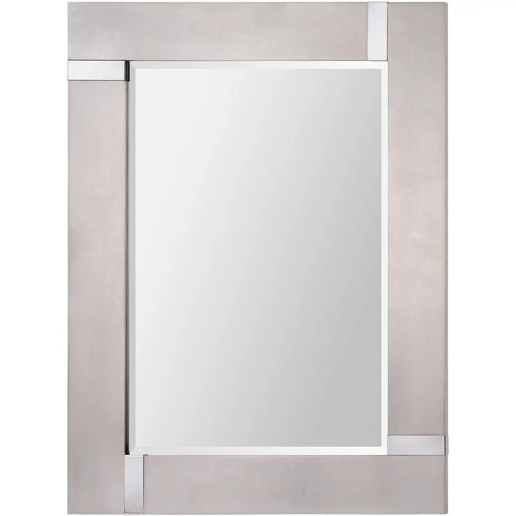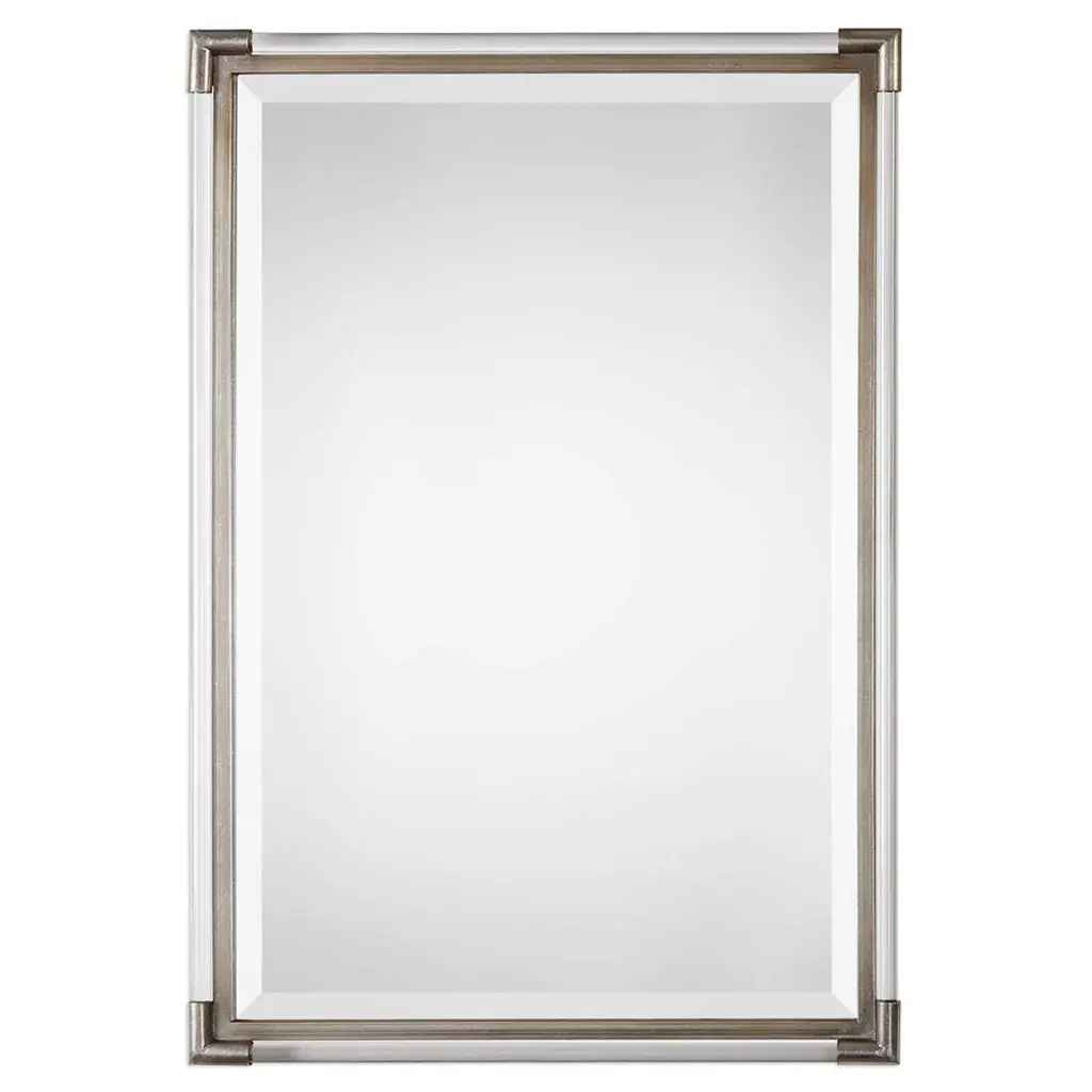Clear Acrylic Rods Surrounding A Metallic Silver Leafed Metal Frame, Creating A Simple Yet Elegant Mirror Piece That Adds A Taste Of Contemporary To Any Room. Mirror Is Beveled.• 32.75"H x 22.9"L x 1.4" deep. Weighs 18 lbs. Mirror Glass is 30.75" x 20.9".• Hand Finished Acrylic and Metal Frame• Properly weighted hanging hardware attached. Can be hung vertically or horizontally.• Heirloom Quality - Expertly hand crafted and hand finished. Due to the hand crafted nature of this piece, each piece may have subtle differences.