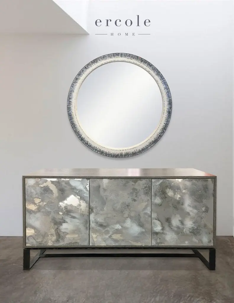 What makes this piece special is the combination of the Antique mirror front doors inserted in a wood case and the forged metal base.Inspired by the Antique Venetian and French mirror furniture, this piece is a modern interpretation by Ercole Home. It is also available in custom sizes and special finishes.Made in Brooklyn by a team of skillful artists and artisans.