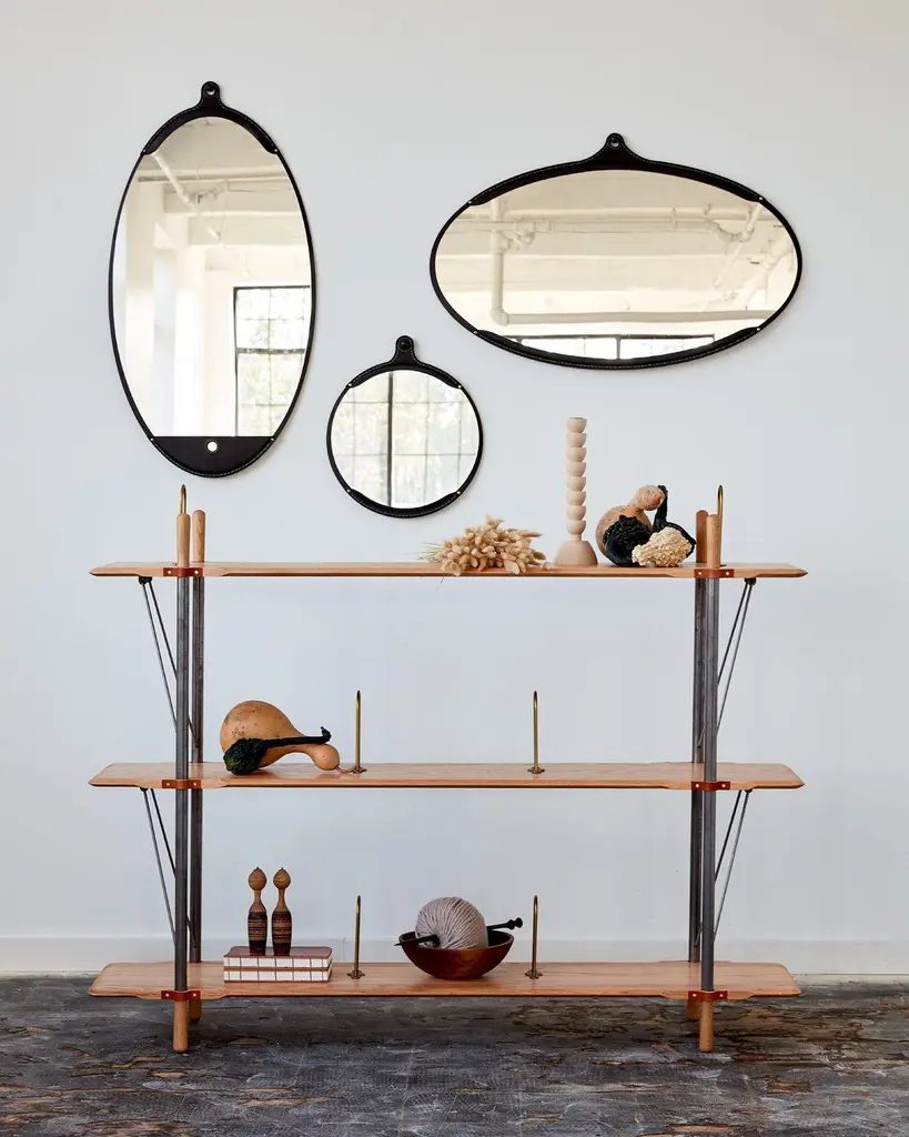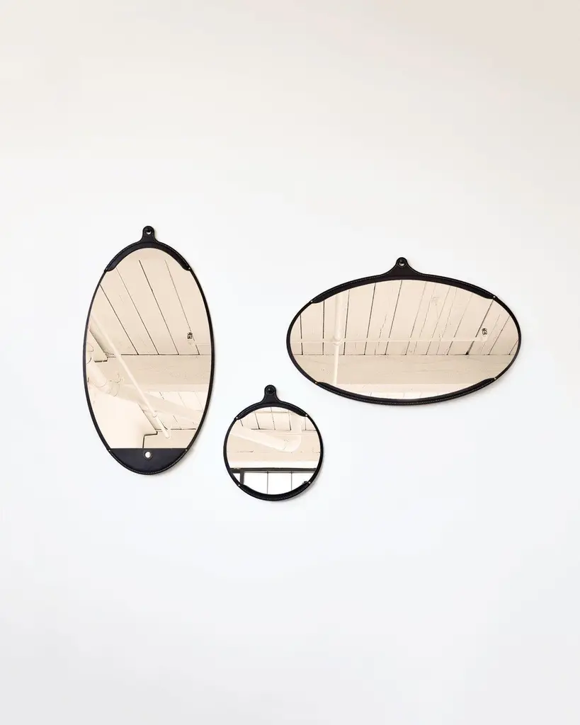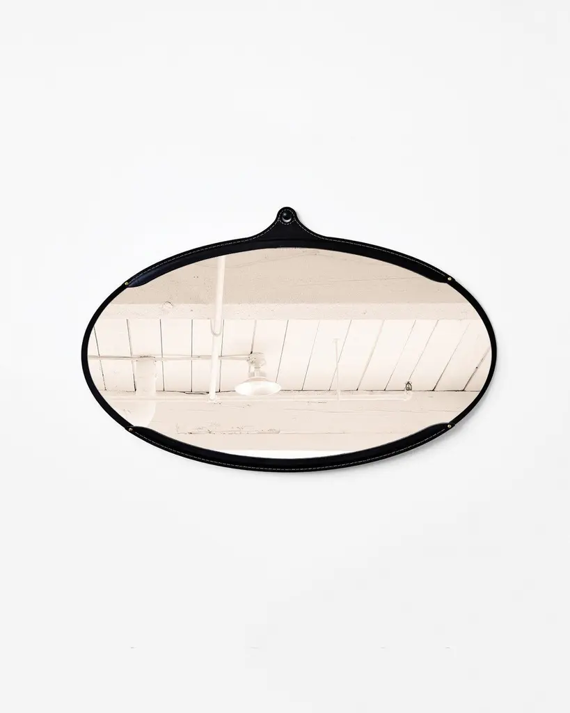 The fairmount wide oval mirror is a hand-stitched leather mirror. Each piece of leather has its own character and variations lending to the appeal of the material. The mirror sits inside the frame like a pocket and comes with an iron hand hammered screw post for hanging. Hand crafted in Pennsylvania. Available in brown, long oval, and small round.