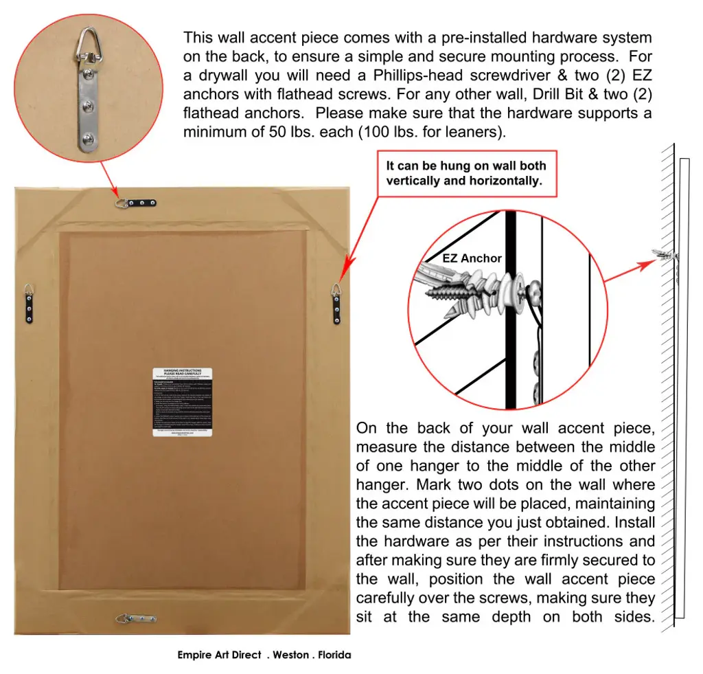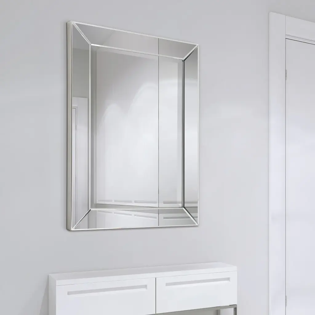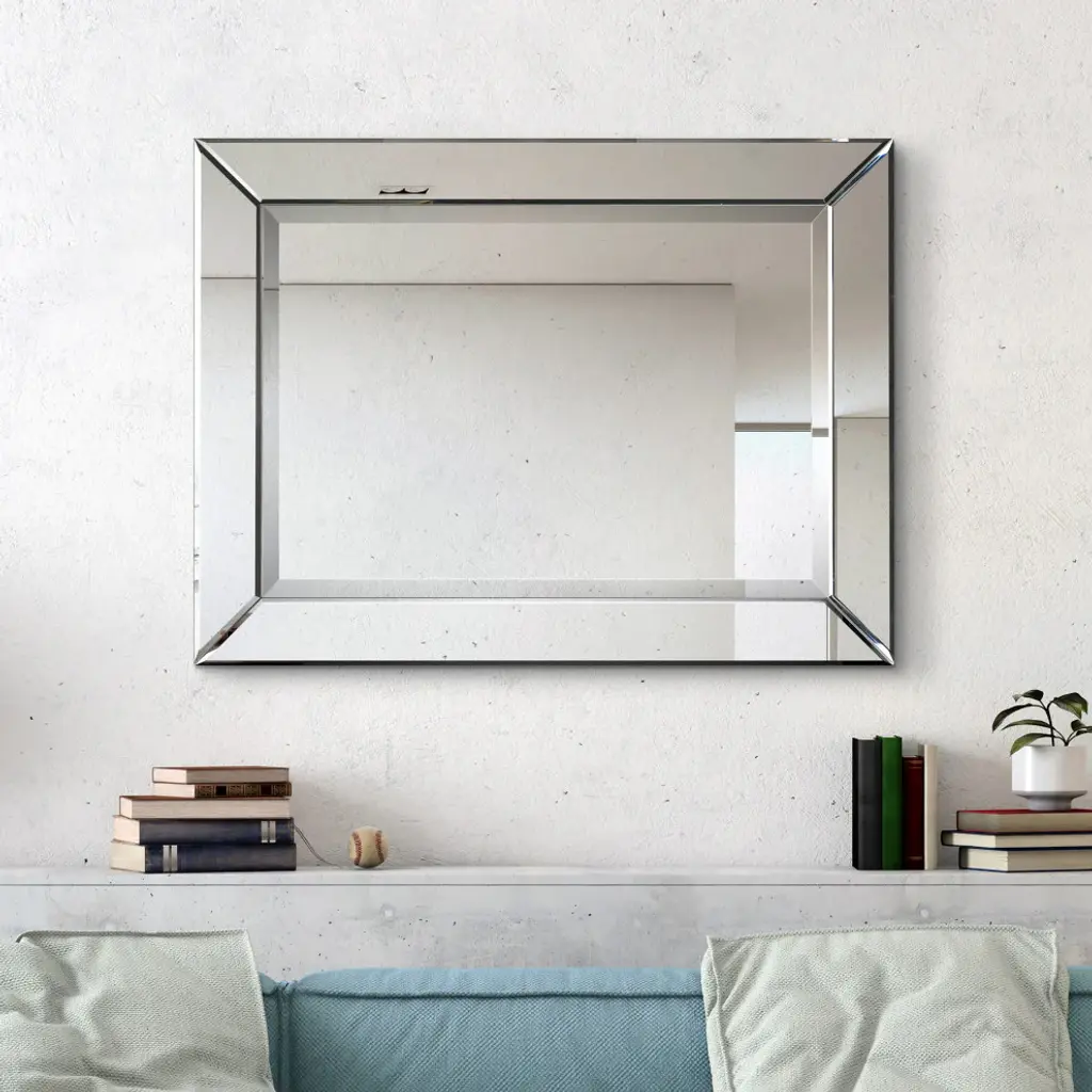 This wall mirror is ideal for adding more utility to a wall and enhancing the space of a room, making it feel larger and lighter. The mirror has a solid wood frame which will be sturdy and long-lasting, while the panels are clear mirror with a slight bevel. The bevel is 1 inch and serves to slightly extrude the mirror, giving it more texture and shape. 4 Hooks are affixed to the back of the mirror so it is ready to hang right out of the box in either a horizontal or vertical orientation! Packaged in strong carton with full protective corners and styrofoam.