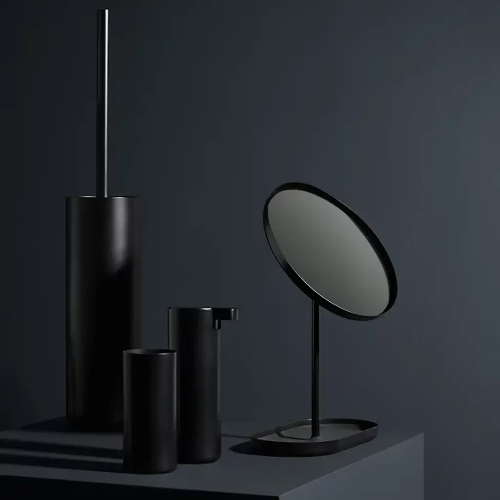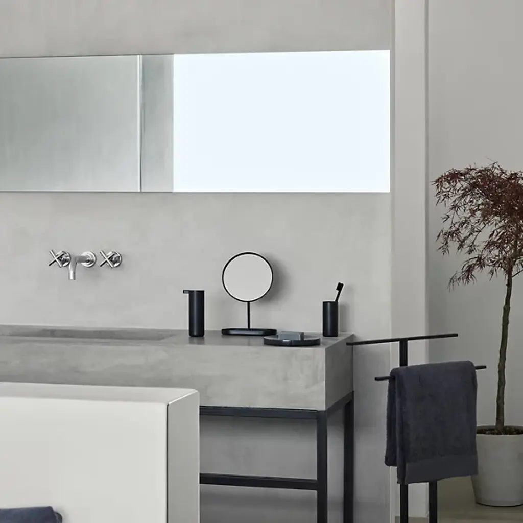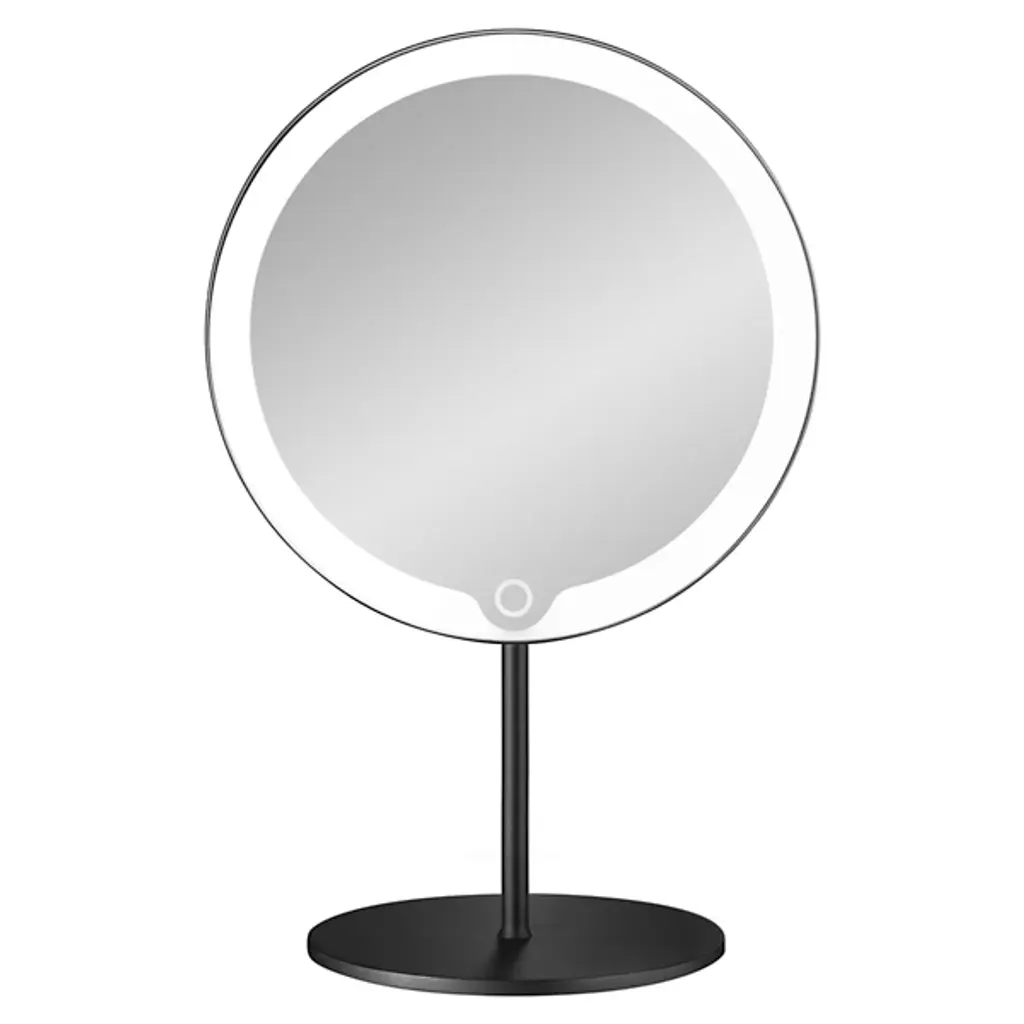 Touch up your smile in your bathroom or as you walk around the home with the handheld, rechargeable MODO LED Vanity Mirror from Blomus. The minimalist design and cutting-edge hardware give the piece a place in the contemporary home. Crafted in corrosion-resistant titanium-coated steel, the mirror rests on a low-profile circular base. A standard USB C port allows one to charge the batteries inside the 360-degree rotatable mirror. This removable mirror provides 5x magnification and brightens the face with a ring of LEDs that can be adjusted in temperature and brightness.
