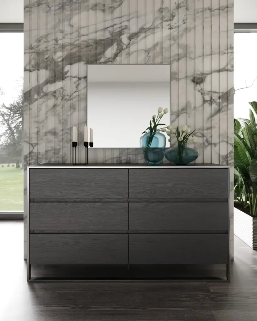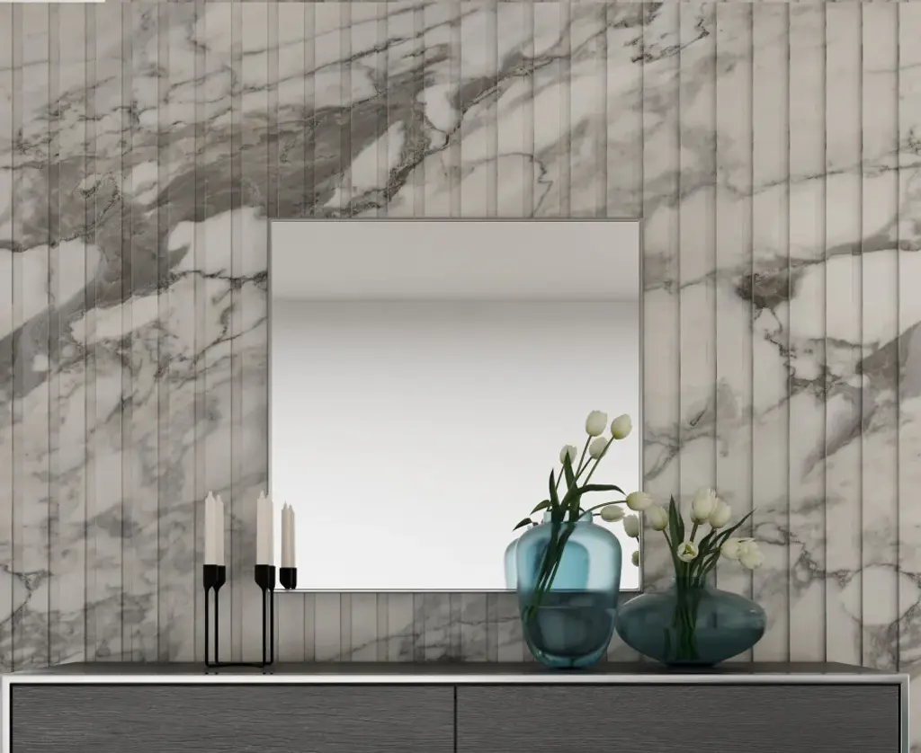 Clean and Minimalistic Modern Square Mirror in Grey Metal Frame. Will go perfectly with almost any modern dresser or vanity.Metal Square ShapeDresser Available SeparatelySome Assembly Required