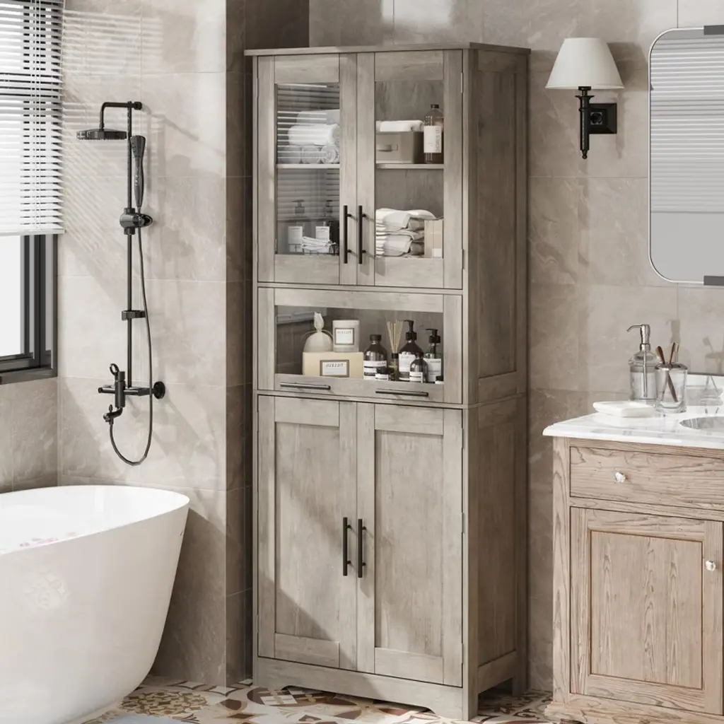 [High-quality Material]: Made of premium P2 level MDF boards, this cabinet is durable and sturdy and allows many years of use. Painted with grey finish, the surface is water-proof, easy to clean and brings a sleek look to your room. [Space-saving Design]: The bathroom cabinet is designed as a triangle shape to stand in the corner to save more space in your home. The compact cabinet fits small spaces and adds perfect storage space to all-sized bathrooms. Hides toiletries and other bathroom items behind cabinet door for a fresh and clean appearance. [Adjustable Shelves]: This tall corner cabinet includes three removable and adjustable shelves that allows you to install it in the up, middle or down part of the cabinet to divide the storage space. What's more, each shelf can be adjusted to different heights according to the pre-drilled holes. It totally satisfies home storage needs. [Provide More Storage Space]: This tall cabinet has one open storage part in the middle and two storage cabinet with enclosed doors up and down. You can put soaps, tooth brushes and other daily stuff on the up shelf and towels, shampoos, body lotion and other bathroom essentials in it to keep dust away. Furthermore, Closed storage cabinet with doors can keep your stuff dry and clean. [Design Details]: The groove pattern on the doors and curved line in the base add more elegant elements to this cabinet. Wood round door handles, magnetic door button and stainless steel hinges comfort customers when open and close the door. [Assembly Required]: Carefully packed and all hardware needed are included. This product needs two people to install by following the clear instruction manual.