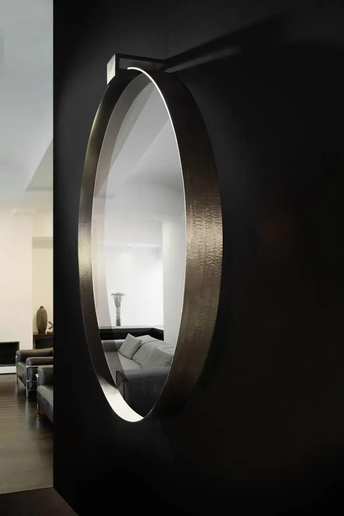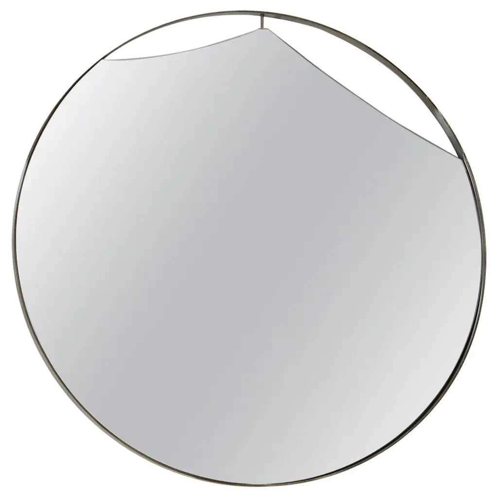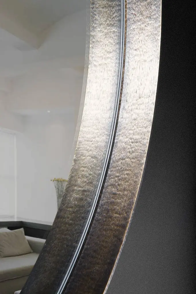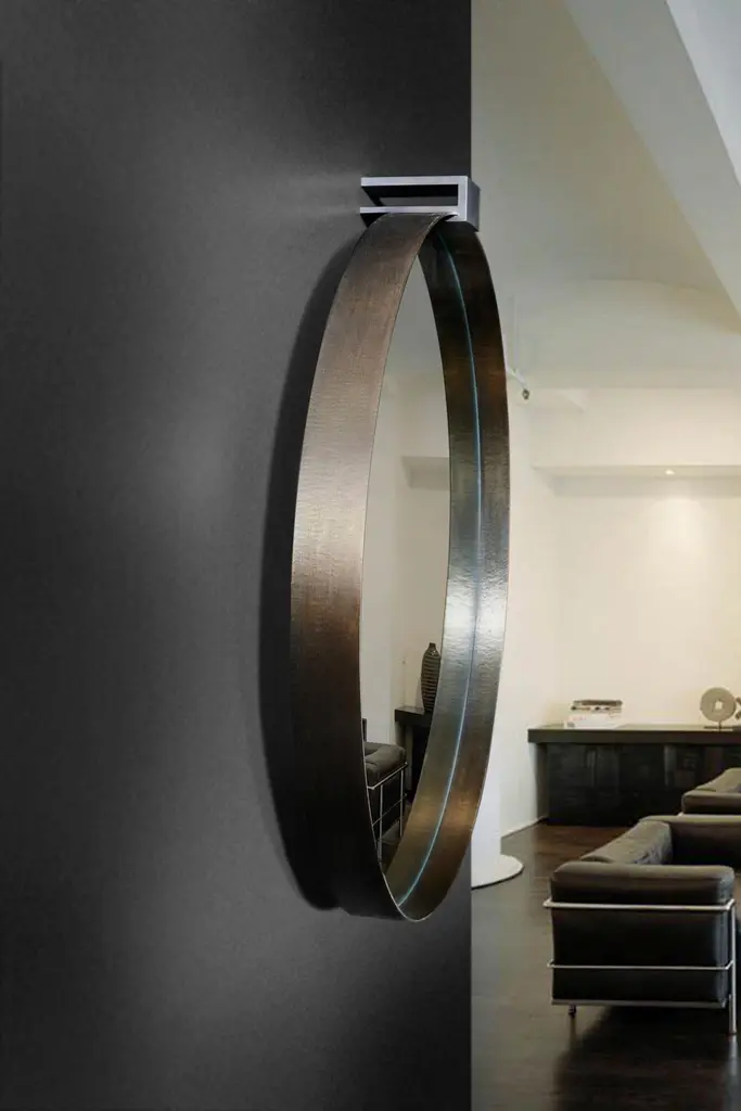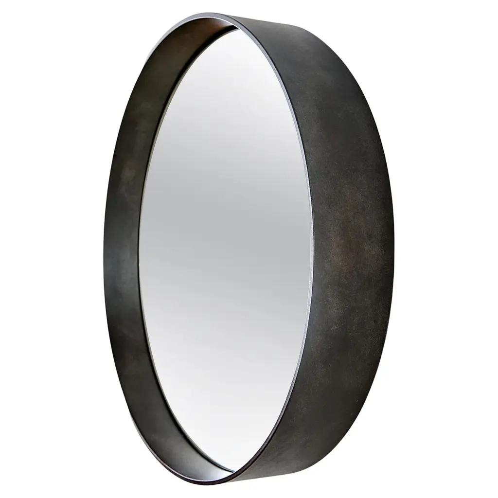 MOI round mirror with a handcrafted textured aged brass. The frame support is bronzed steel and can be inserted into the wall, completely concealing the fasteners or surface mounted, exposing the fasteners.The brass frame projects 1 3/8" to 1 1/2" from the wall, giving the illusion of floating in midair. Inside and outside of brass frame is textured.MOI 36" Diameter weighs approximately 26 - 30 lbs The perfect mirror for an entry way, vanity, bedroom or living room. Customization is available. Featured in Elle Décor. Designed and handcrafted by Soraya Osorio.