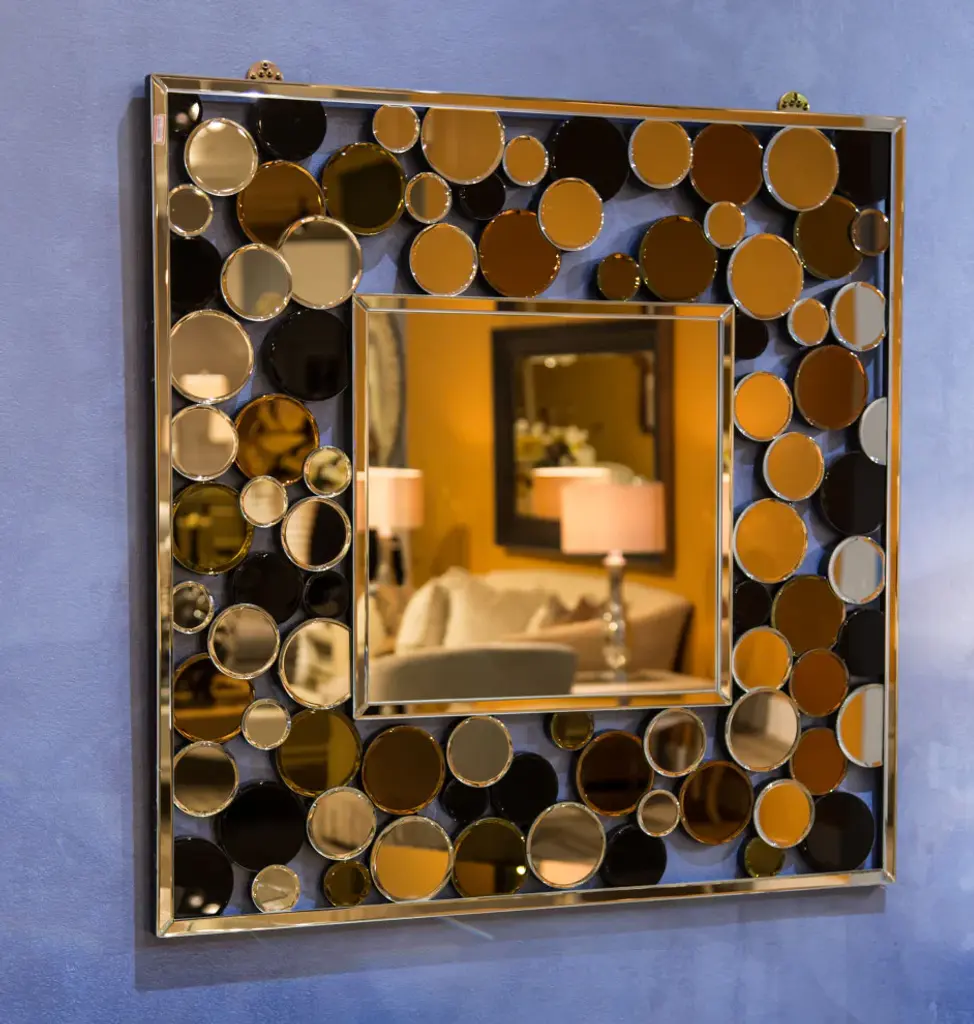 Add a little extra shine to any modern or contemporary décor with the Montreal Wall Accent Mirror. Multiple shades of round glass blend effortlessly to create the mosaic-like pattern. The beveled glass frame creates a striking, clean-cut silhouette. 39.50"H x 39.50"W x 1.25"D
