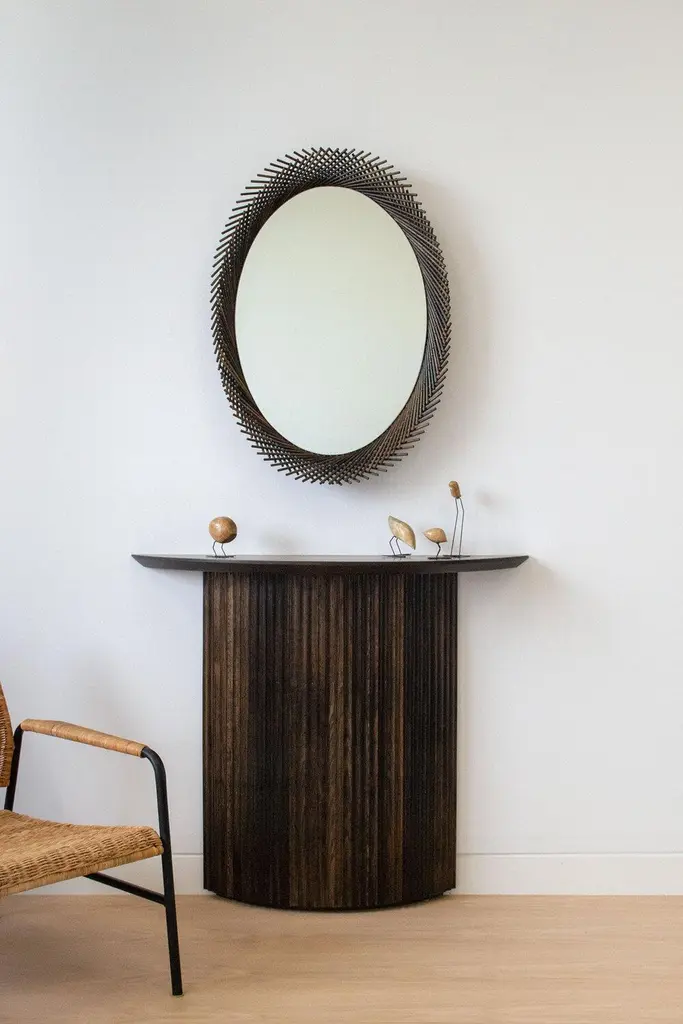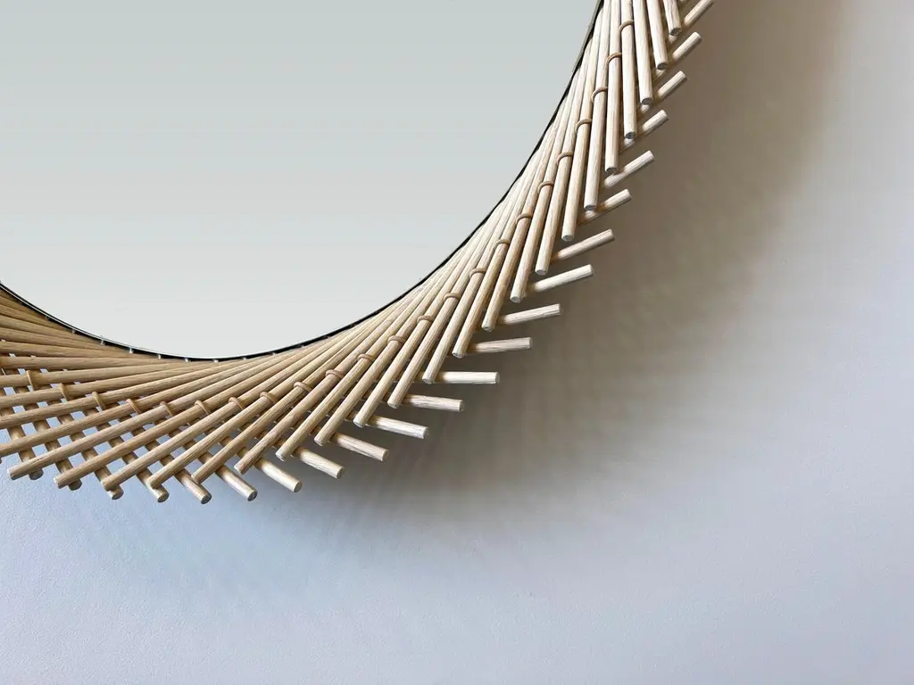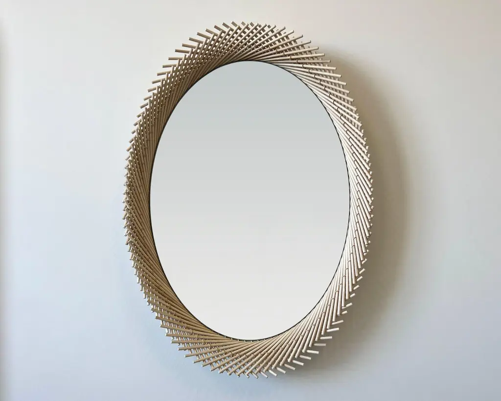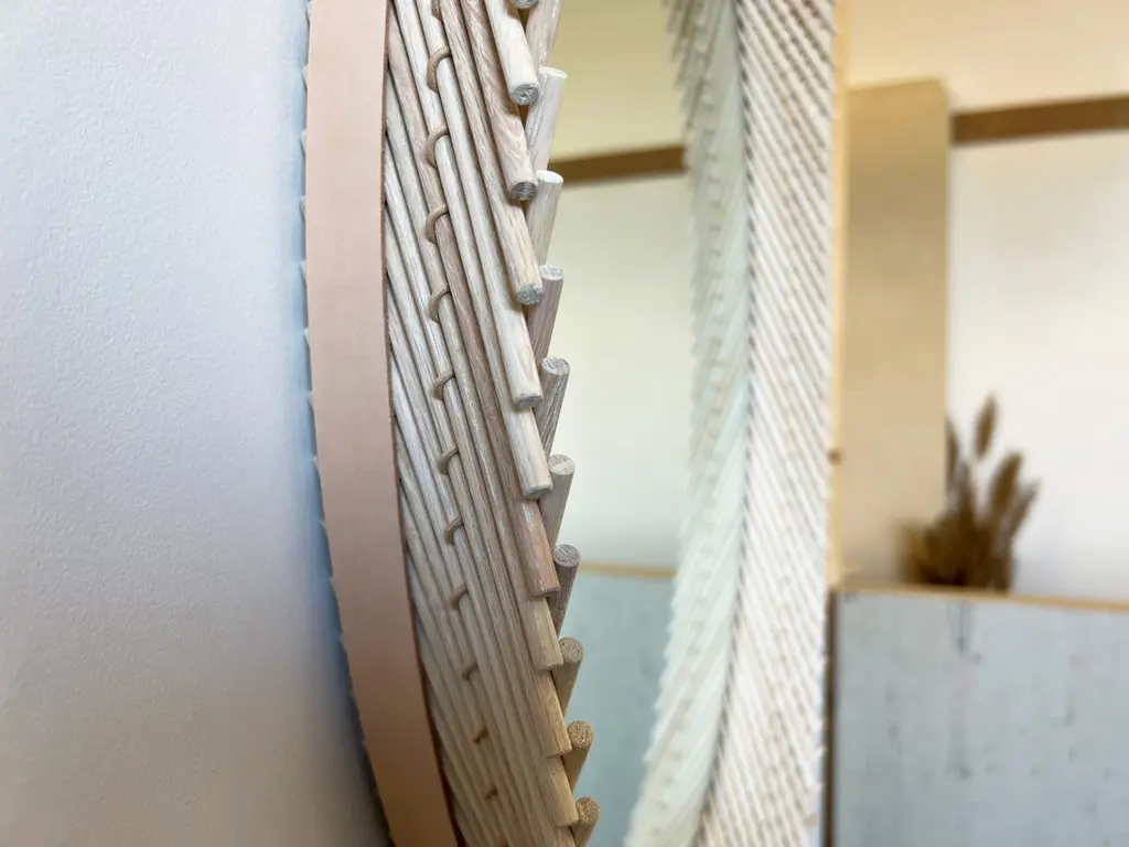 The Oval Mirror pushes the strict geometry that occurs as a result of stitching the dowels together to create a dynamic edge. Each layer of the Mooda rises and falls inversely to the other as they travel along the circumference of the mirror, giving the illusion of constant motion.Available in two American hardwoods, three standard sizes and a range of finishes, they are perfect for powder rooms, hallways or above a mantle.The Mooda Collection reimagines a traditional furniture building technique used for centuries across India into contemporary objects. Sticks of cane, bamboo or grass are stitched together with rope to create structural forms used as stools, chairs or tables. Every region has its own distinct style and variation of technique based on the materials available, making these stools both ubiquitous and individual in their origin. Learning this technique that has been passed down through generations, the Mooda Collection explores ways in which this process and the resulting form can be used beyond seating to develop contemporary objects.