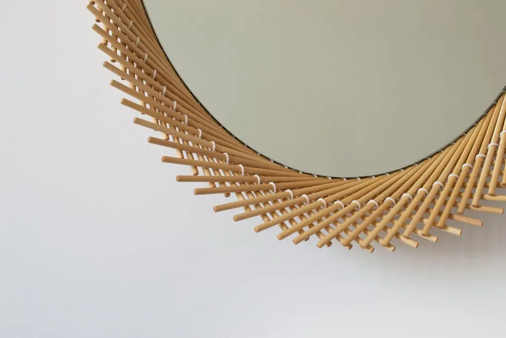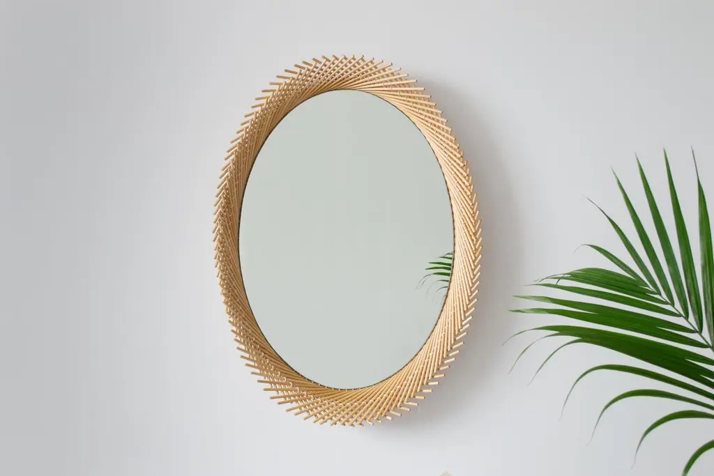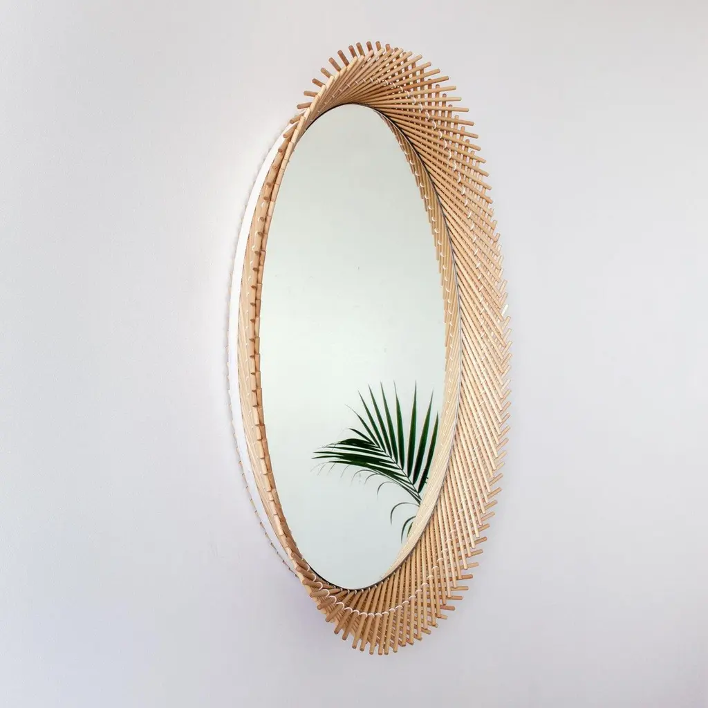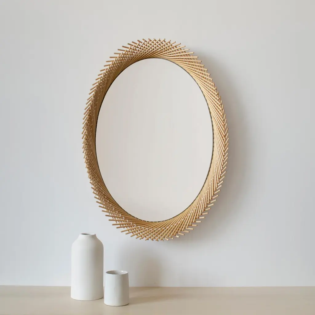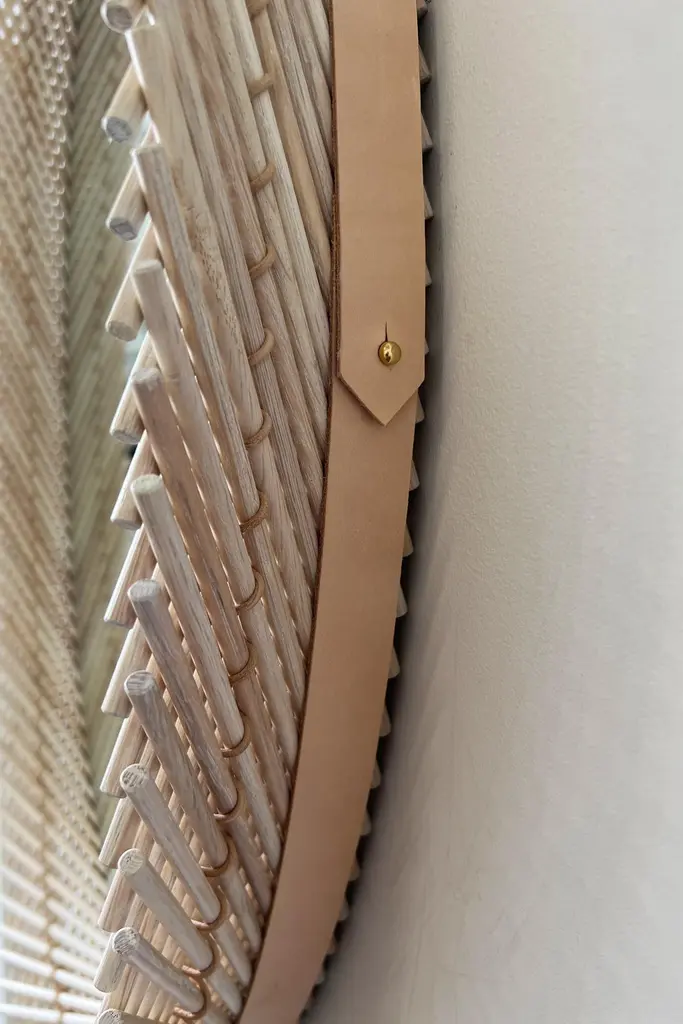 The Oval Mirror pushes the strict geometry that occurs as a result of stitching the dowels together to create a dynamic edge. Each layer of the Mooda rises and falls inversely to the other as they travel along the circumference of the mirror, giving the illusion of constant motion.Available in two American hardwoods, three standard sizes and a range of finishes, they are perfect for powder rooms, hallways or above a mantle.The Mooda Collection reimagines a traditional furniture building technique used for centuries across India into contemporary objects. Sticks of cane, bamboo or grass are stitched together with rope to create structural forms used as stools, chairs or tables. Every region has its own distinct style and variation of technique based on the materials available, making these stools both ubiquitous and individual in their origin.Learning this technique that has been passed down through generations, the Mooda Collection explores ways in which this process and the resulting form can be used beyond seating to develop contemporary objects.
