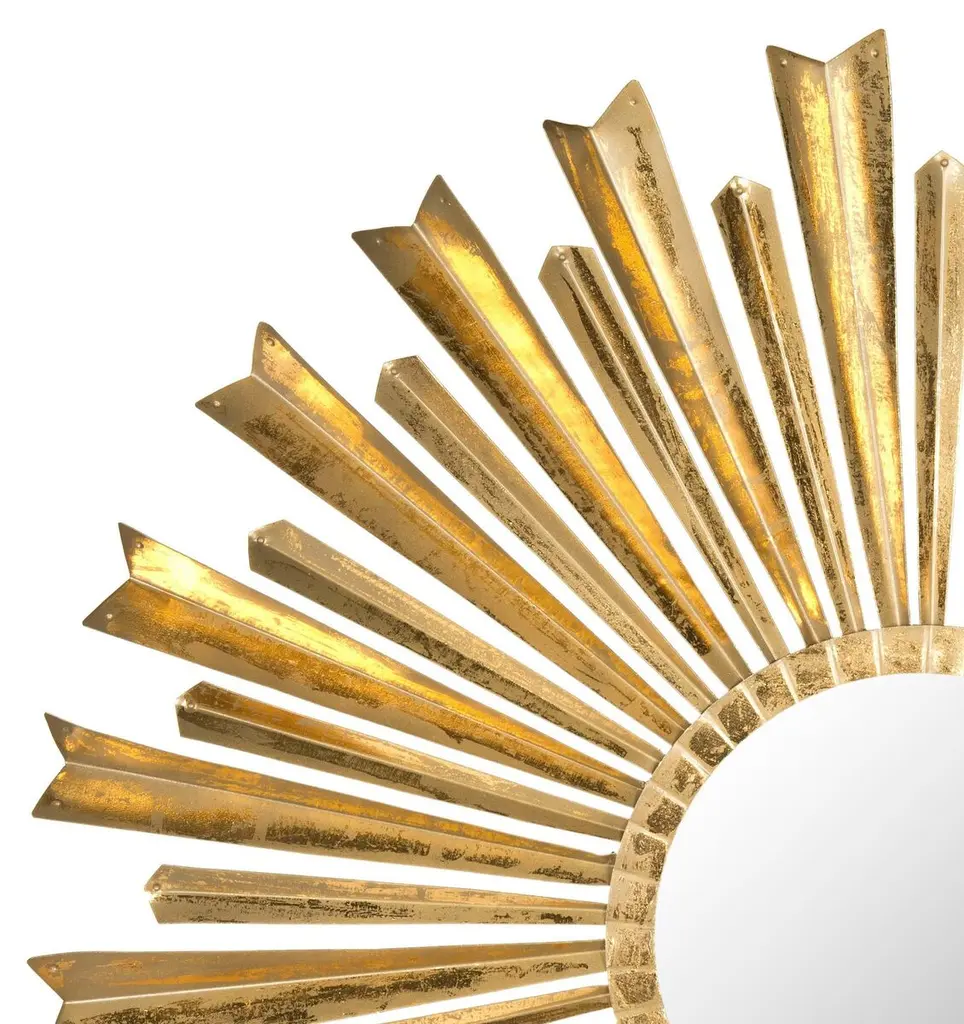 Add contemporary style to your space with this sunburst mirror. Crafted of iron with an antiqued-gold finish.