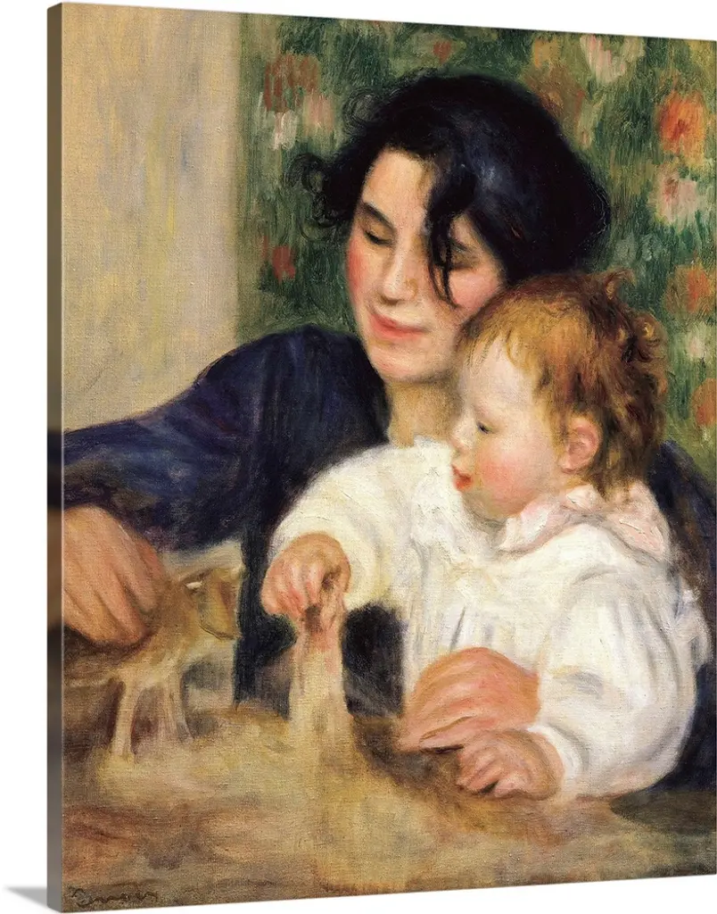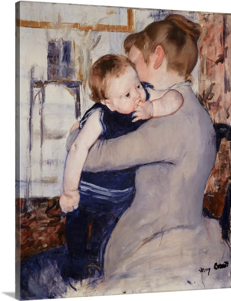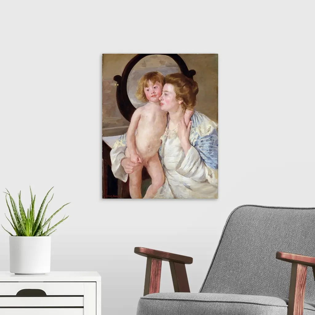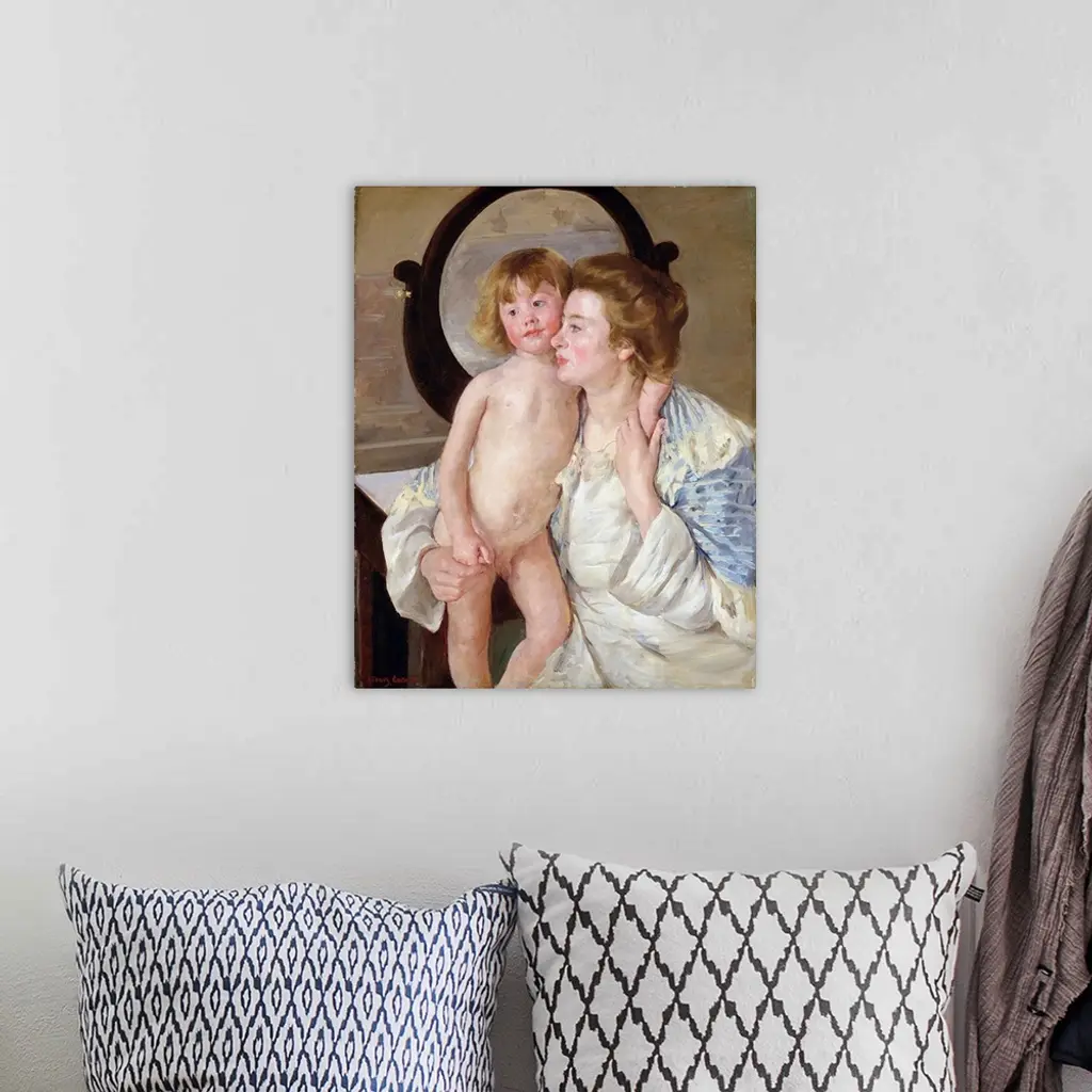 Here, Cassatt underscored the importance of the maternal bond by evoking religious art. The woman's adoring look and the boy's sweet face and contrapposto stance suggest Italian Renaissance images of the Virgin and Child, a connection reinforced by the oval mirror that frames the boy's head like a halo. Cassatt's colleague Edgar Degas perceived her references to the Renaissance, telling her that the painting has all of your qualities and all your faults-it's the Infant Jesus and his English nurse. The Havemeyers, who purchased the canvas for their collection, referred to it as The Florentine Madonna.