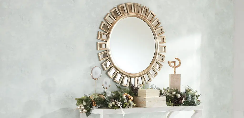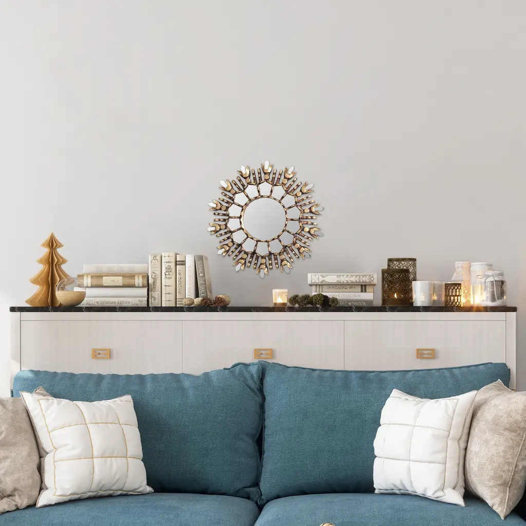 So contemporary with a deeply beveled mirror glass center surrounded by chunky, rectangular hand-antiqued rays. The frame is a modern cast resin with a very sculptural feel, finished in aged silver with a gold wash.