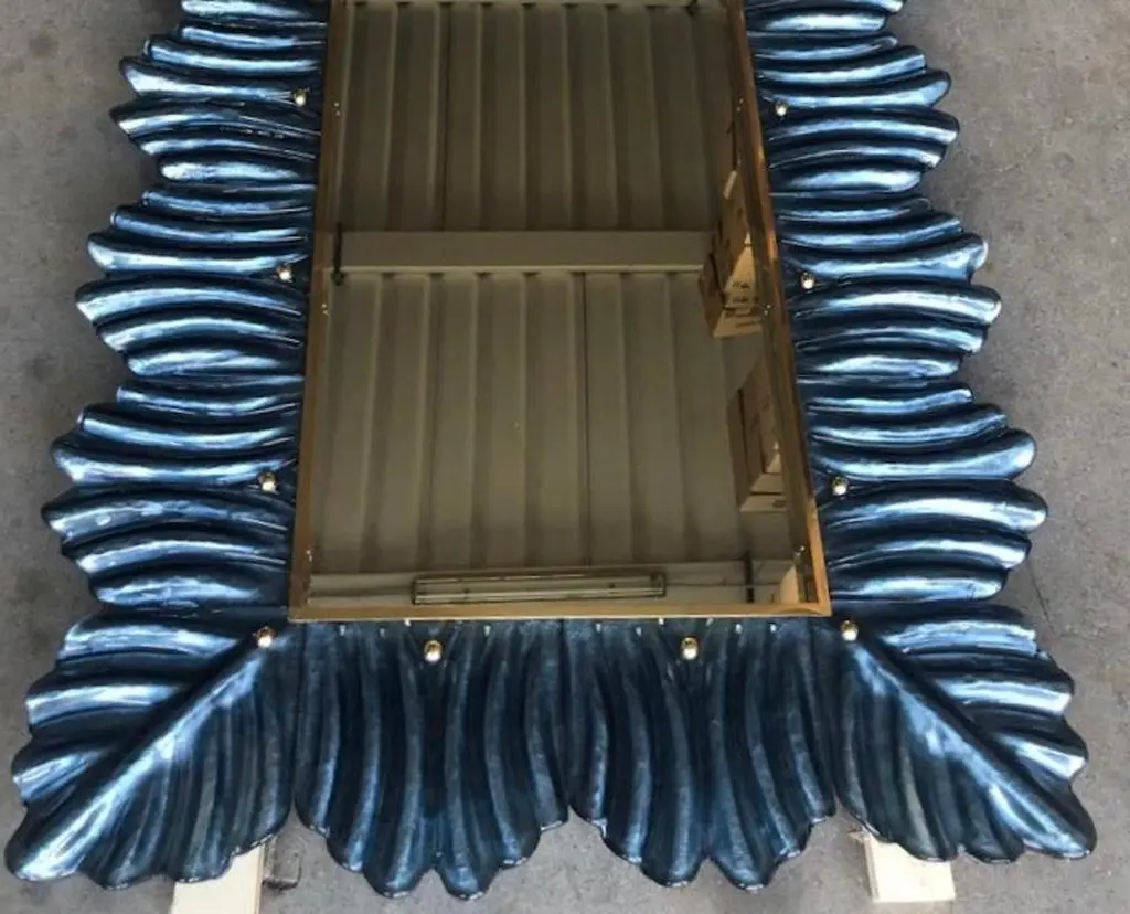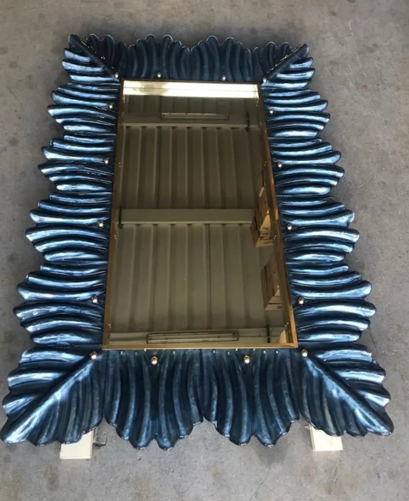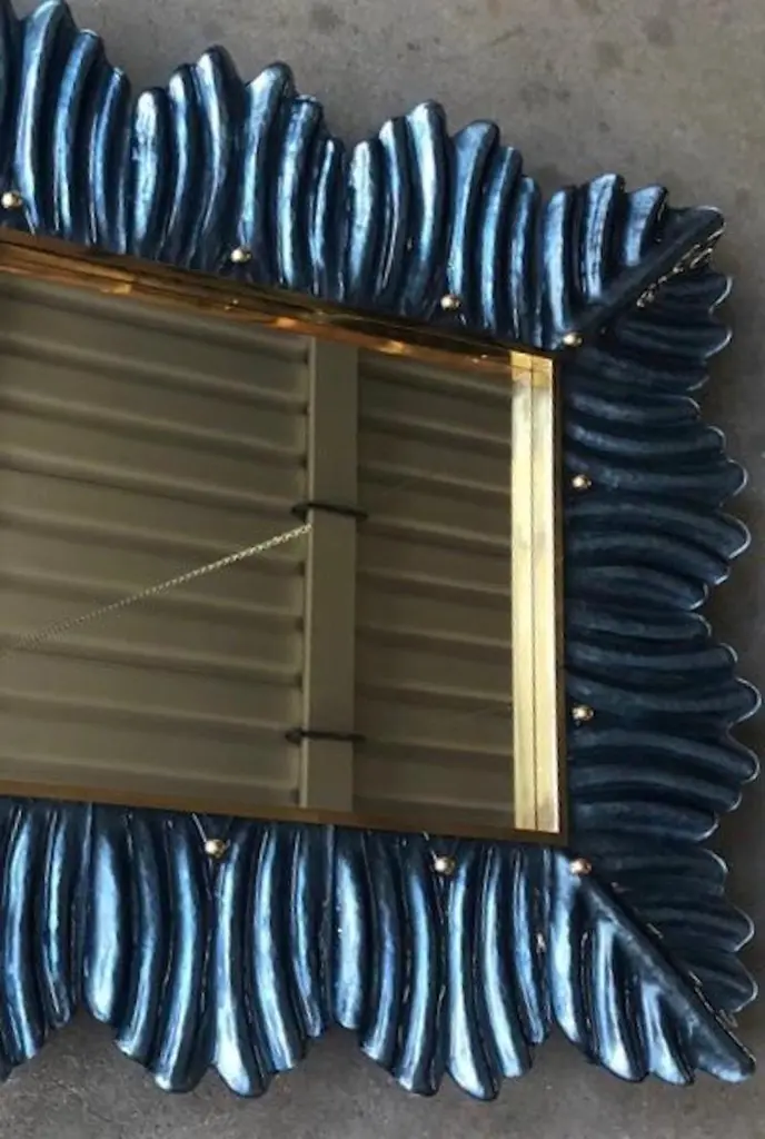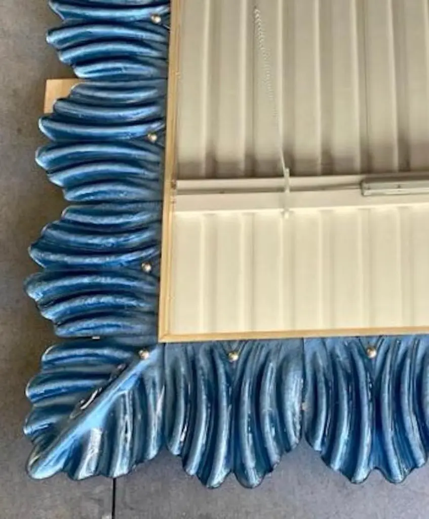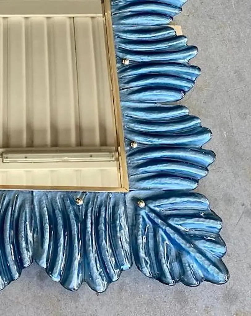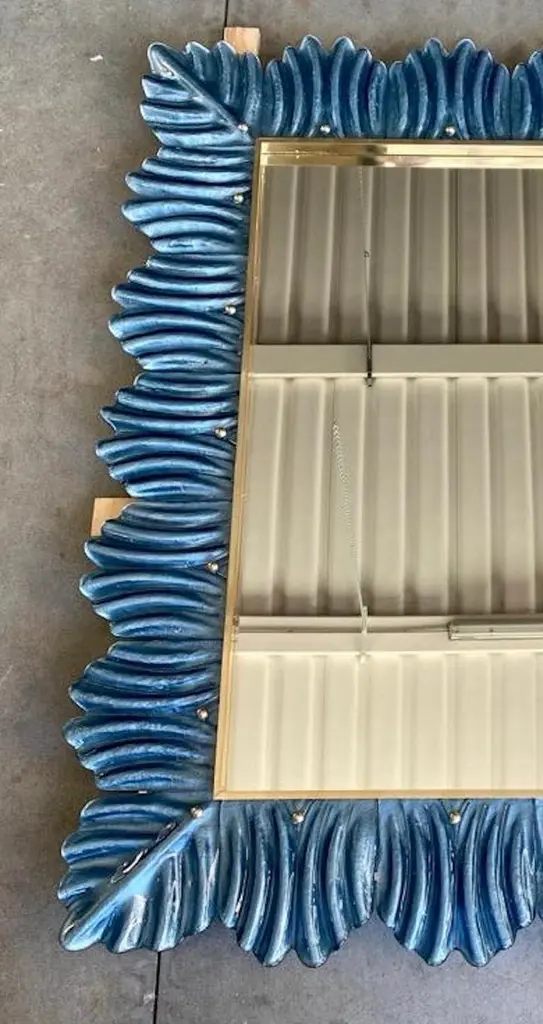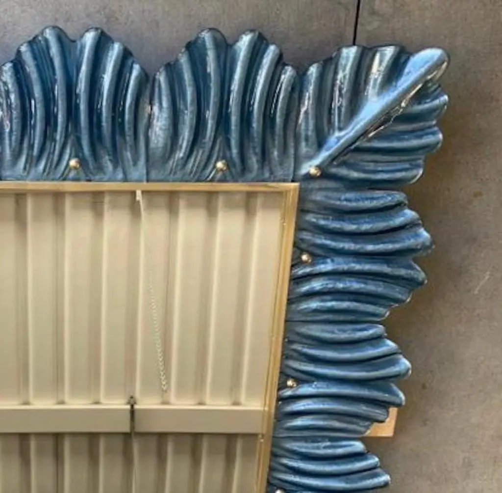 A strong blu color frame, reach the eye of the beholder, leaving him entranced; of Murano blu art glass wall mirror. Beautifully shaped and of excellent size, the wall mirror is a real design object.The structure of the wall mirror is in wood, where the blu color Murano glass is housed. The frame of the mirror is made up of a series of bricks, positioned one next to the other. The bricks are made of Murano glass in blu color, and the back of the bricks rests on the plane of the frame, to enhance the blu color. Along the perimeter of the bricks, internally, some burnished brass moldings have been placed. It can be mounted both horizontally and vertically.Wear consistent with age and use. Each item offered by the HannauRoma warehouse is checked by our team of craftsmen. We guarantee a very high quality standard, ask our design specialists for detailed information.