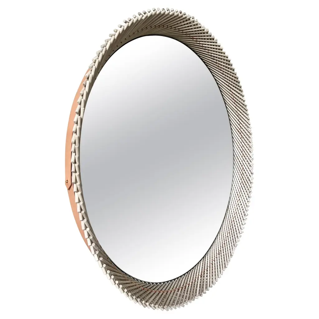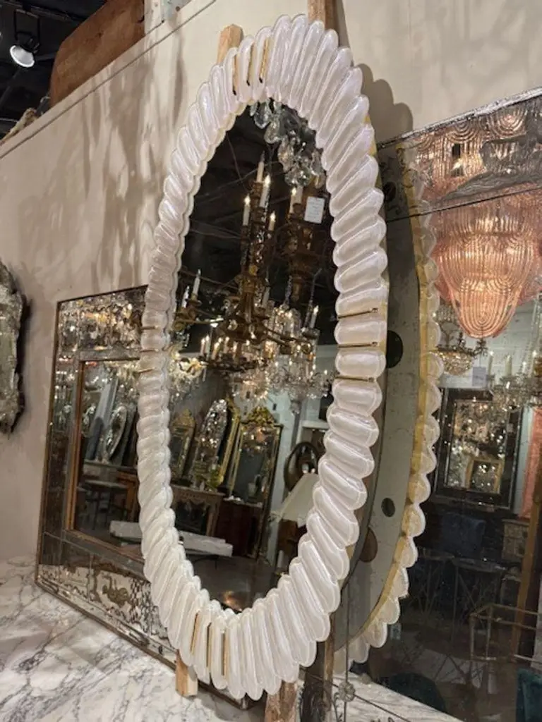 Modern Murano oval "bubble" mirror in frost white. These mirrors are perfect for anchoring a foyer, flanking a console, or adding luminous texture to a gallery wall. 31w x 48h