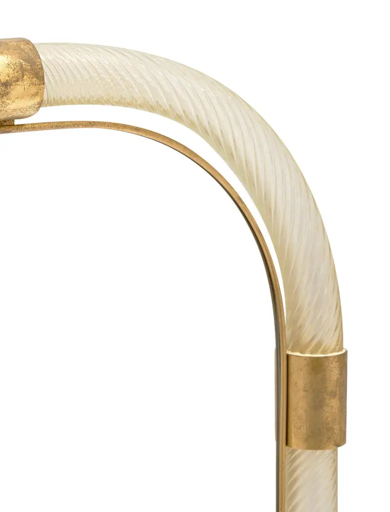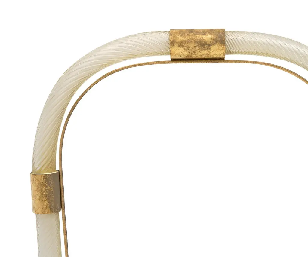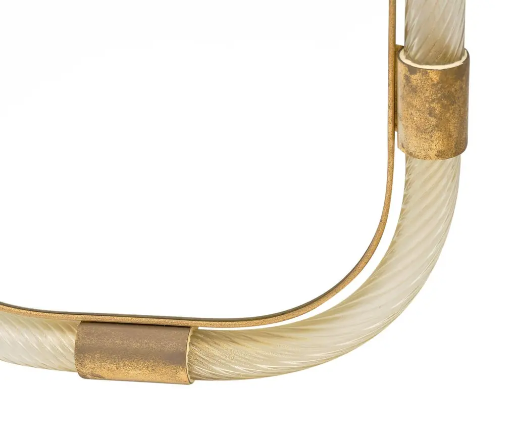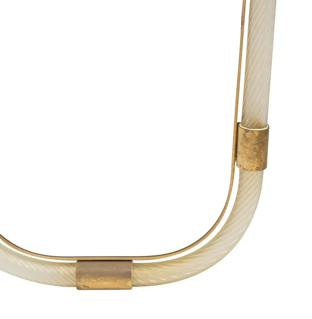 Murano glass and brass “torsado” mirror by Giuliano Fuga. We love the brass framed oblong glass mirror surrounded by hand blown “torsado” glass with 23 carat gold fused within. A striking mirror!This mirror is currently a special order from Italy. Please contact us for a lead time.