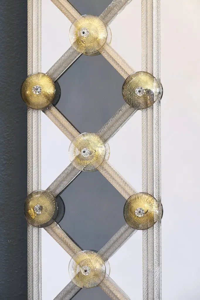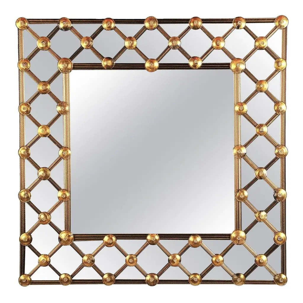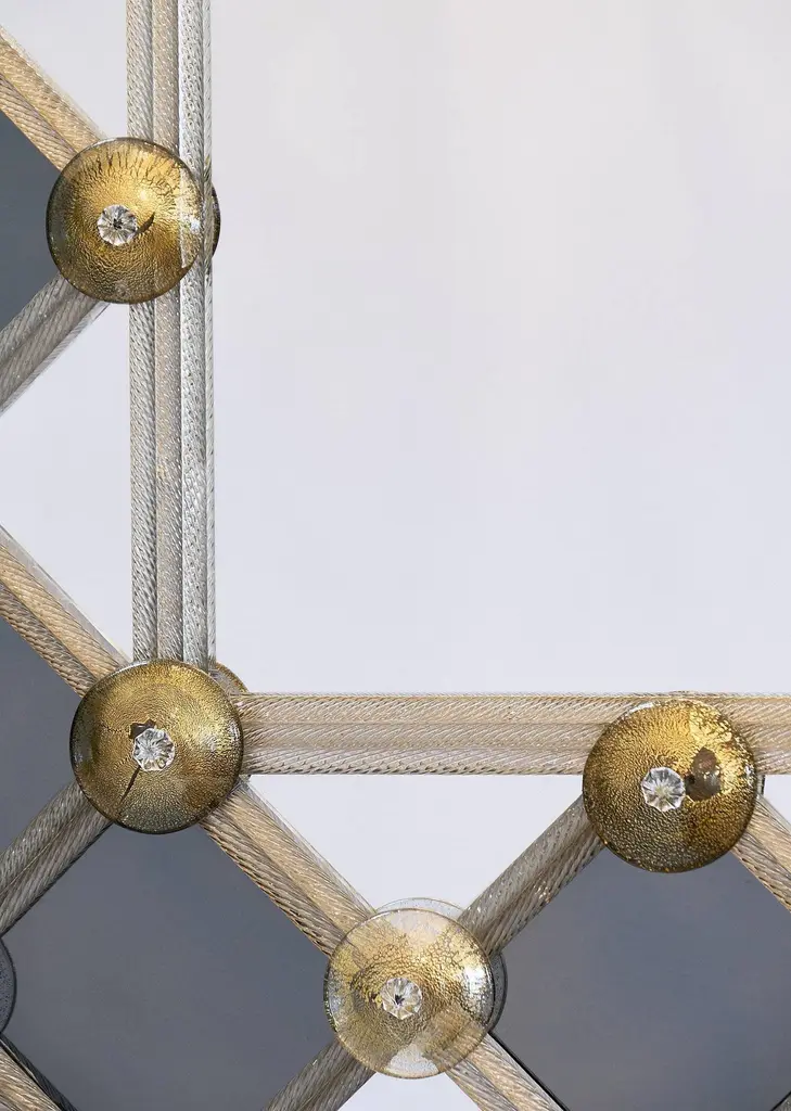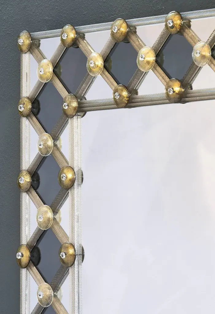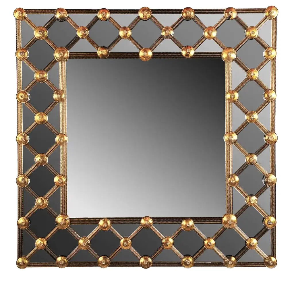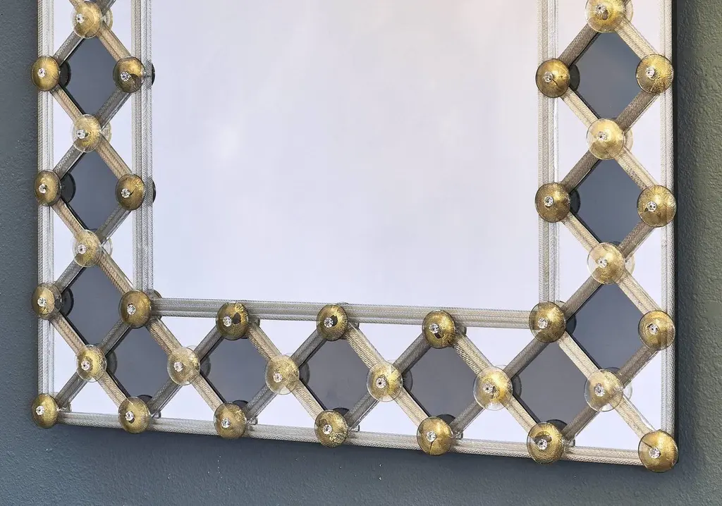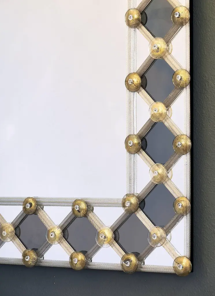 Mirror made of Murano glass. This striking piece has a frame with Avventurina gold leaf glass and smoked diamond shaped pieces of mirror. The lattice pattern draws the eye to the centre. This is a very lovely piece with great decorative impact in any space. We love the geometric, modernist feel of the piece and the perfect execution by the best mirror manufacturer on the island of Murano.