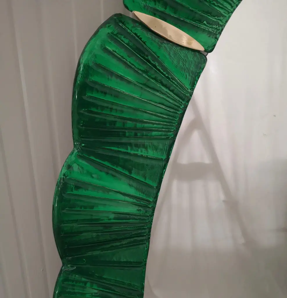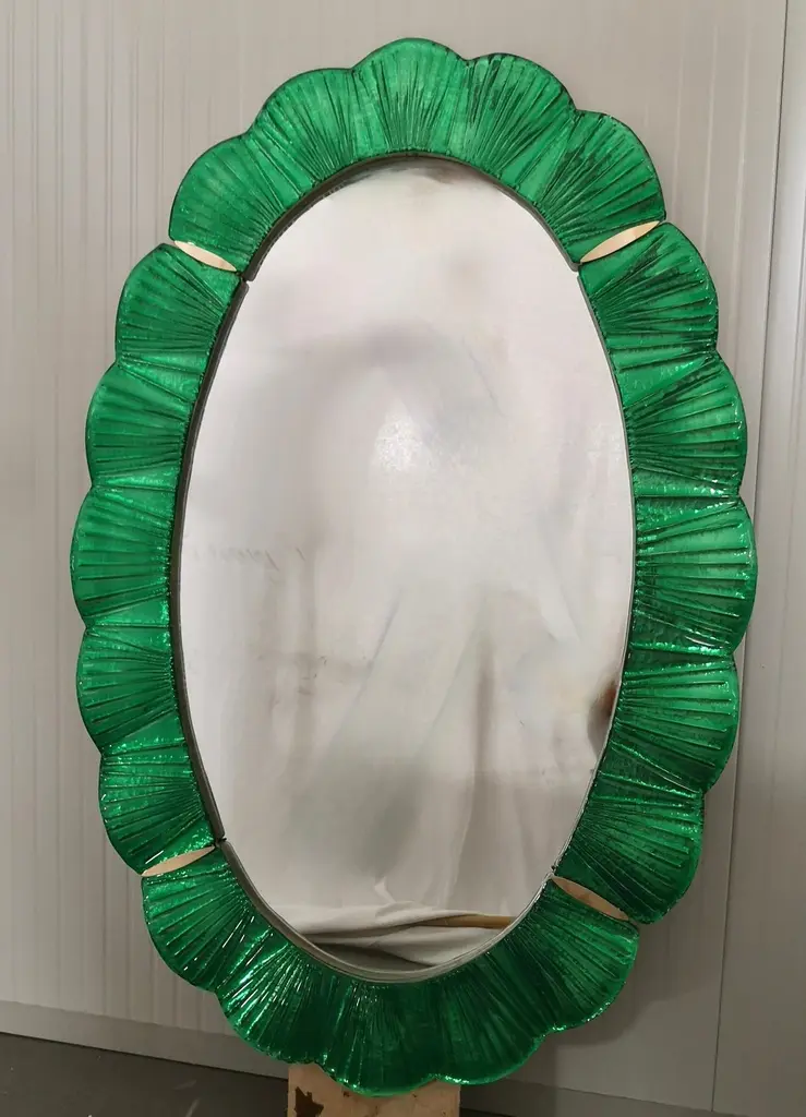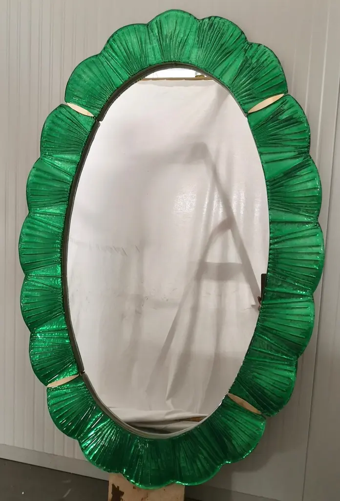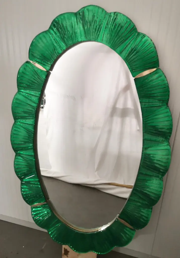 Stunning mirror in blazing green color Murano glass, Venice. A mirror that alone will furnish your home environment.The mirror has a rear structure in wood, on which four Murano glass sections are mounted to form an oval as in the photograph. The single section is made up of a series of petals placed next to each other. The mirror is oval in shape and can be mounted both horizontally and vertically. Murano glass is green in color mirrored behind. Note that in the parts of the four vertices there are brass inserts, among the many leaves. Refinement and style as it is in the style of Murano, one-of-a-kind pieces that always remain precious.
