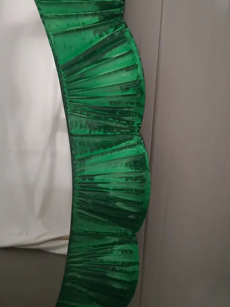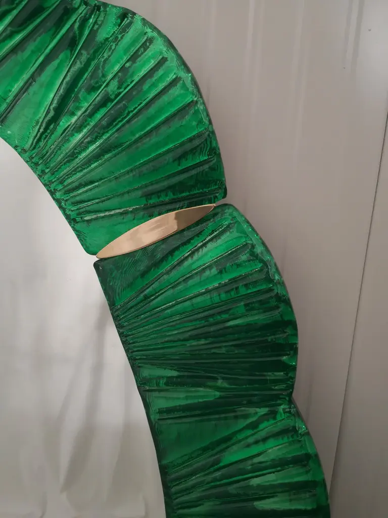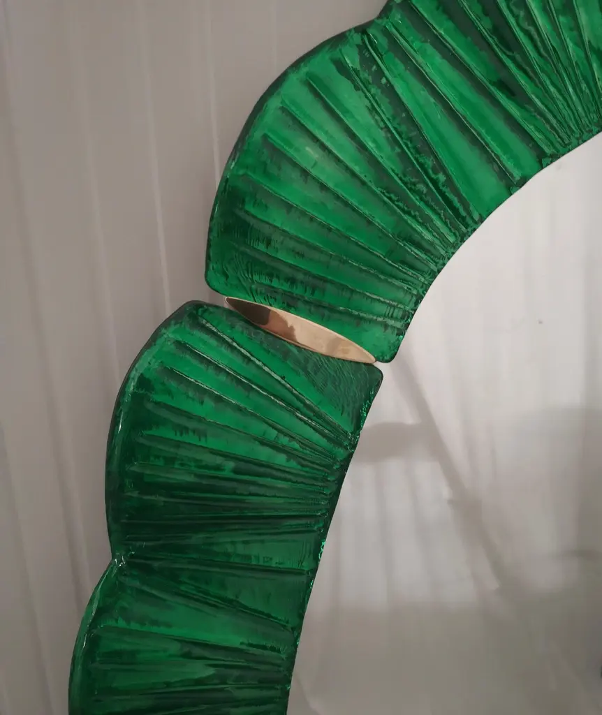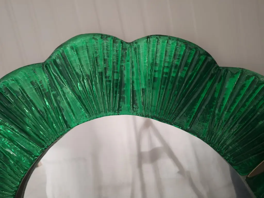 Stunning mirror in blazing green color Murano glass, Venice. A mirror that alone will furnish your home environment.The mirror has a rear structure in wood, on which four Murano glass sections are mounted to form an oval as in the photograph. The single section is made up of a series of petals placed next to each other. The mirror is oval in shape and can be mounted both horizontally and vertically. Murano glass is green in color mirrored behind. Note that in the parts of the four vertices there are brass inserts, among the many leaves. Refinement and style as it is in the style of Murano, one-of-a-kind pieces that always remain precious.