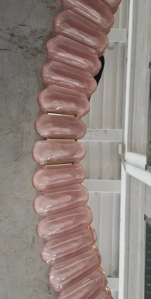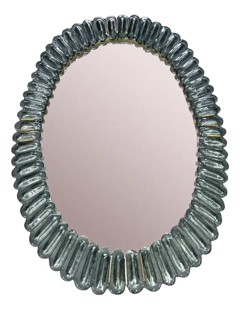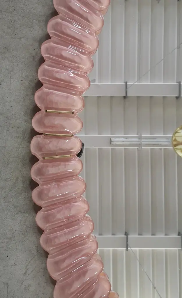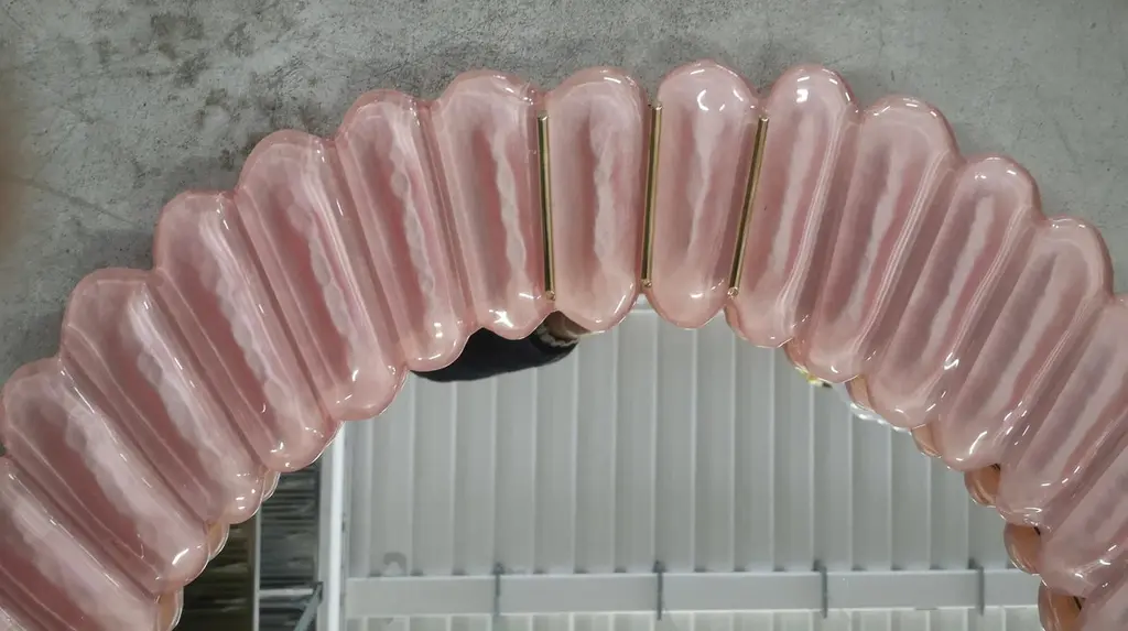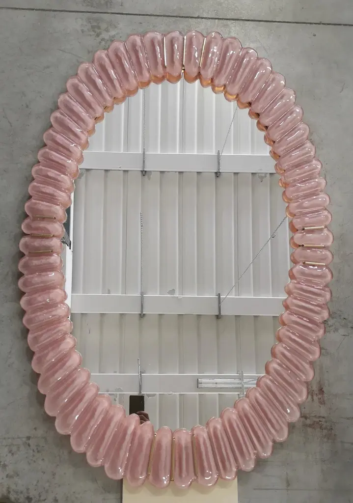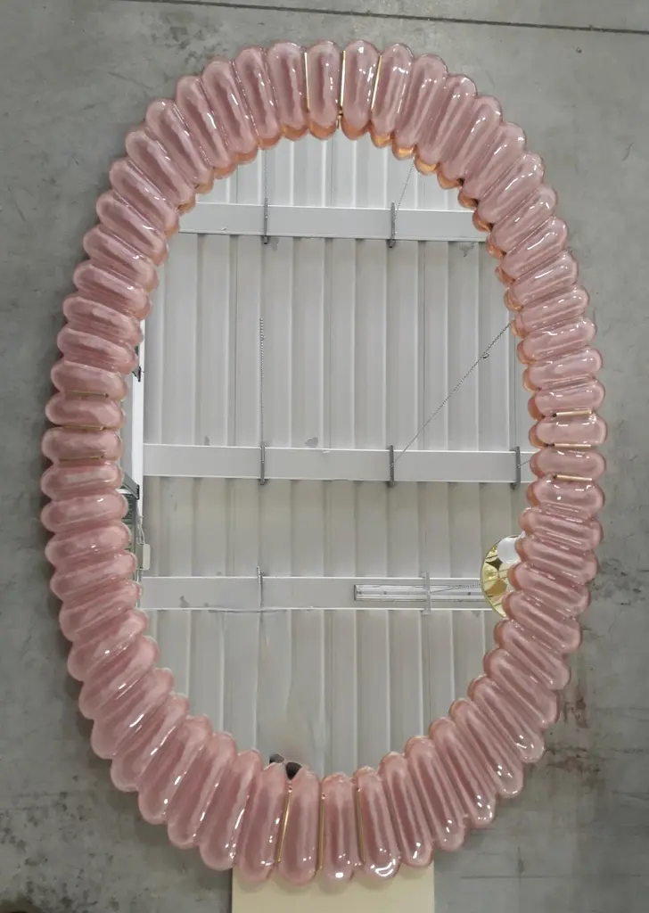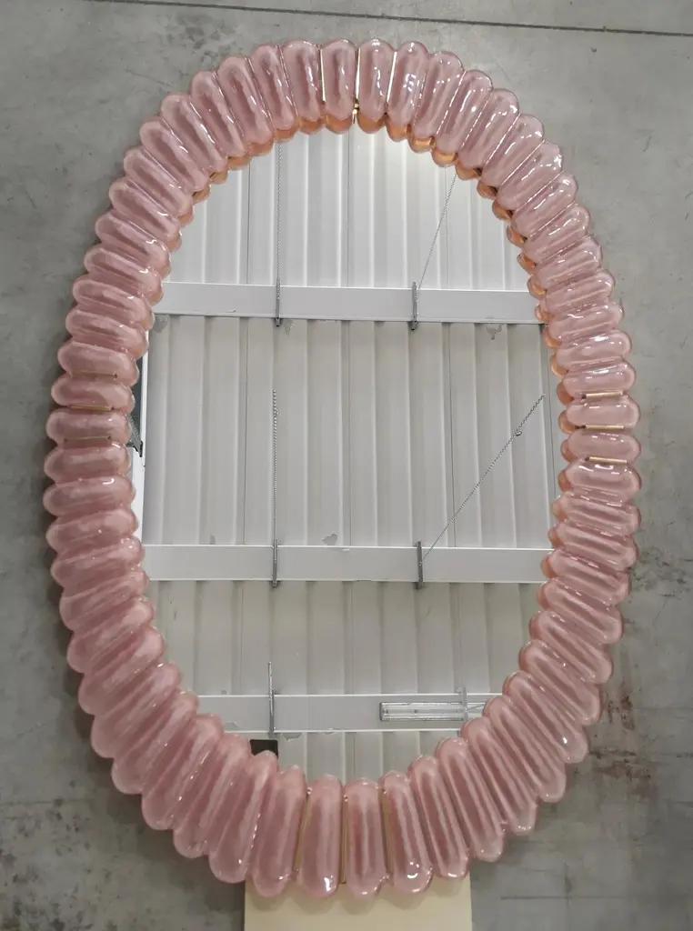 Stunning mirror in blazing pink color Murano glass, Venice. A mirror that alone will furnish your home environment.The mirror has a rear structure in wood, on which four Murano pink glass sections are mounted to form an oval as in the photograph. The single section is made up of a series of petals placed next to each other. The mirror is oval in shape and can be mounted both horizontally and vertically. Murano glass is pink in color mirrored behind. Note that in the parts of the four vertices there are brass inserts, among the many leaves. Refinement and style as it is in the style of Murano, one-of-a-kind pieces that always remain precious.