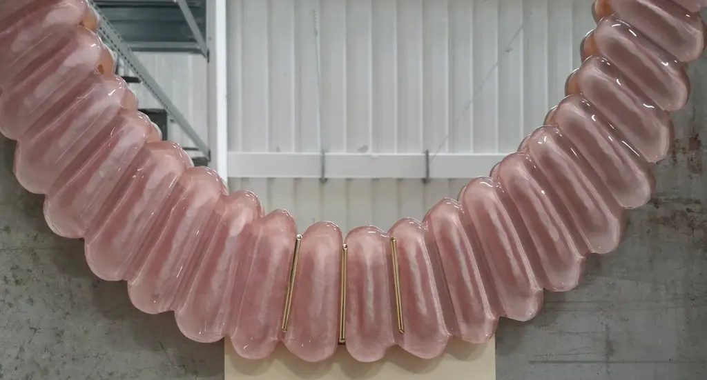 Murano Oval Pink Art Glass And Brass Mid-Century Console / Wall Mirror, 2020