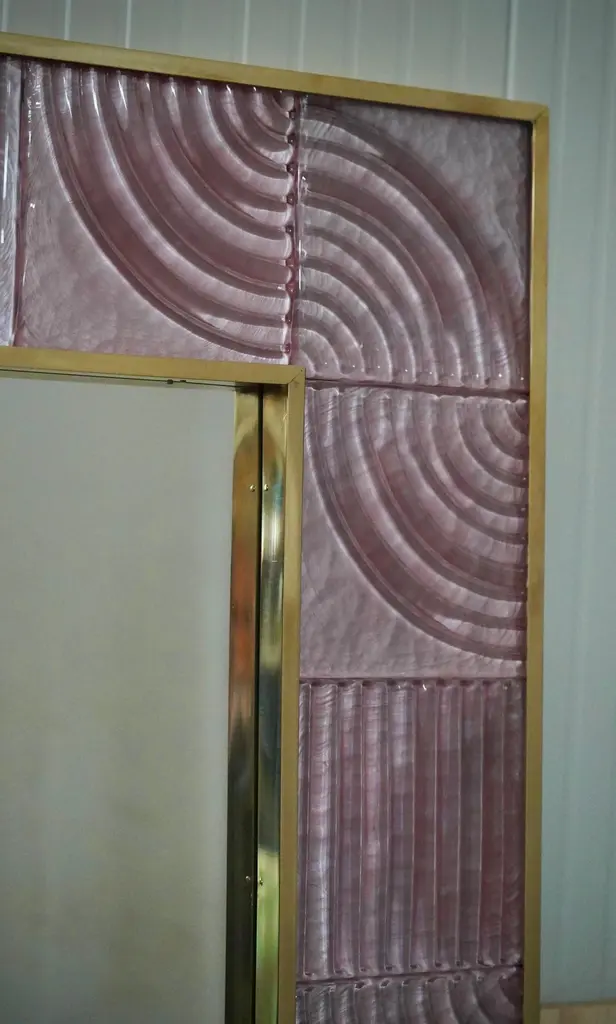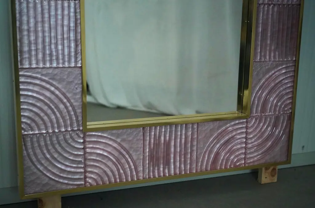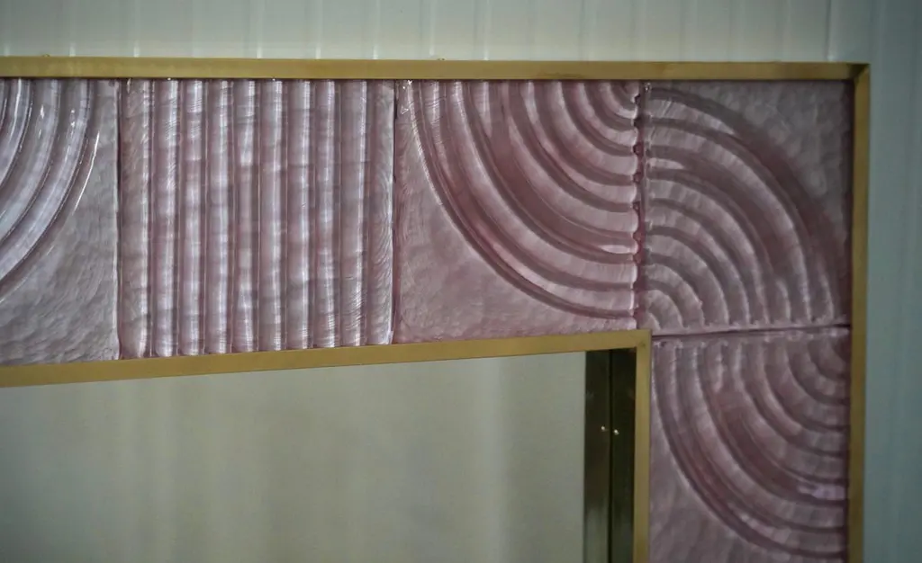 A sturdy pink frame captures the gaze of those who observe it, leaving them in ecstasy. The Murano furnaces create an indisputable and timeless design, simple but elegant at the same time.The structure of the wall mirror is made of wood, where the pink Murano glass is housed. The frame of the mirror is composed of a series of square bricks, positioned next to each other. The bricks are made of pink Murano glass. Brass moldings have been inserted along the perimeter of the bricks, both internally and externally. It can be mounted both horizontally and vertically. Created for our HannauRoma store, the wall mirrors are unique and original in their kind.Wear consistent with age and use. Each item offered by the HannauRoma warehouse is checked by our team of craftsmen. We guarantee a very high quality standard, ask our design specialists for detailed information.