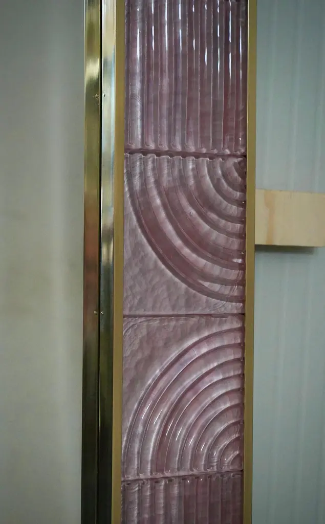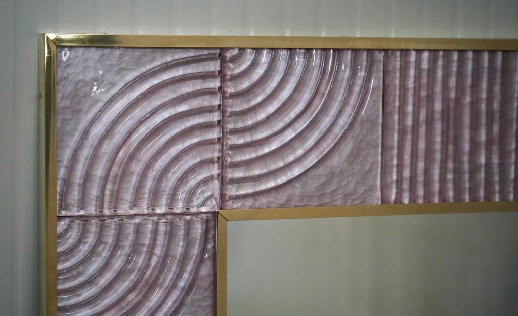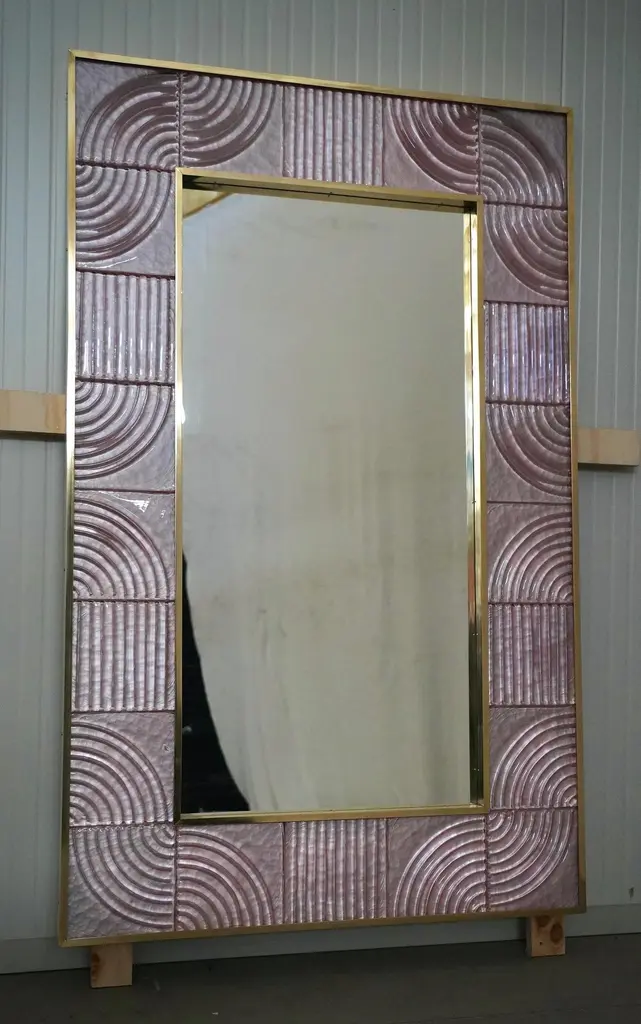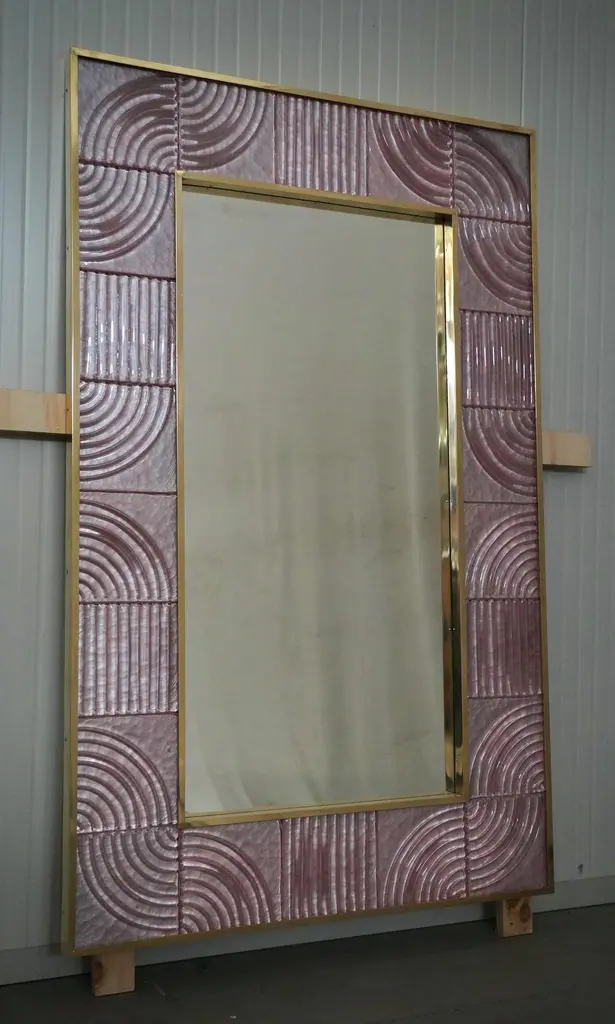 A sturdy pink frame captures the gaze of those who observe it, leaving them in ecstasy. The Murano furnaces create an indisputable and timeless design, simple but elegant at the same time.The structure of the wall mirror is made of wood, where the pink Murano glass is housed. The frame of the mirror is composed of a series of square bricks, positioned next to each other. The bricks are made of pink Murano glass. Brass moldings have been inserted along the perimeter of the bricks, both internally and externally. It can be mounted both horizontally and vertically. Created for our HannauRoma store, the wall mirrors are unique and original in their kind.Wear consistent with age and use. Each item offered by the HannauRoma warehouse is checked by our team of craftsmen. We guarantee a very high quality standard, ask our design specialists for detailed information.