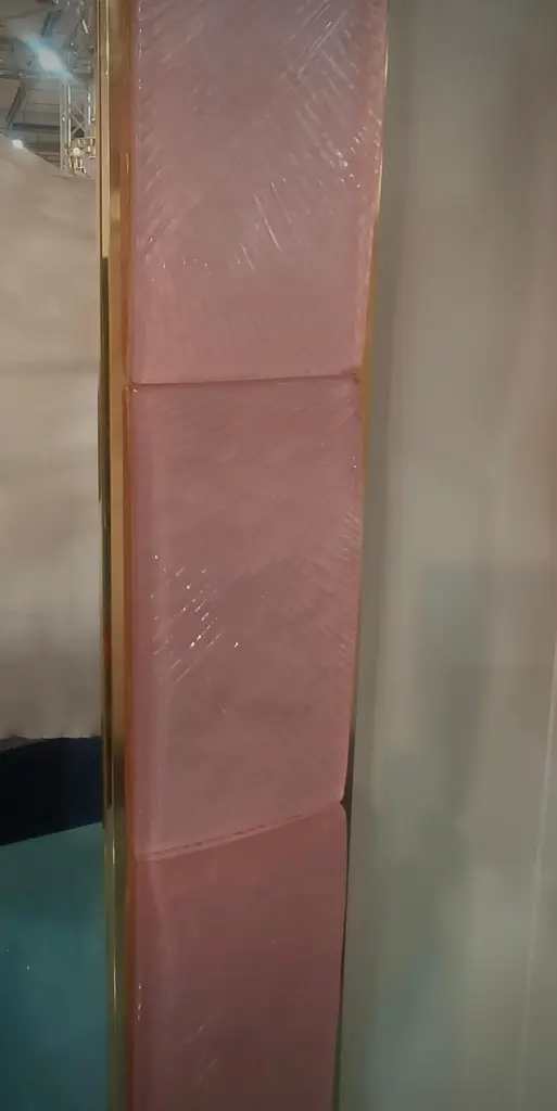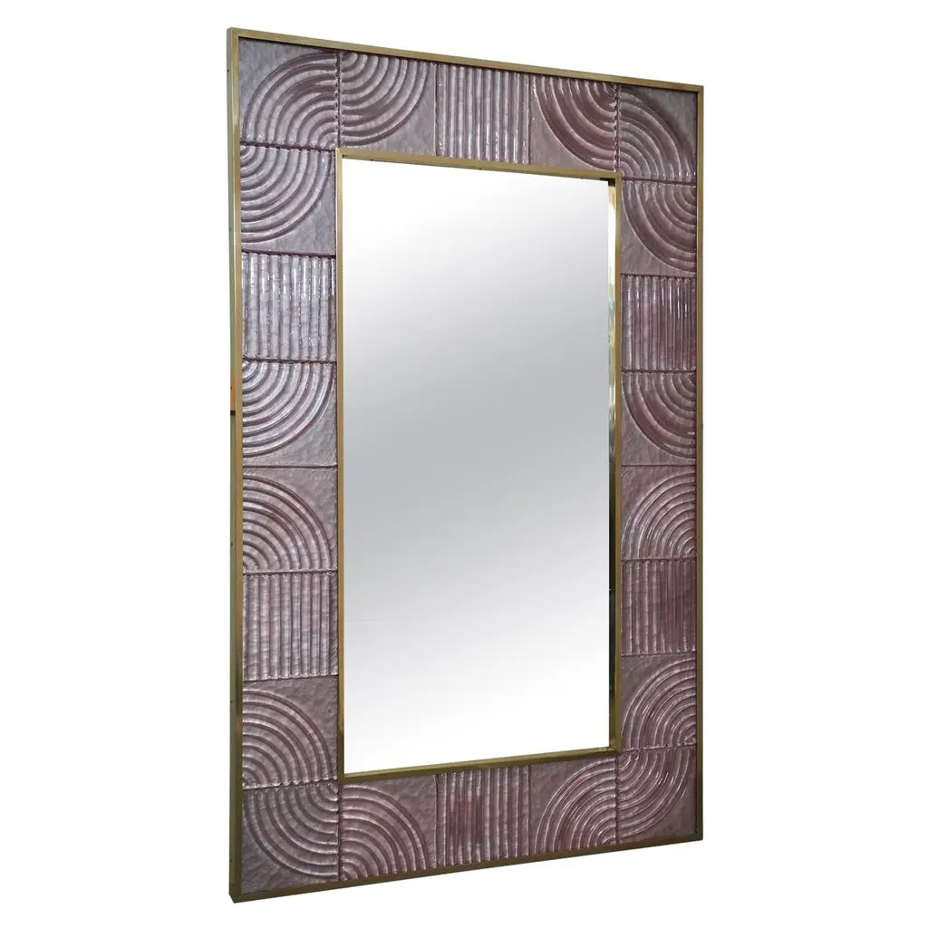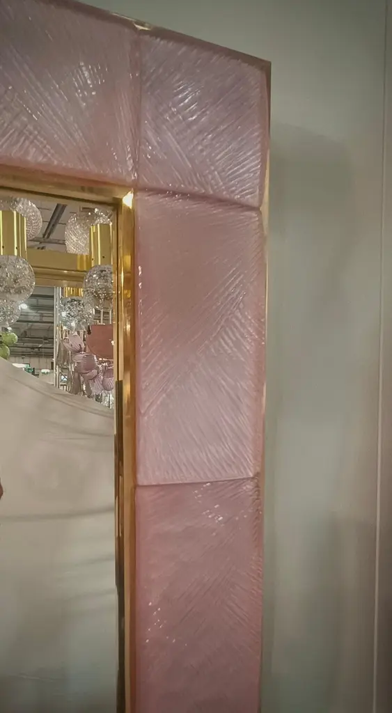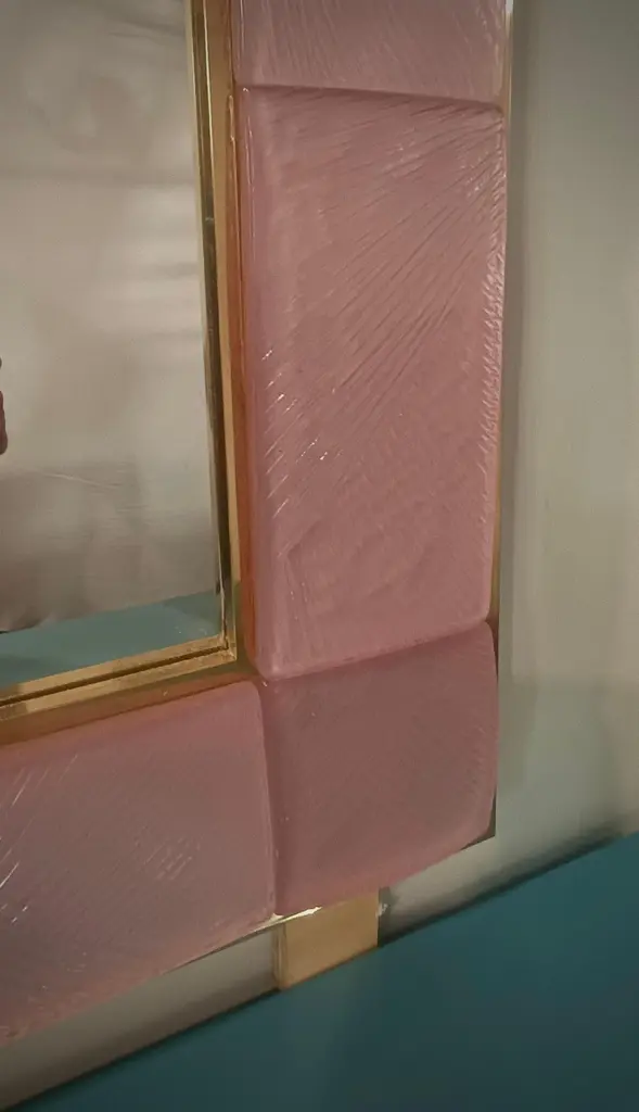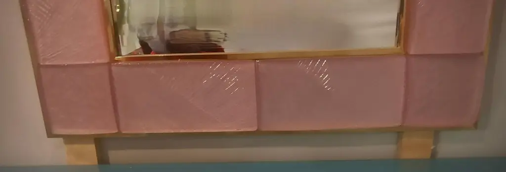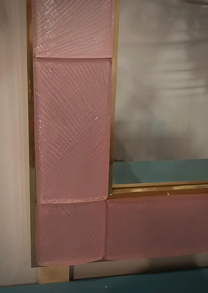 A sturdy pink frame reaches the eye of the beholder, leaving him in ecstasy. The Murano furnaces create an indisputable and timeless design, simple but elegant at the same time.The structure of the wall mirror is made of wood, where the pink Murano glass is housed. The frame of the mirror is composed of a series of bricks, positioned one next to the other. The bricks are made of pink Murano glass. Some brass moldings have been placed along the perimeter of the bricks, both internally and externally. It can be mounted both horizontally and vertically. Created for our Hannauroma store, the wall mirrors are unique and original in their kind.Wear consistent with age and use. Each item offered by the HannauRoma warehouse is checked by our team of craftsmen. We guarantee a very high quality standard, ask our design specialists for detailed information.