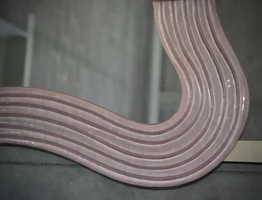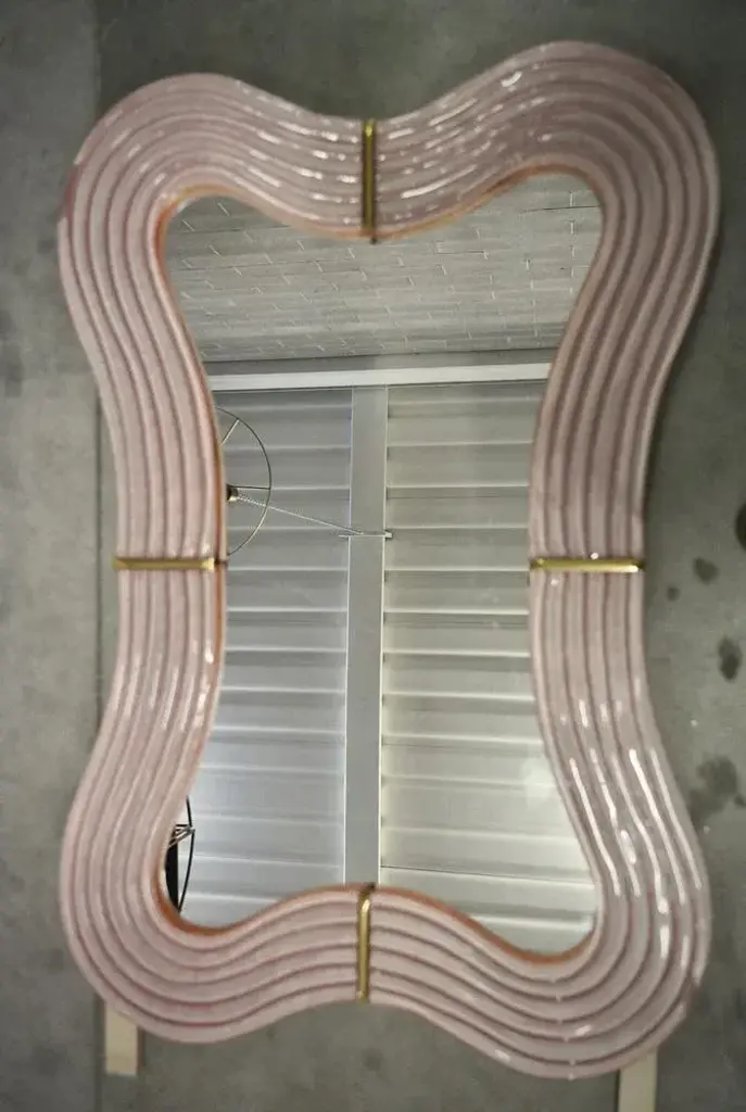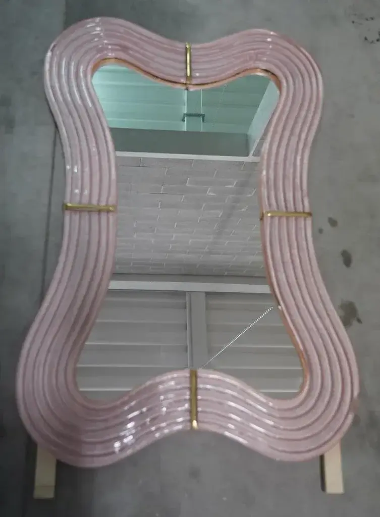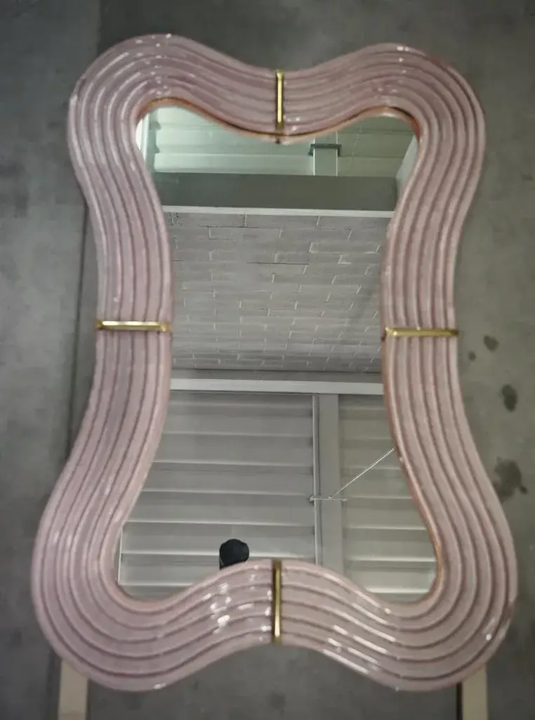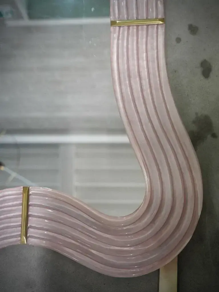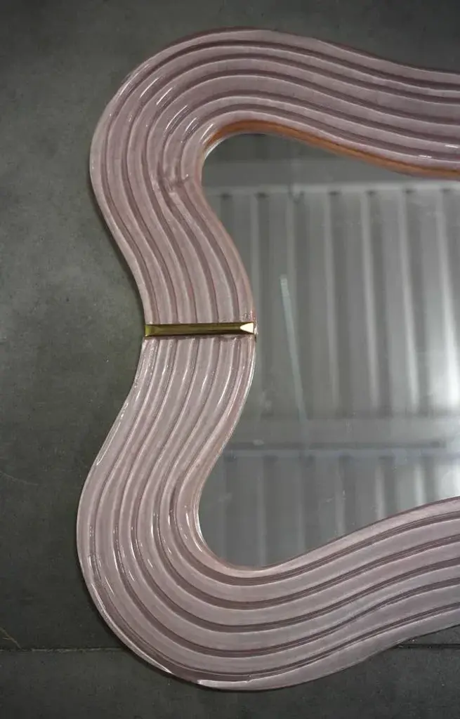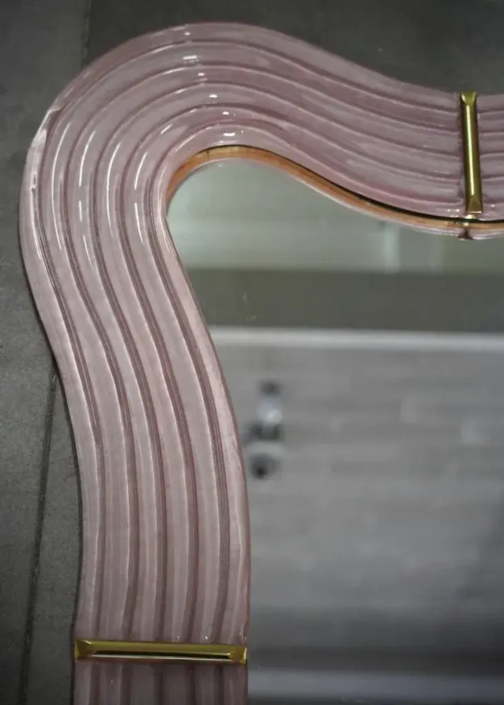 Splendid wall mirror in fiery Murano glass in pearl pink color from Venice. A mirror that alone will furnish your home environment. The Murano furnaces create an indisputable timeless design, simple but elegant at the same time. The mirror is composed of a perimeter frame in pink Murano glass, which forms curves in its design, interspersed with brass mouldings. The glass is also not smooth but forms beautiful horizontal undulations around the perimeter. Its design is interesting, which gives movement and lightness to the frame. Refinement and class as in the Murano style, one-of-a-kind pieces that always remain precious. Wear consistent with age and use. Every item the warehouse Hannau Roma offers is checked by our team of craftsmen.