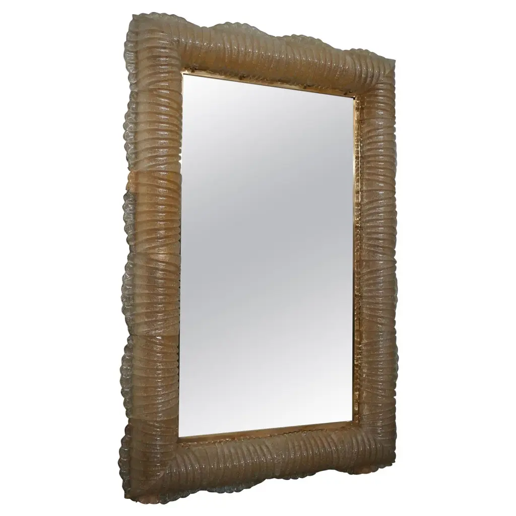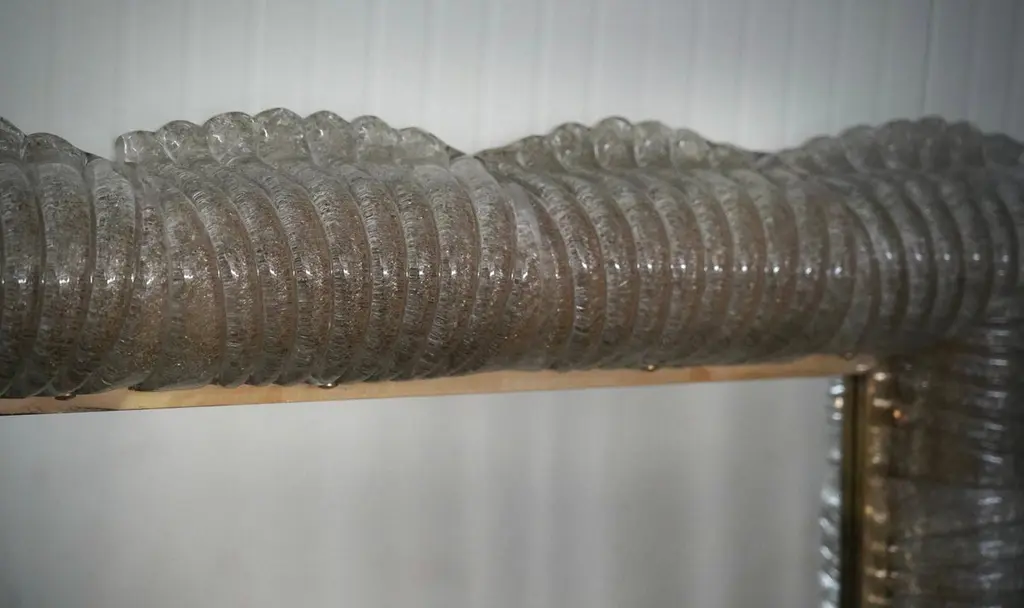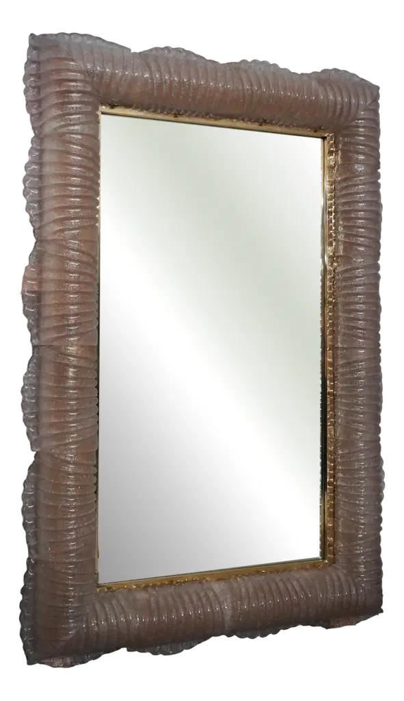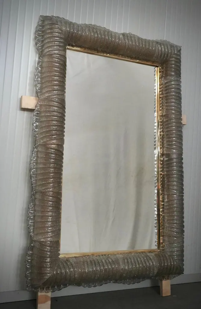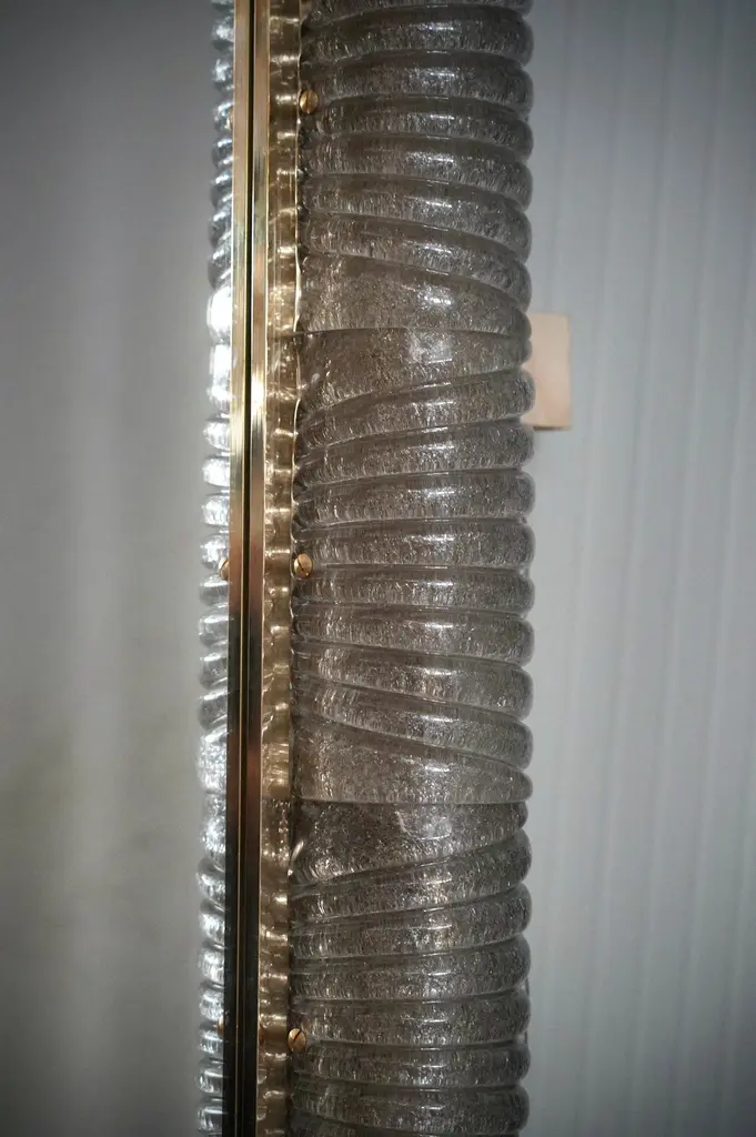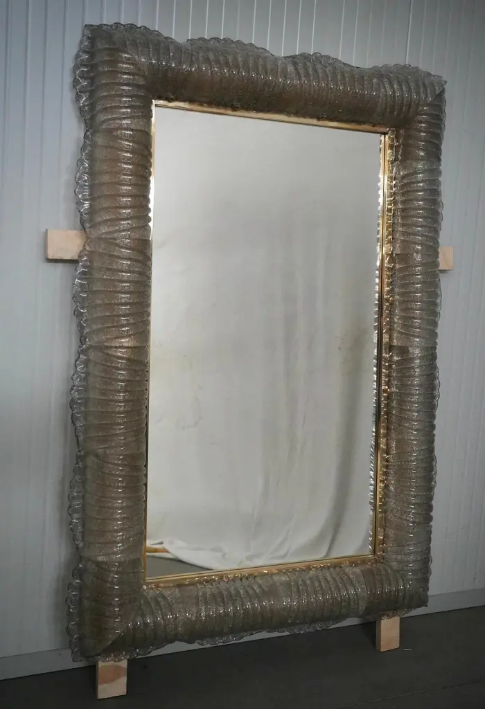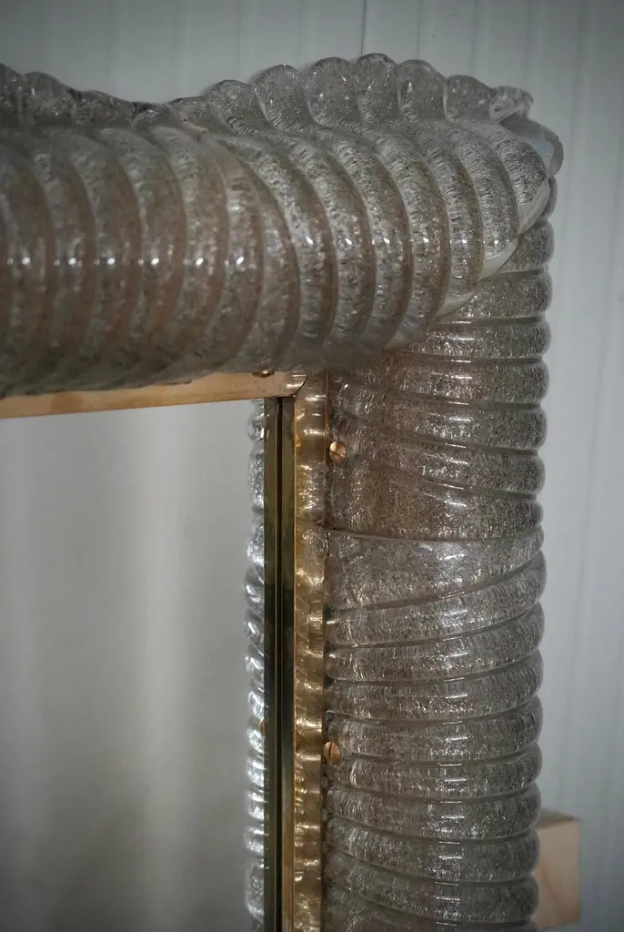 A sturdy smoky-colored frame captures the eye of the observer, leaving him enchanted: it is a wall mirror in smoky-colored Murano artistic glass that lights up internally.The structure of the wall mirror is made of wood, along whose edge is housed the smoky-colored Murano glass, attached with small brass screws. The frame of the mirror is composed of a series of tiles, positioned next to each other. The tiles are made of smoky-colored Murano glass with grit inside; the tiles positioned next to each other form a kind of tunnel, where the light is positioned internally, as can be seen from the photos (there are 12 G9 LED lights all around). Along the perimeter of the tiles, both internally and externally, brass moldings have been inserted. It can be mounted both horizontally and vertically. Created for our Hannauroma store, the wall mirror is unique and original in its kind.WE RECOMMEND USING G9 LED LIGHTS.
