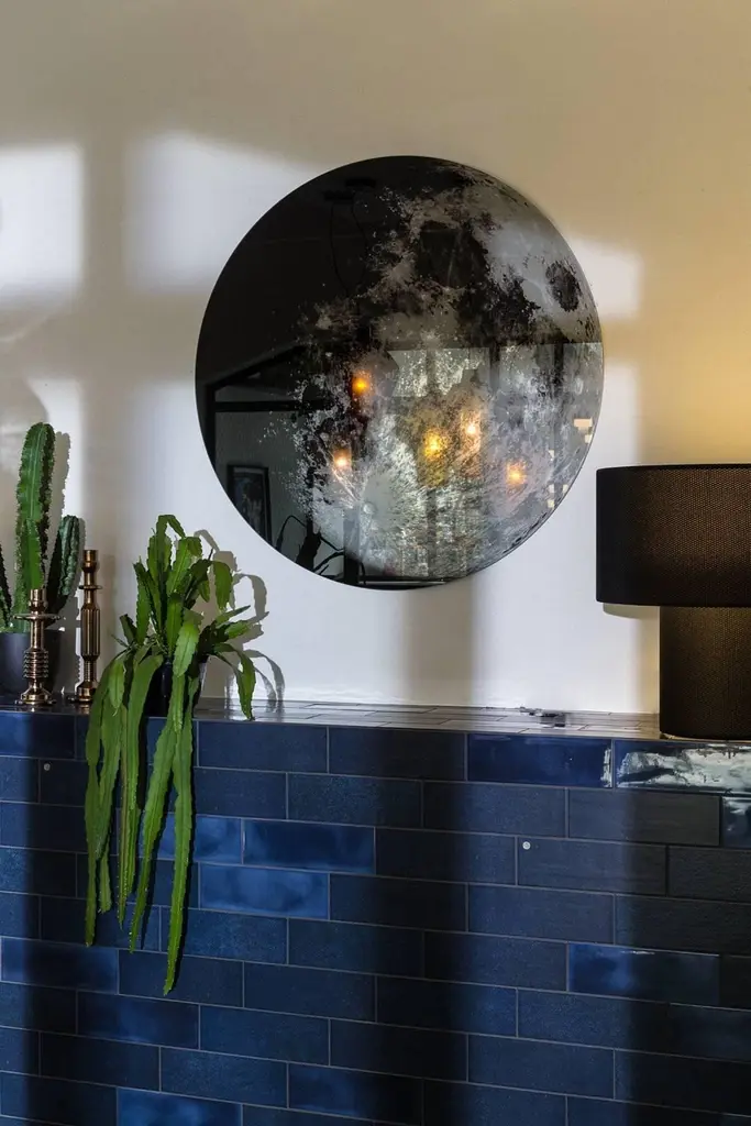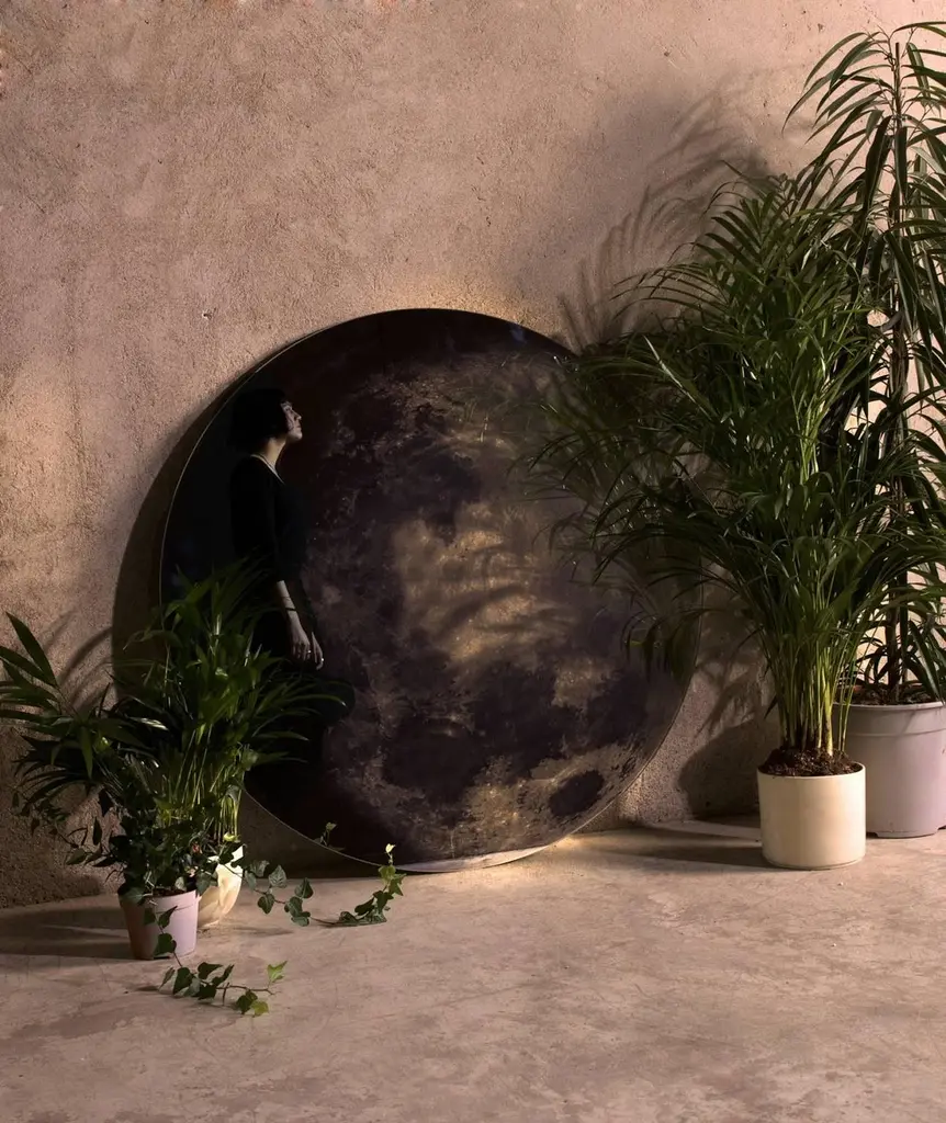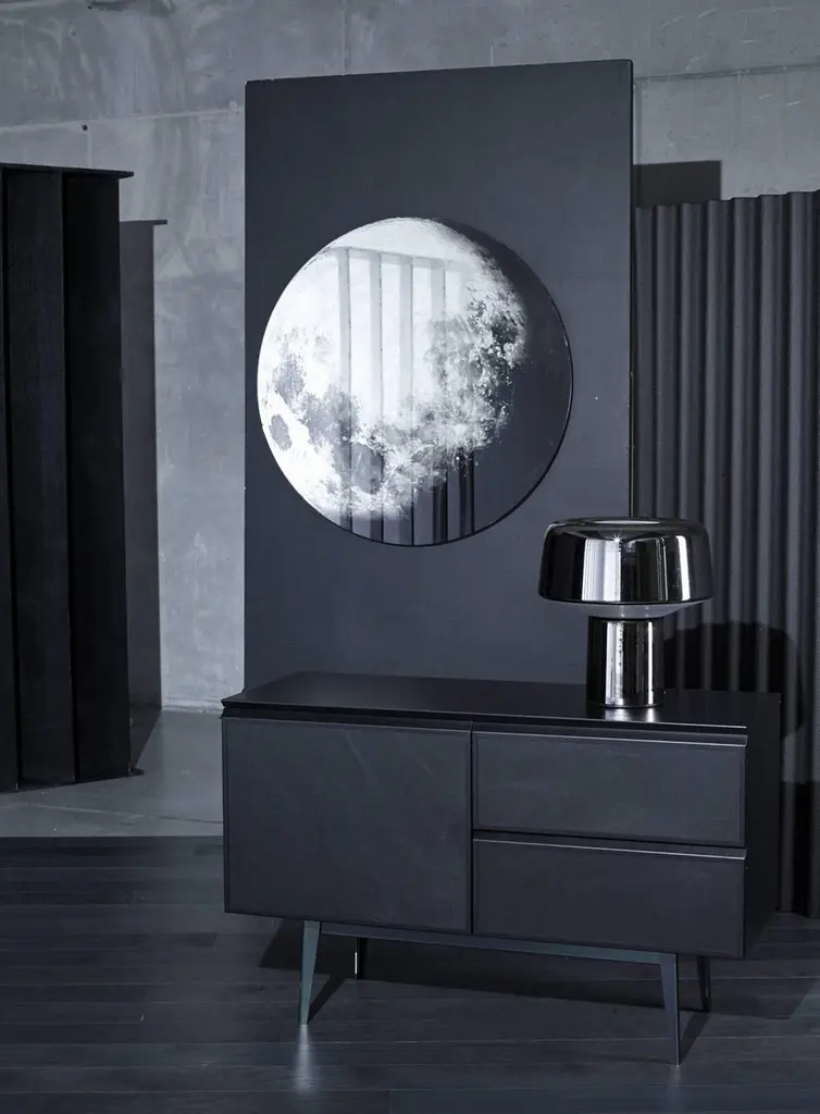 "My Moon My Mirror" is a round wall mirror, designed by Diesel Creative Team and manufactured by Moroso, featuring a tempered glass mirror silvered and with a picture of the moon printed by silkscreen.Glass mirror is provided with safety film.Dimensions:Ø 39.4", H. 0.8"Hanging on the wall or in the centre of the room, "My Moon My Mirror" is your personal piece of the night sky.The moon printed on the mirrored surface combines function and fantasy. Let yourself go and howl at the moon.Moroso, with Diesel, has created a collection of products with a relaxed and comfortable mood, taking its inspiration from an informal lifestyle concept and targeting consumers who like simple shapes yet at the same time seek a “modern” style made up of high quality combined with a distinctive design of pure lines.“We worked with the Diesel creative team to develop an interesting and alternative collection idea which was to represent two different yet coexisting aspects of certain contemporary trends: one which is darker in tone, inspired by the underground world and with a more aggressive and enigmatic aesthetic, and the other lighter, inspired by nature and a visual radiance, with soft and welcoming shapes”, explained Patrizia Moroso who always follows all the phases of every design project personally.