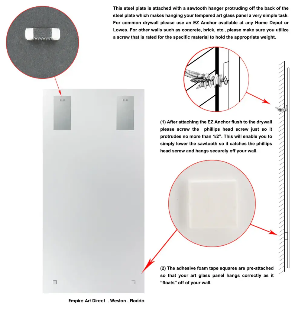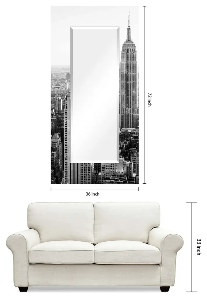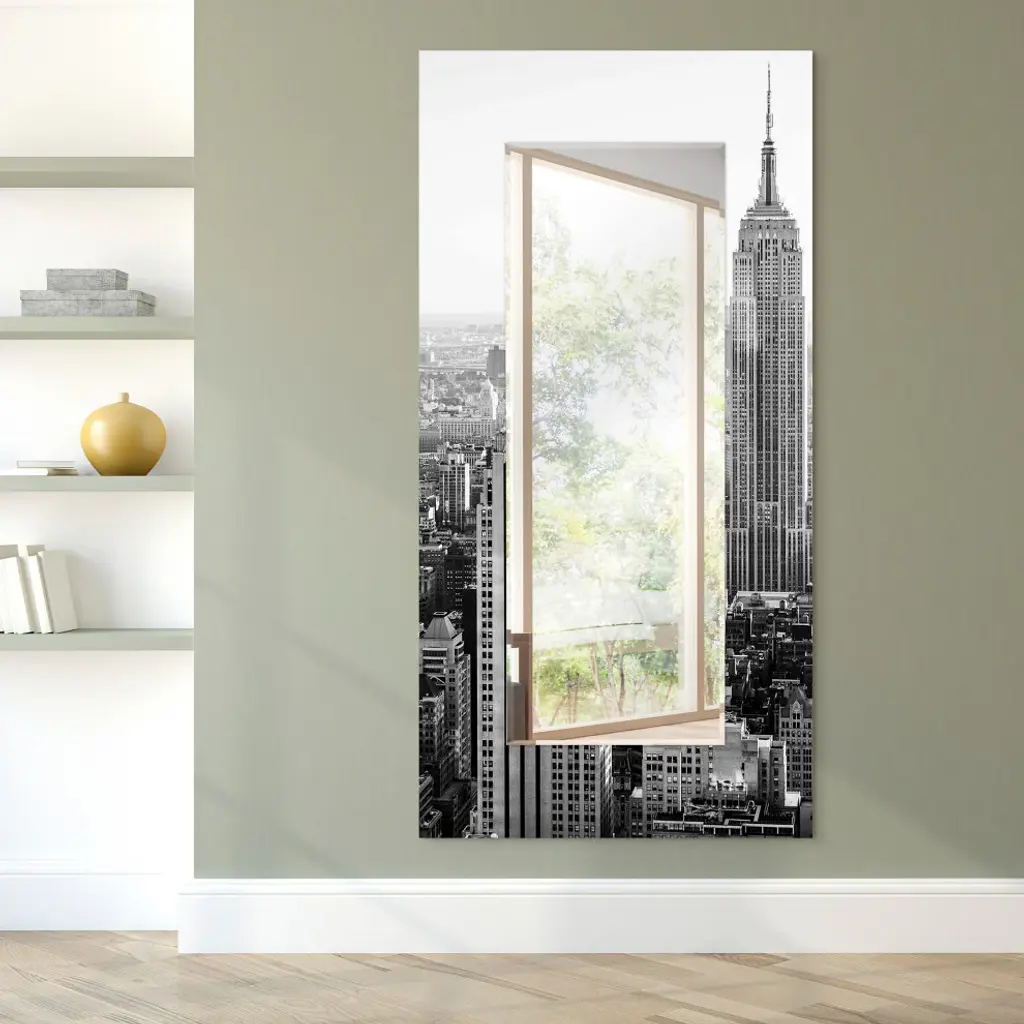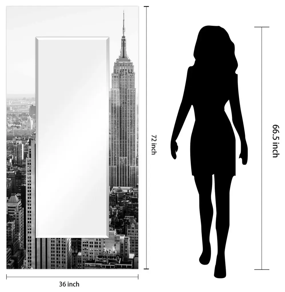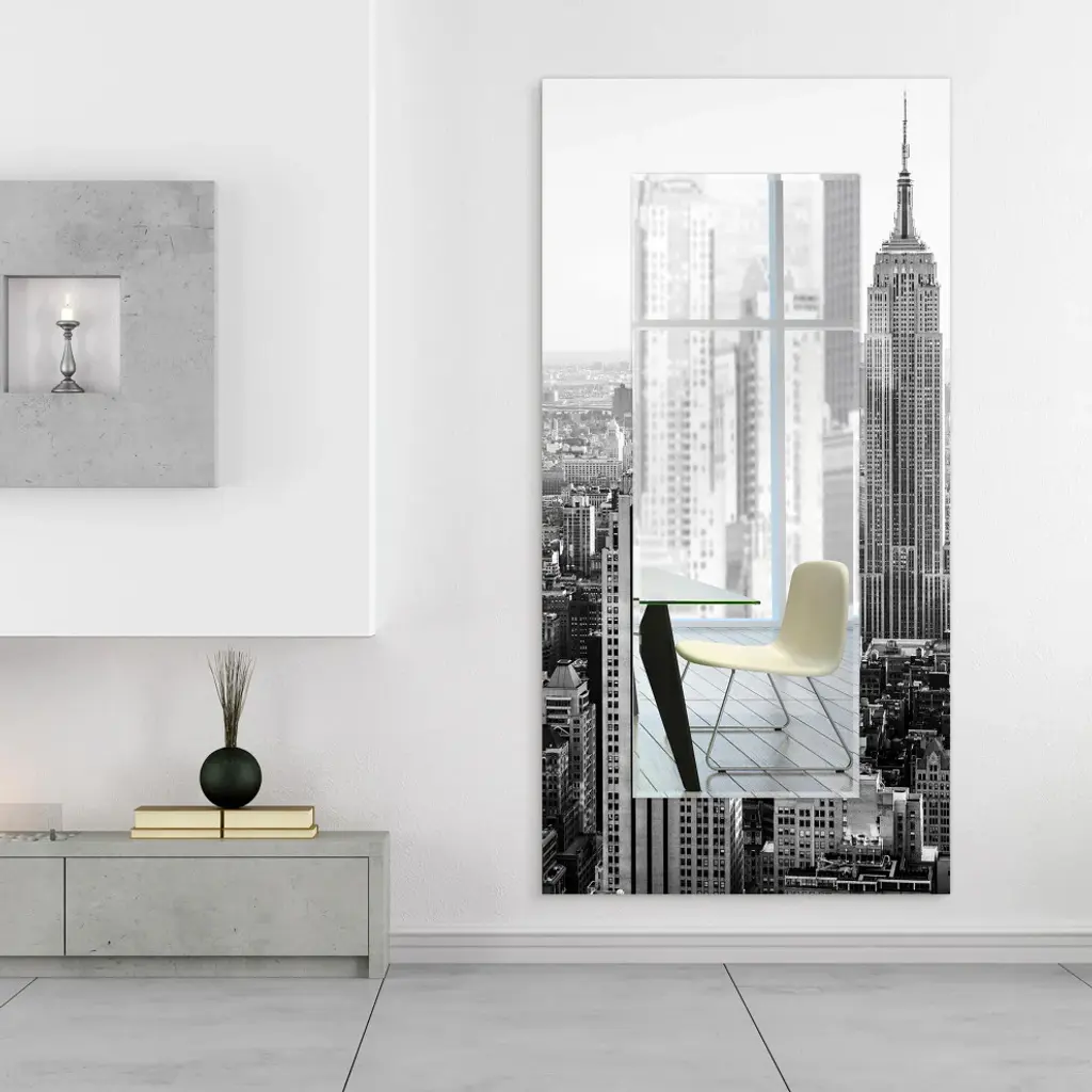 Empire Art Direct"™s collection of printed, frame-less, free floating, tempered glass was inspired by the French technique of Verre Eglomise in which artist''s literally painted the back of clear glass so that when viewed from the front the painting is brought to life under the depth of the glass. This piece of the Empire State Building takes that same tempered glass and displays a beveled mirror in front of it. 2 strong steel hangers are attached to the back of the mirror for a quick and easy vertical installation.