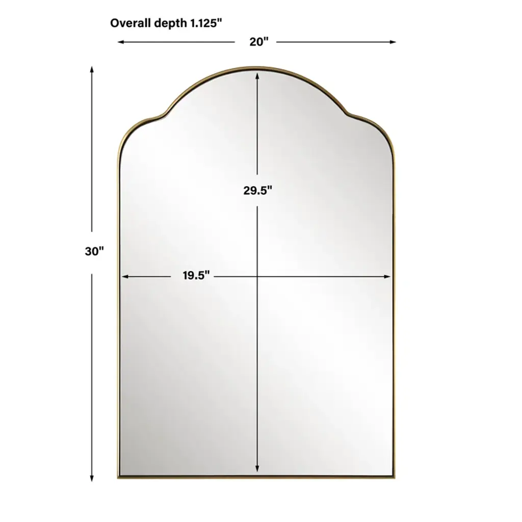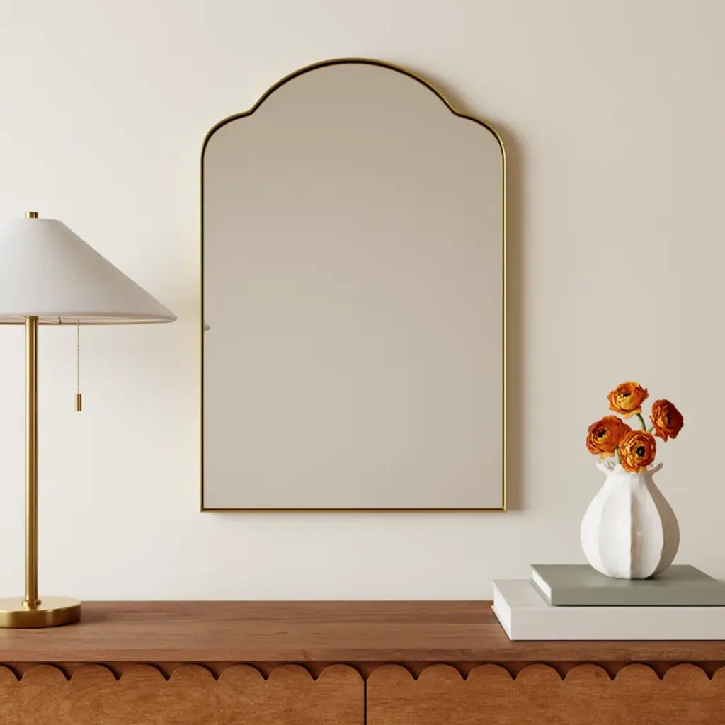 The Naja Arch showcases a gracefully curved silhouette with a plated brushed brass finish over a stainless steel frame, surrounding a floating polished edge mirror.